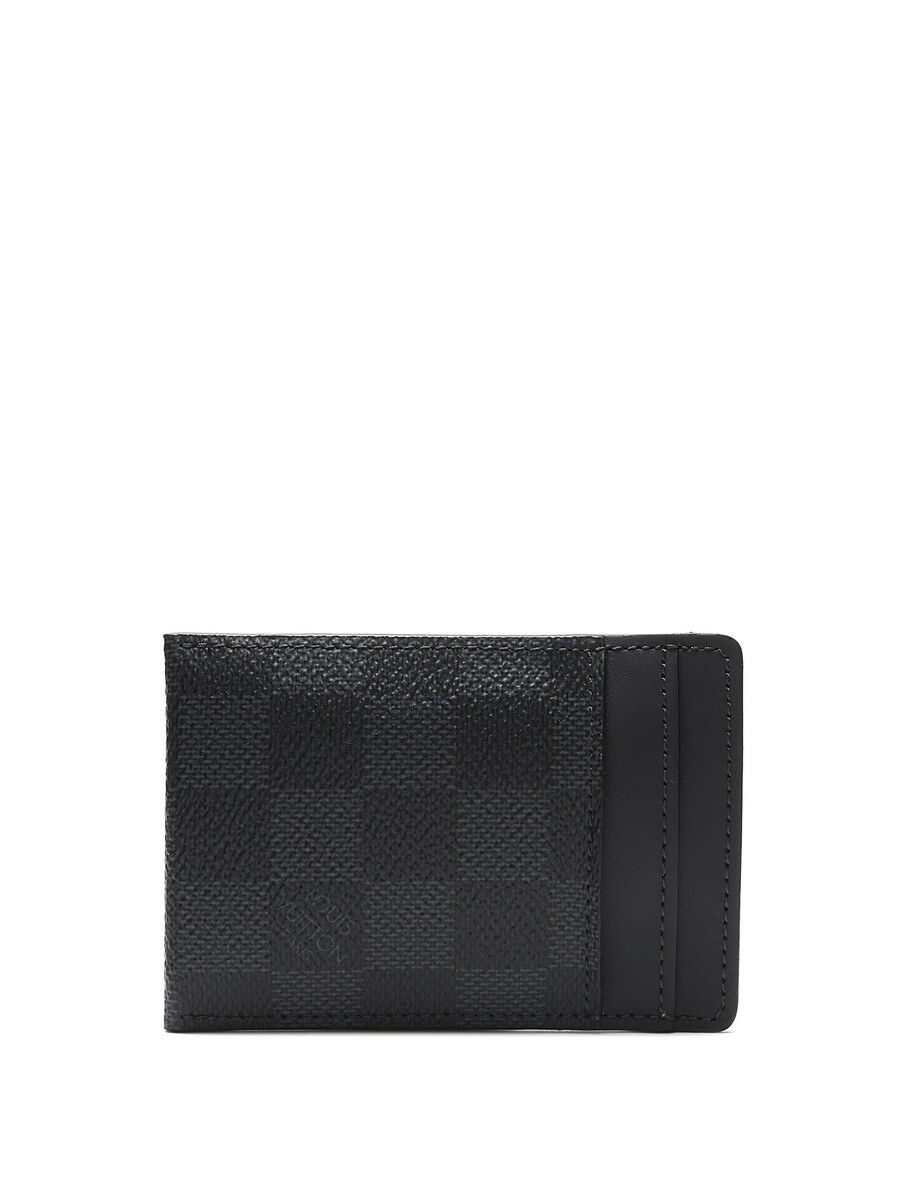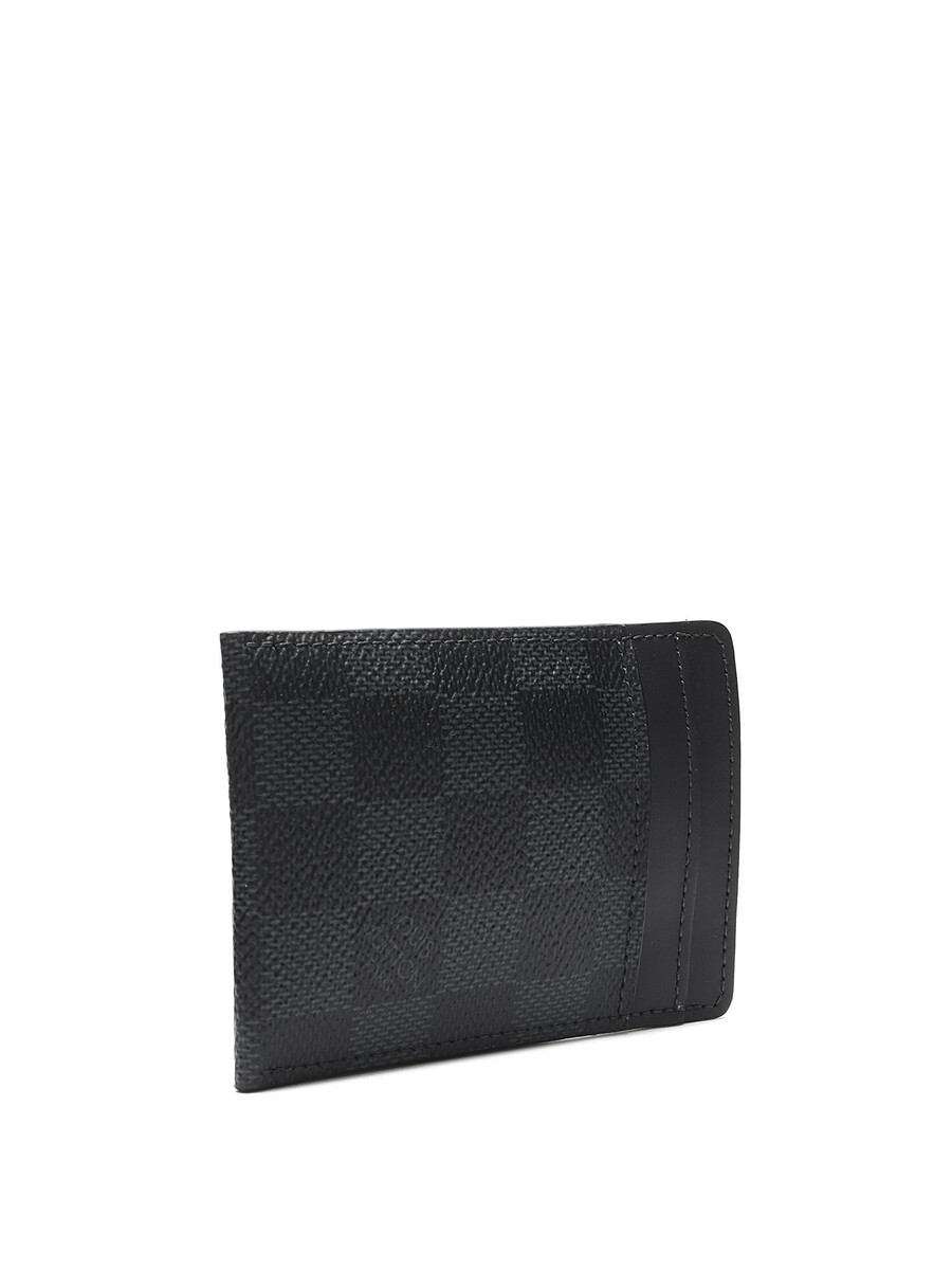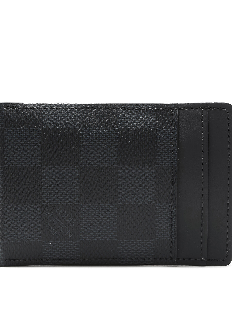Card holder in coated canvas and leather, featuring the iconic Damier Graphite pattern in black. Includes a silver-tone metal clip with an engraved logo, tonal stitching. Comes with dust bag, box, and shopping bag.