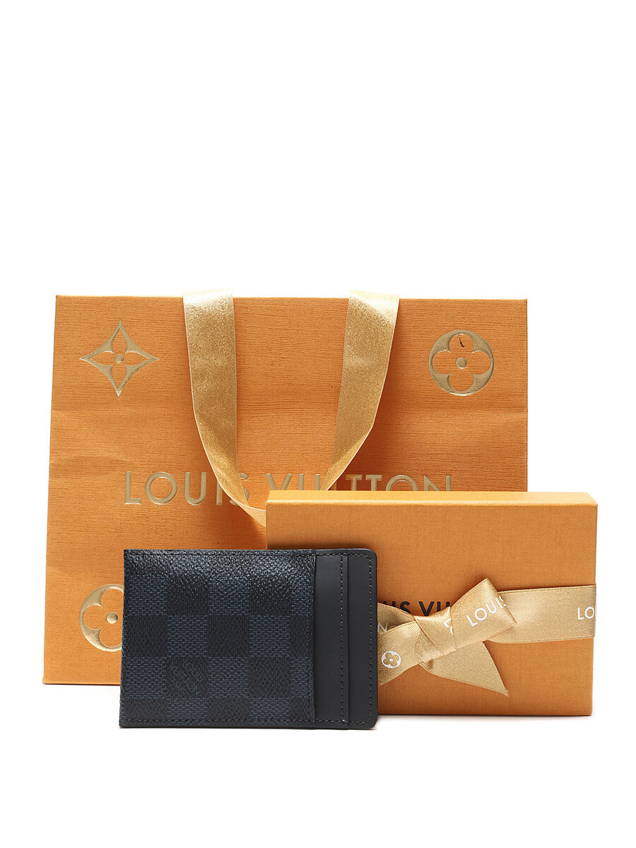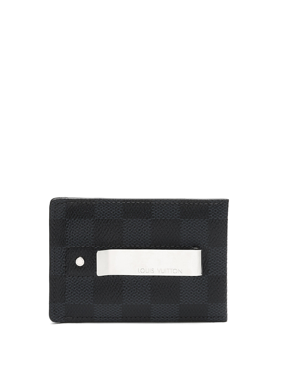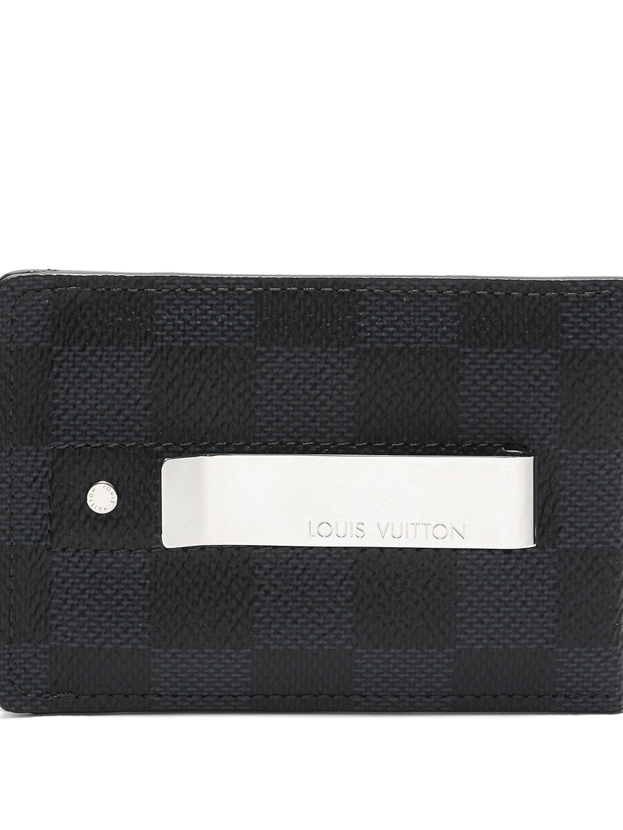 Card holder in coated canvas and leather, featuring the iconic Damier Graphite pattern in black. Includes a silver-tone metal clip with an engraved logo, tonal stitching. Comes with dust bag, box, and shopping bag.