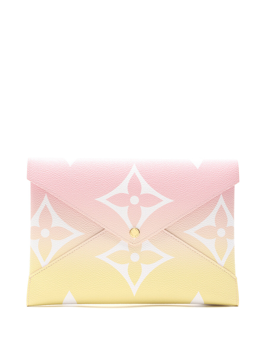 Set of three pouches in coated canvas. Featured in the iconic Monogram gradient in pink, yellow, blue, and brown. Snap closure envelopes flap. Gold-tone hardware. Comes with a dust bag.