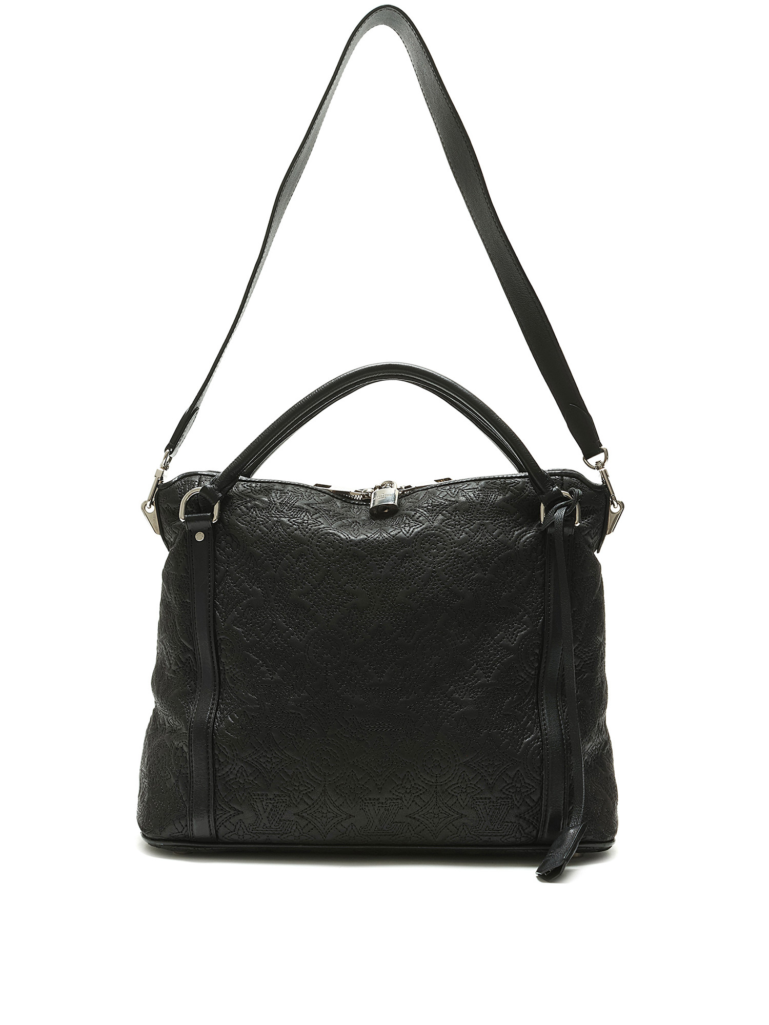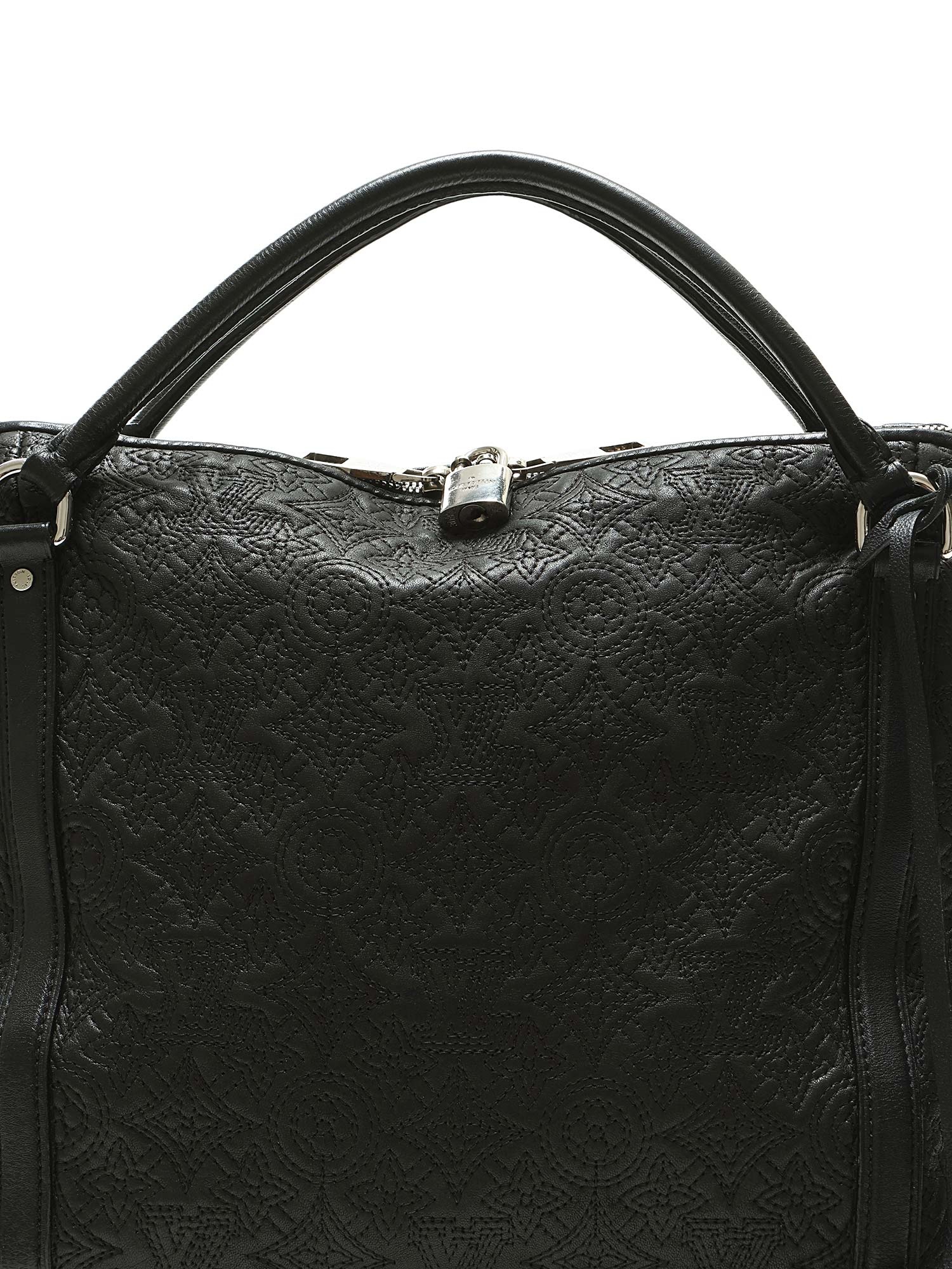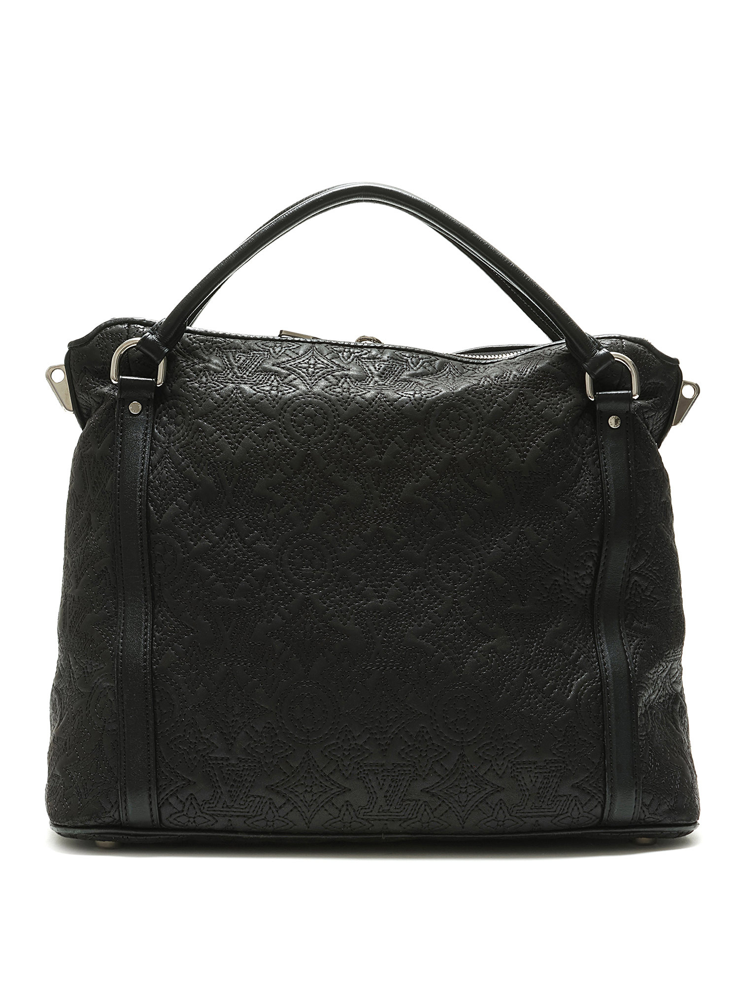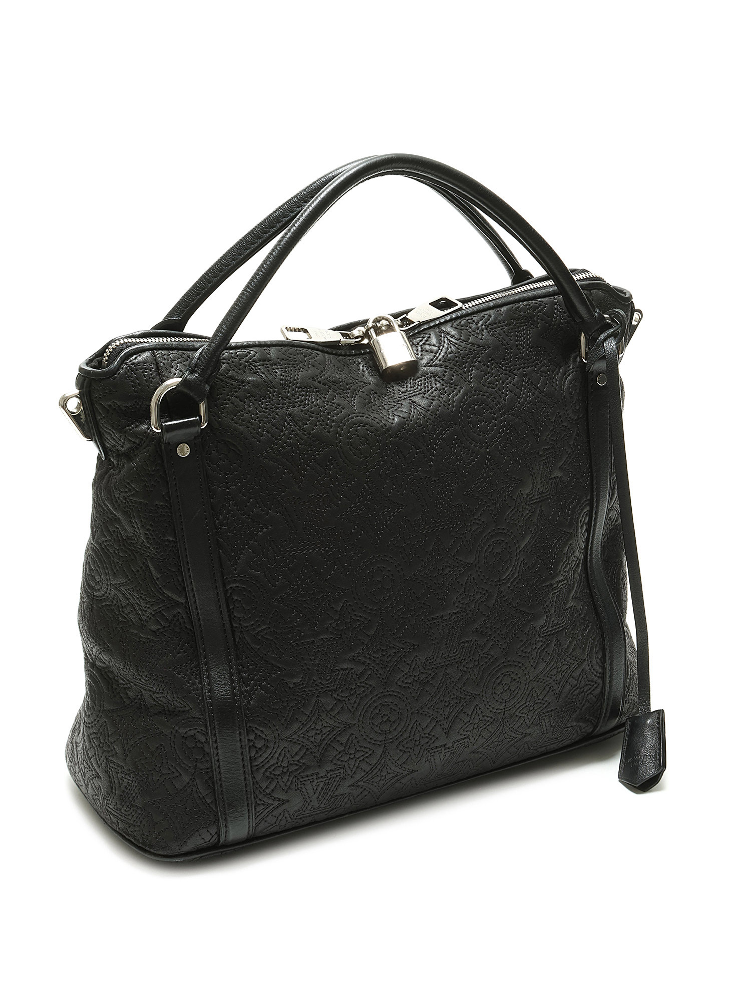Black grained leather tote bag with embossed monogram pattern throughout. Zip closure. Adjustable and detachable strap. Silver-tone hardware. With dust bag.
