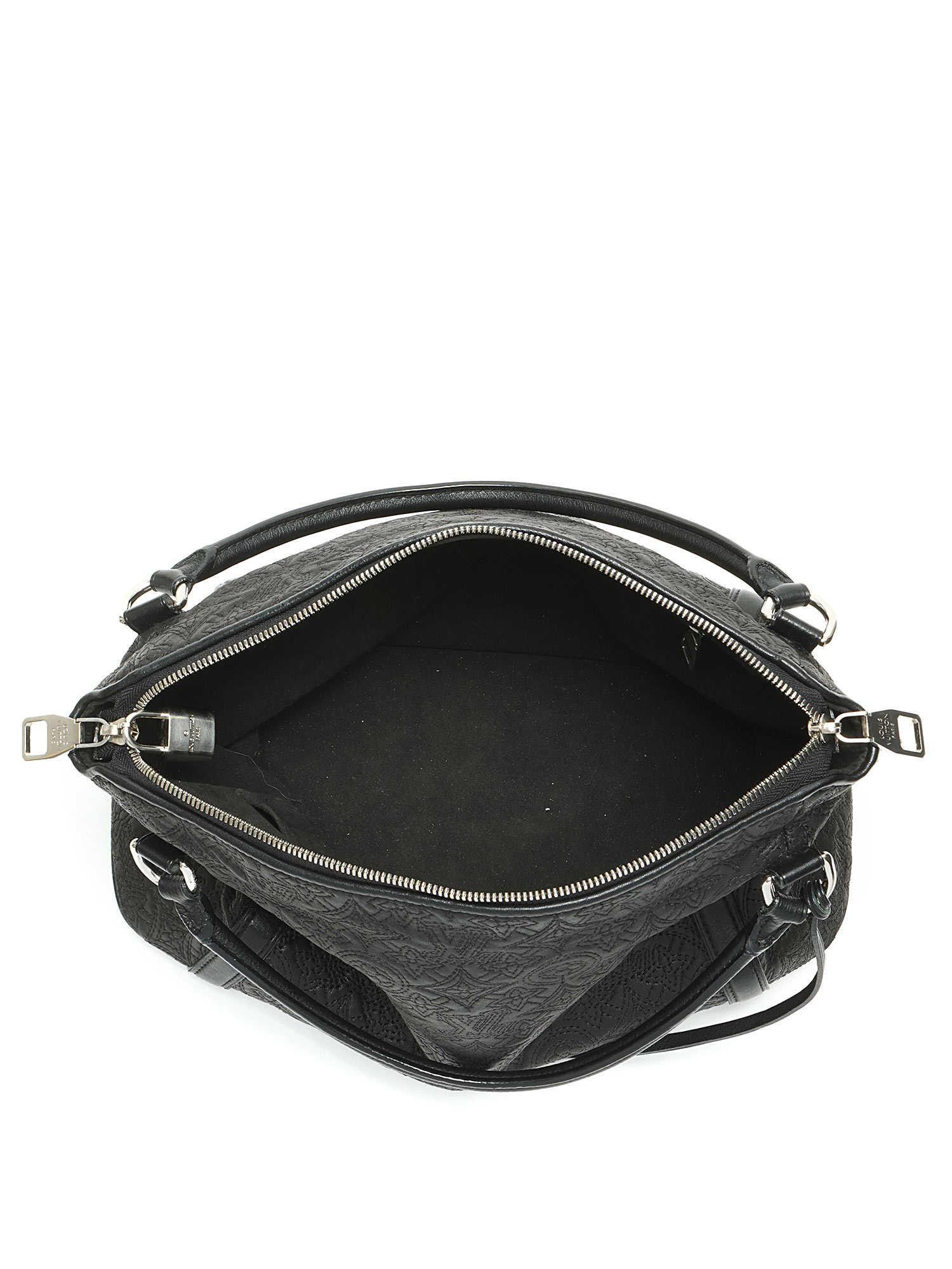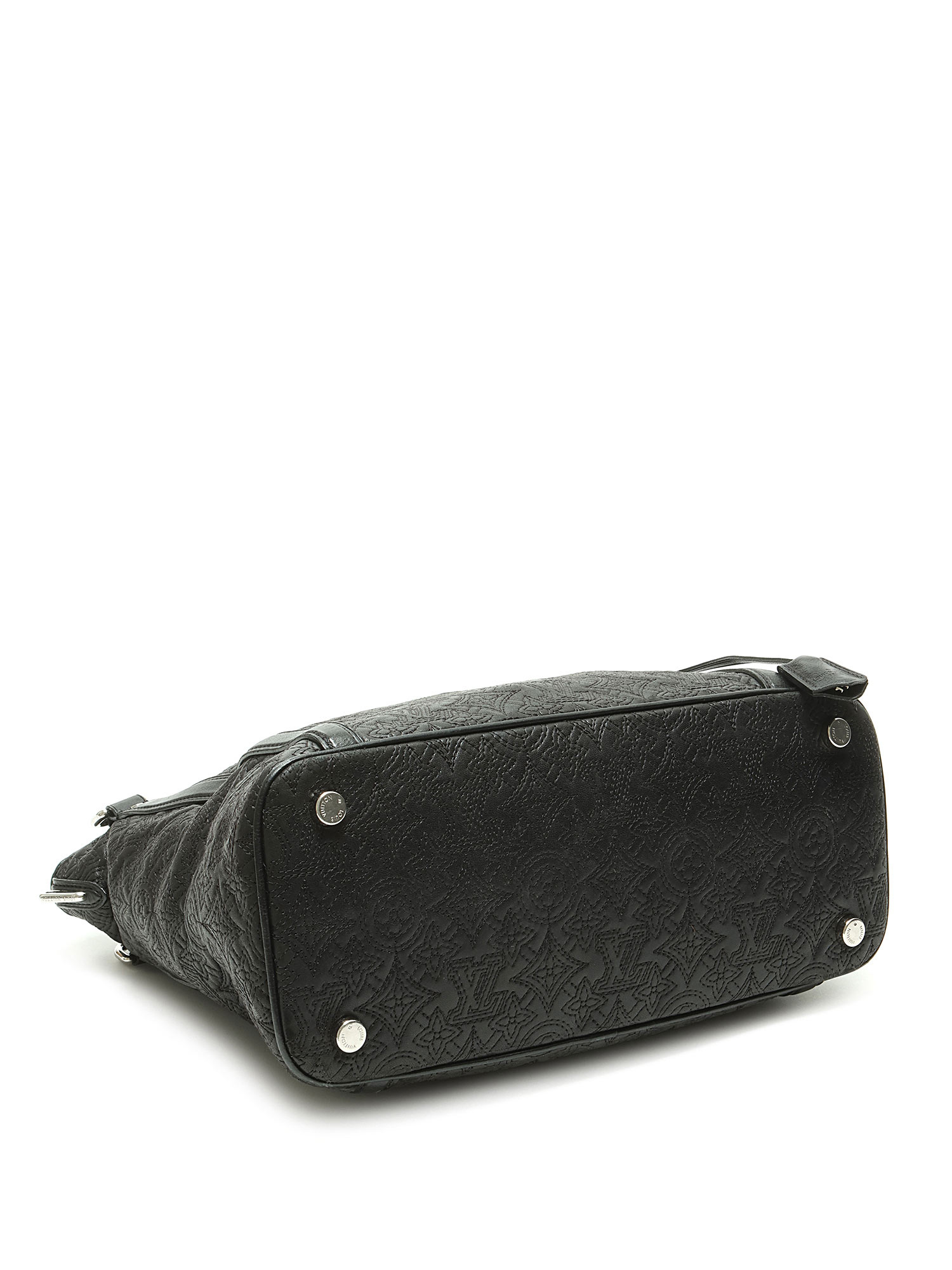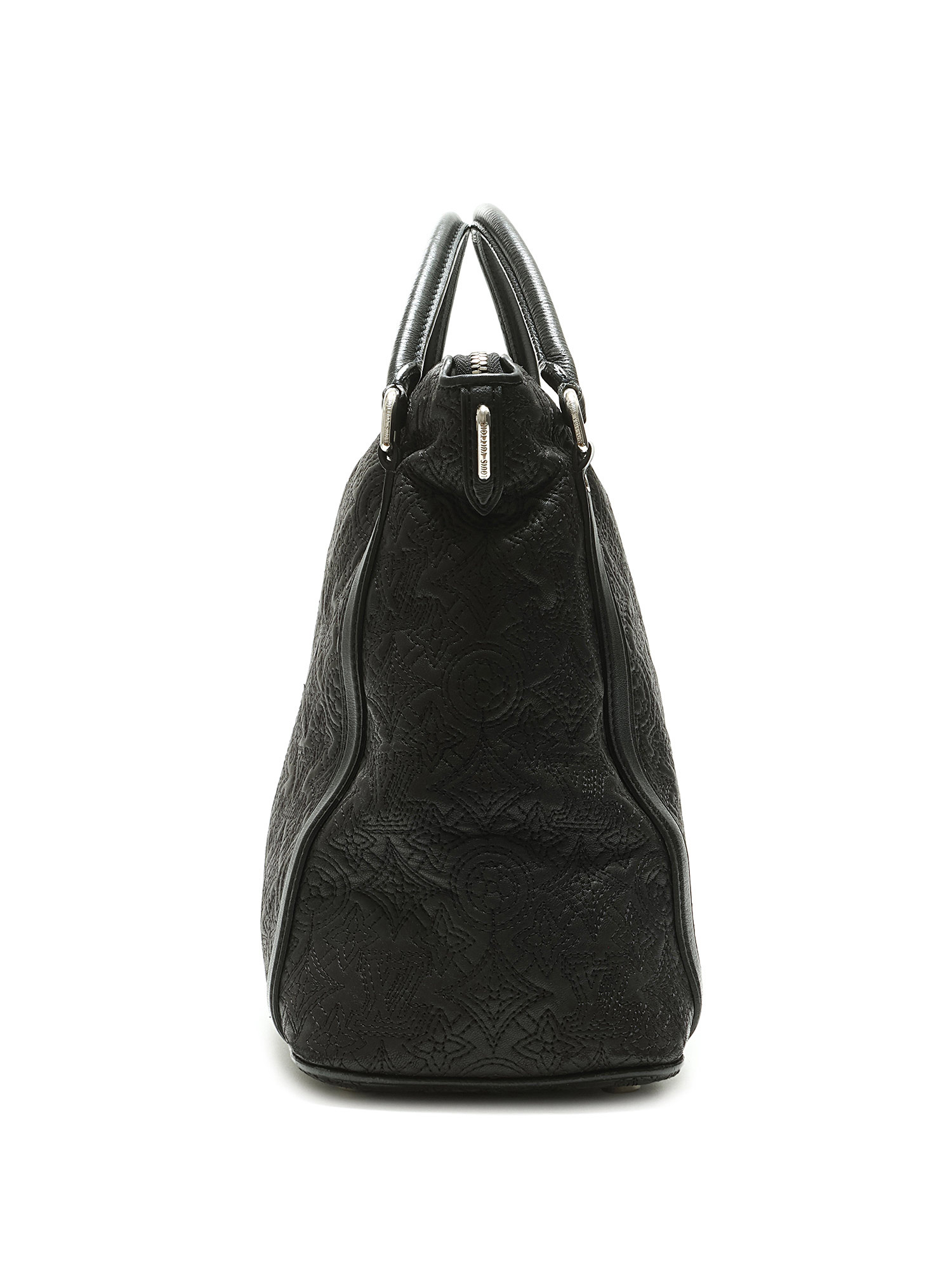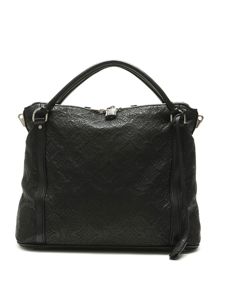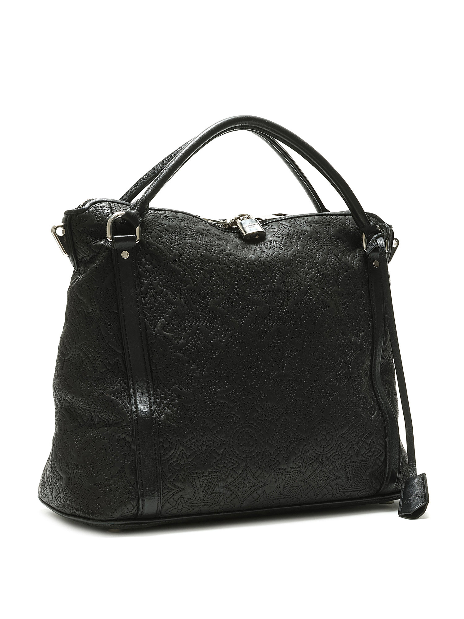 Black grained leather tote bag with embossed monogram pattern throughout. Zip closure. Adjustable and detachable strap. Silver-tone hardware. With dust bag.