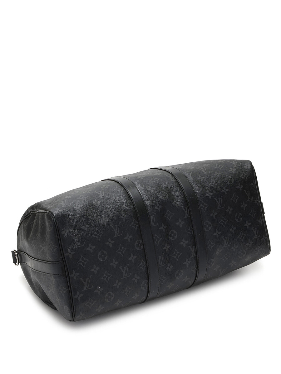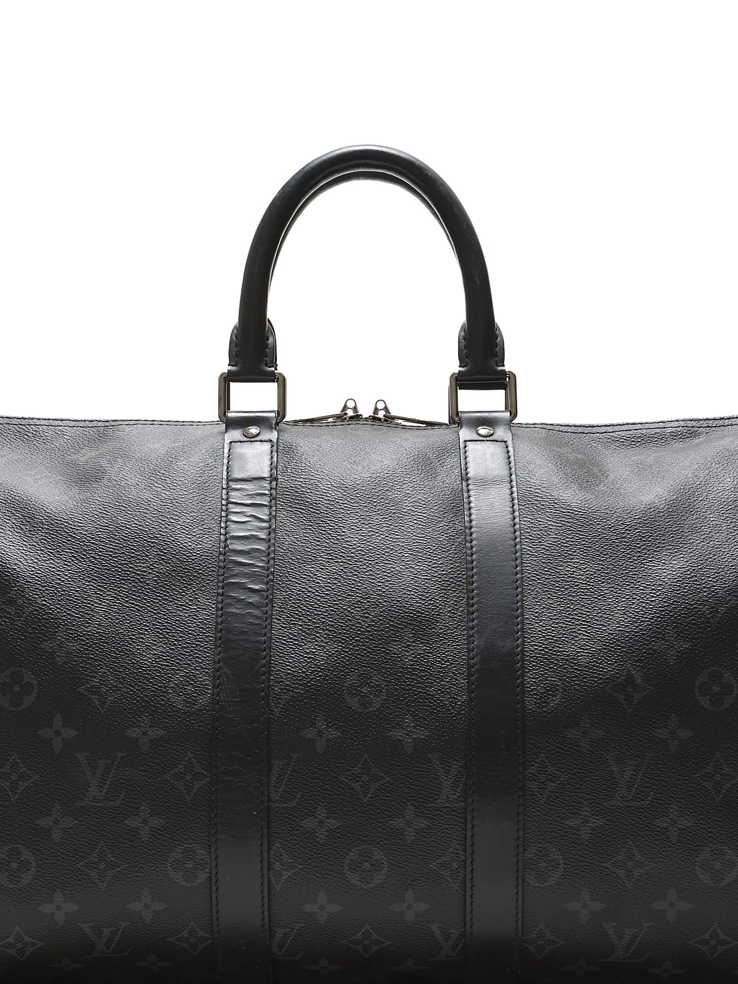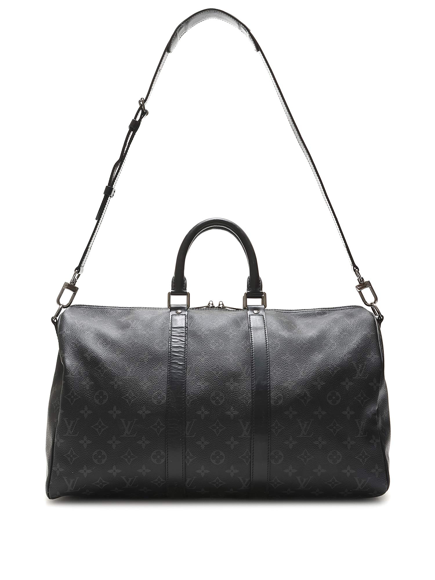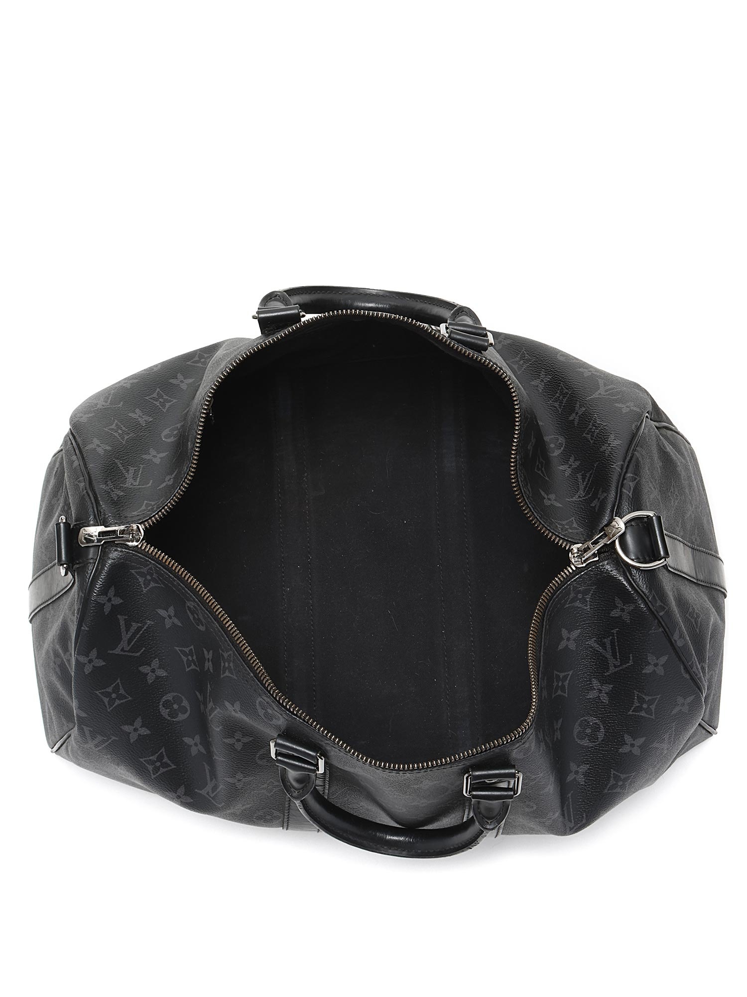 Louis Vuitton coated canvas duffel bag featuring Monogram Eclipse pattern in black. Zipper closure. Leather top handles and an adjustable shoulder strap. Leather trims with silver-tone hardware.