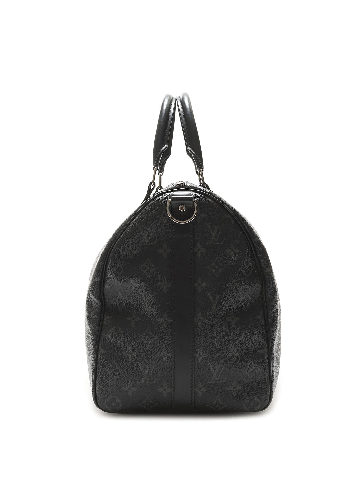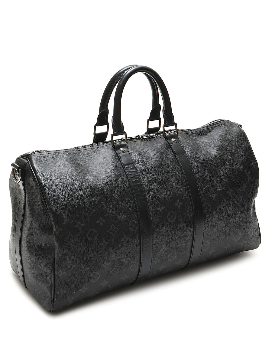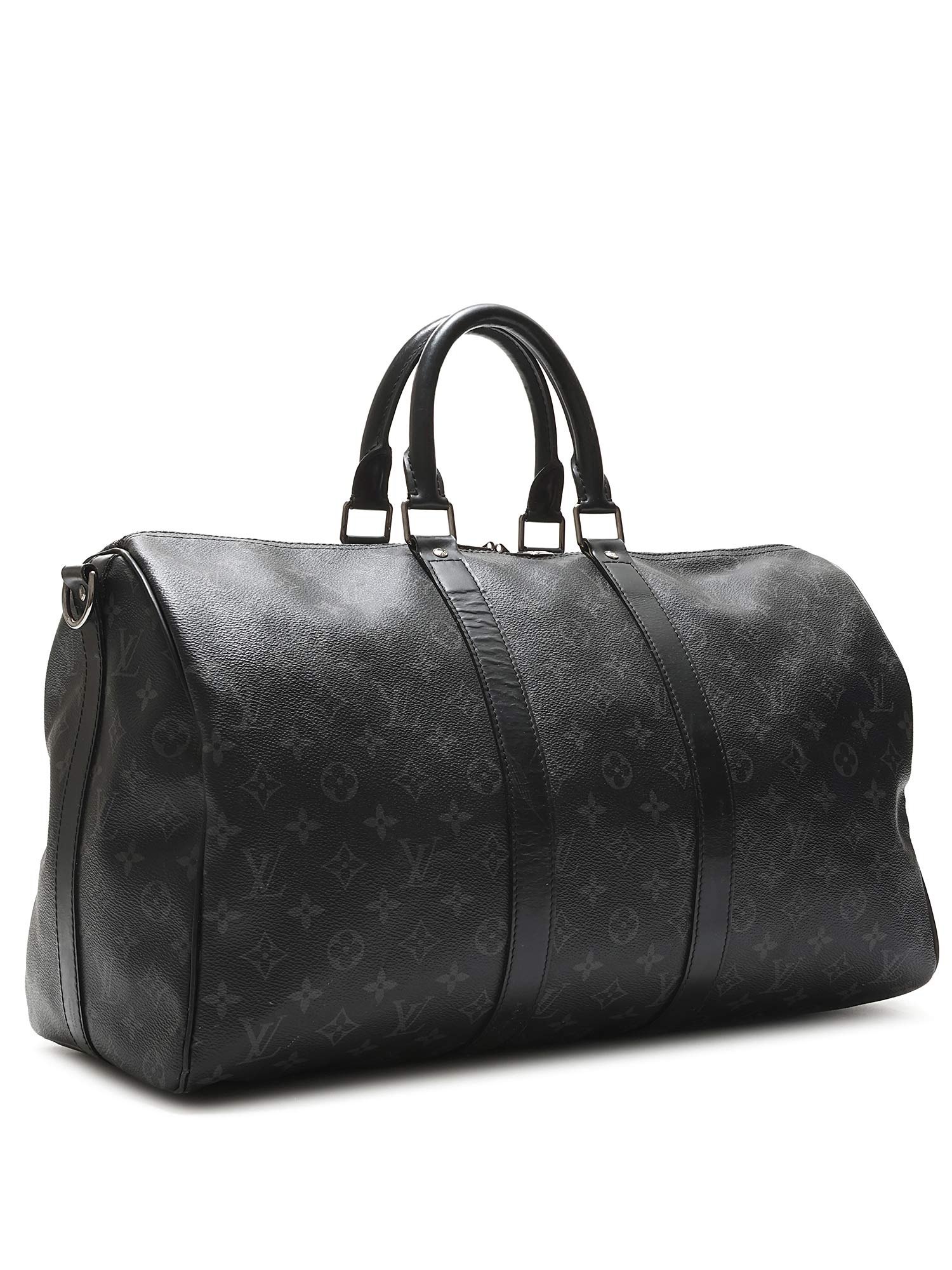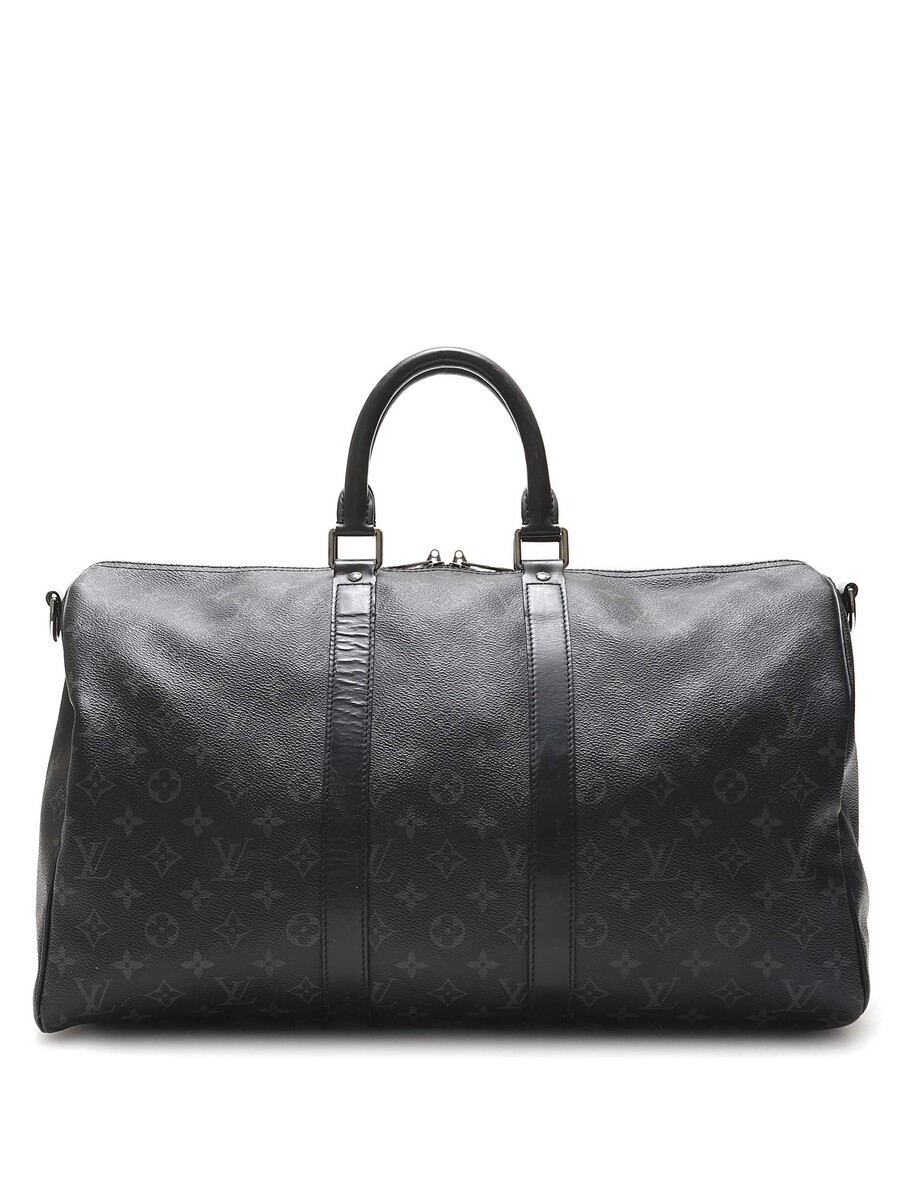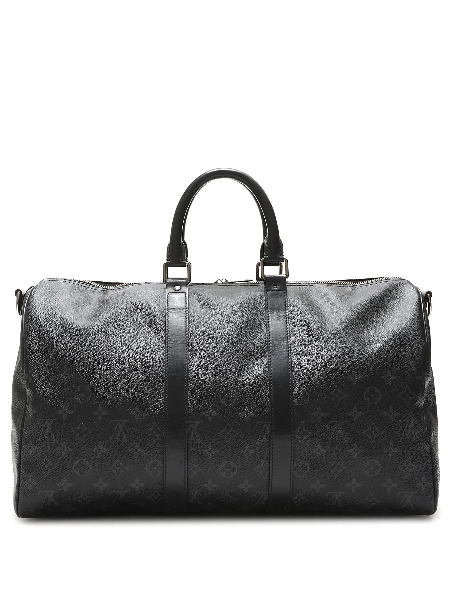 Louis Vuitton coated canvas duffel bag featuring Monogram Eclipse pattern in black. Zipper closure. Leather top handles and an adjustable shoulder strap. Leather trims with silver-tone hardware.