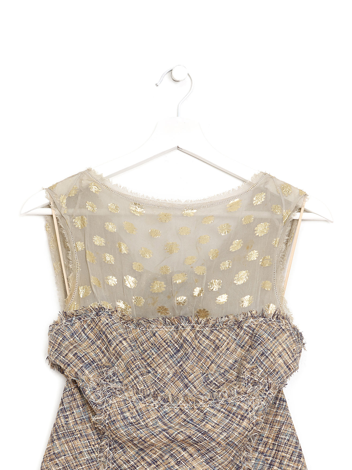 Plaid tweed corset top with polka dot tulle overlay and frayed hem. Back zipper closure. Silk lining.