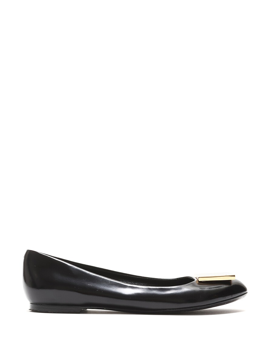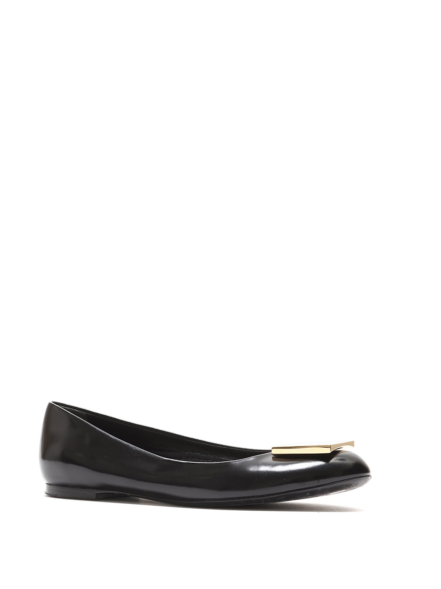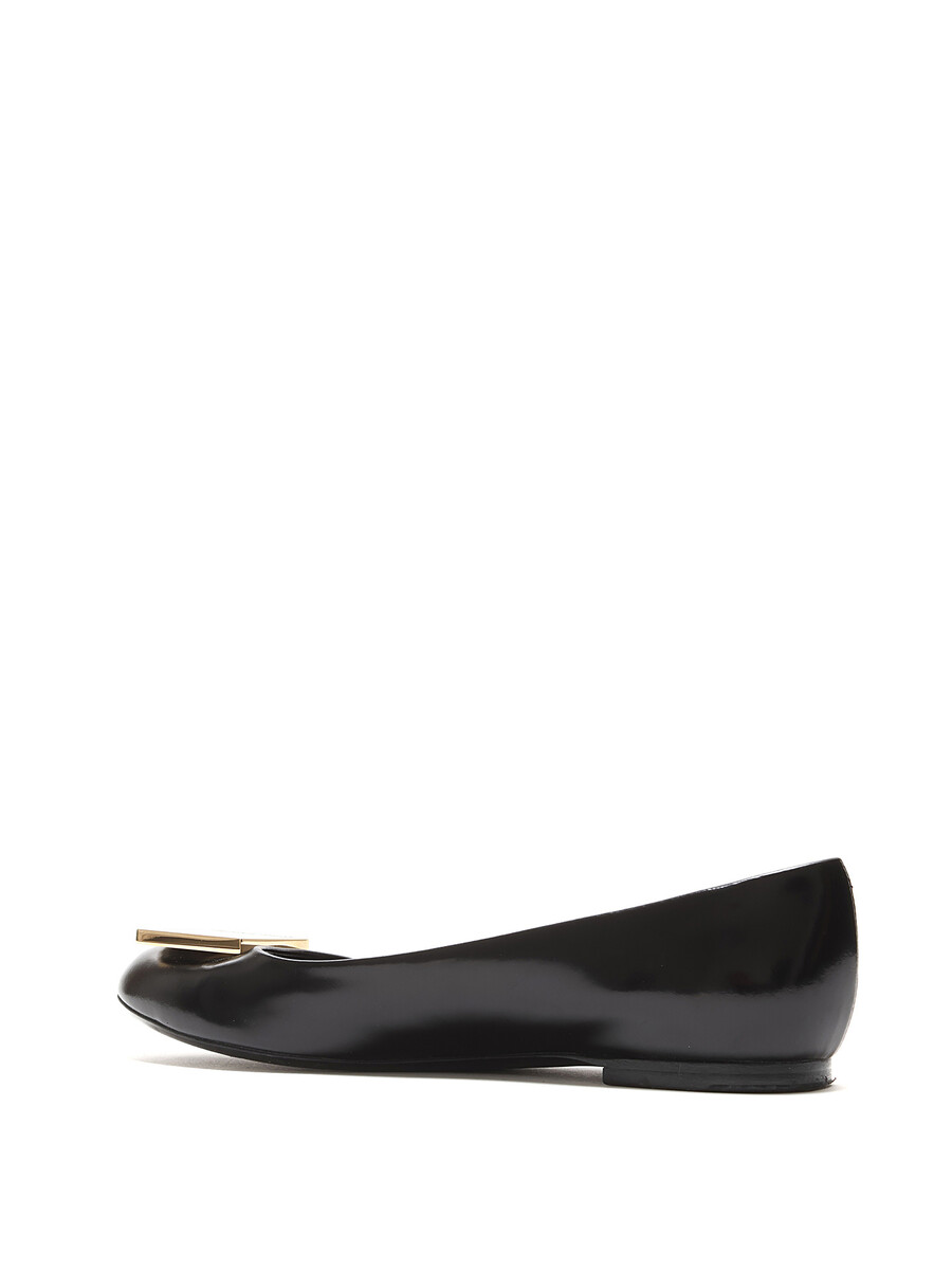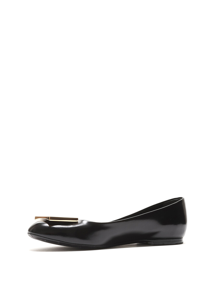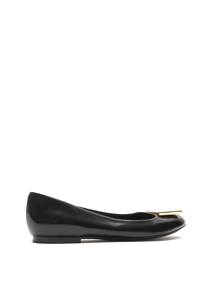 Black leather ballet flats with gold-tone logo plaque. Round toe. Leather sole.