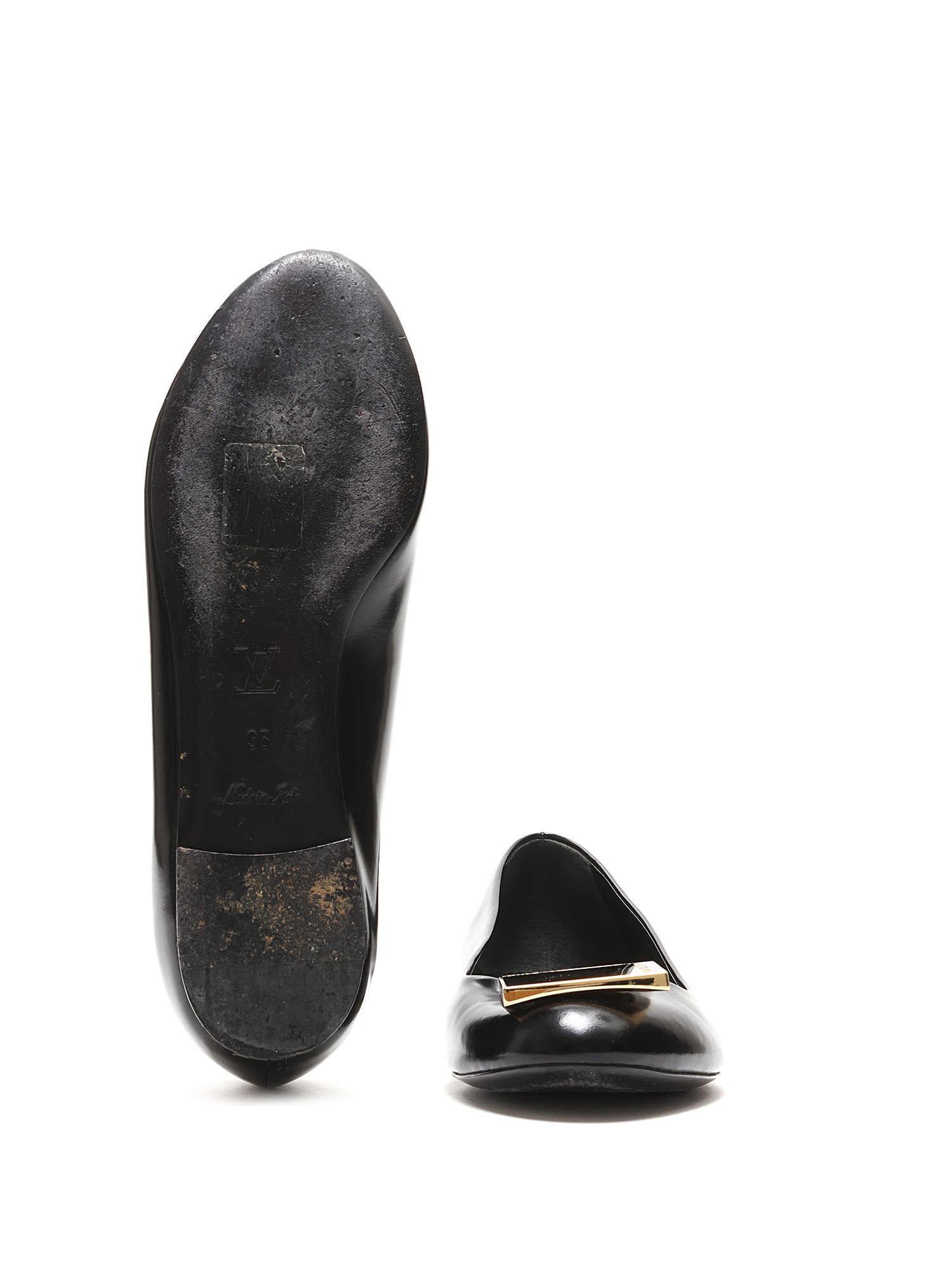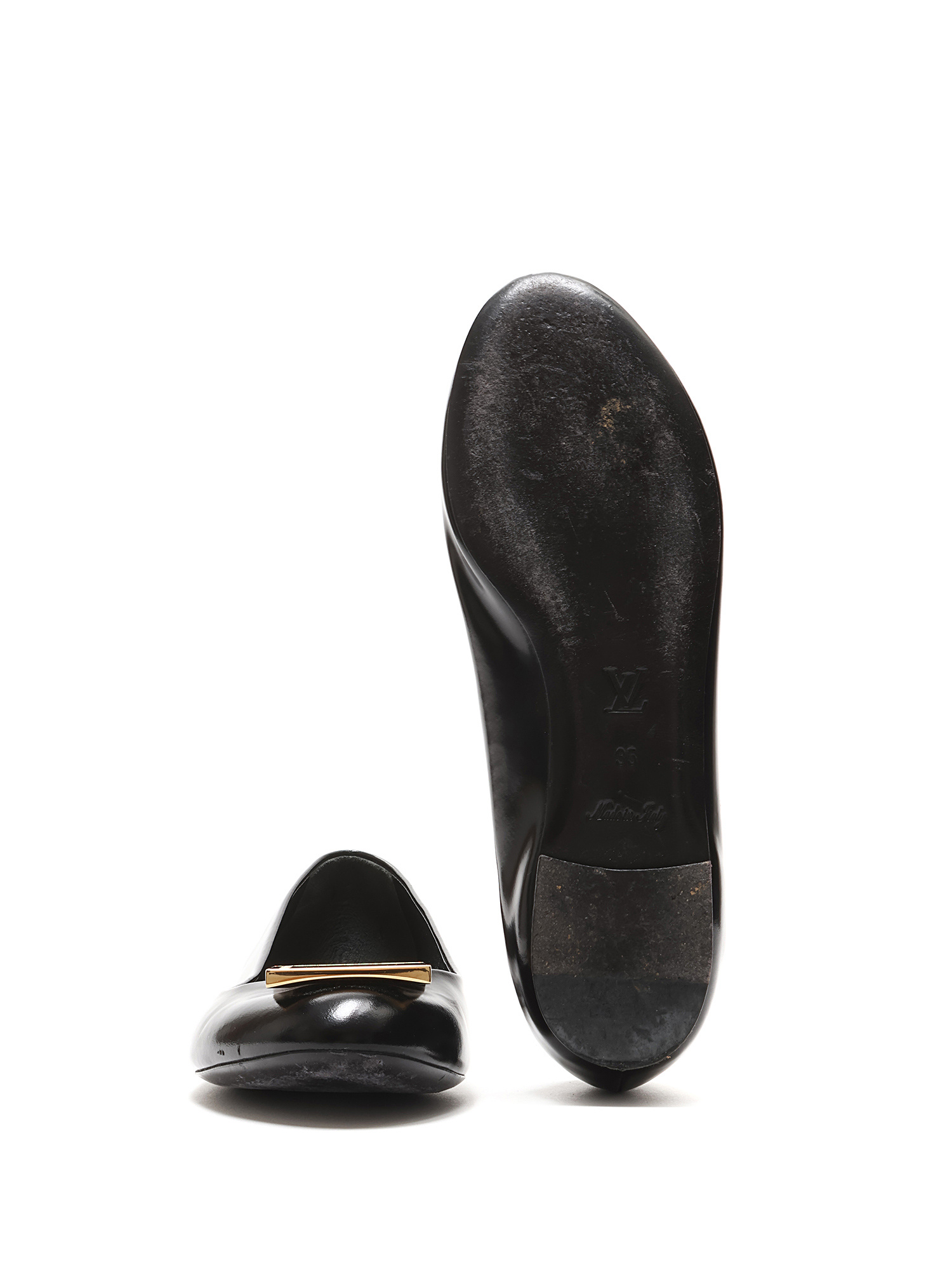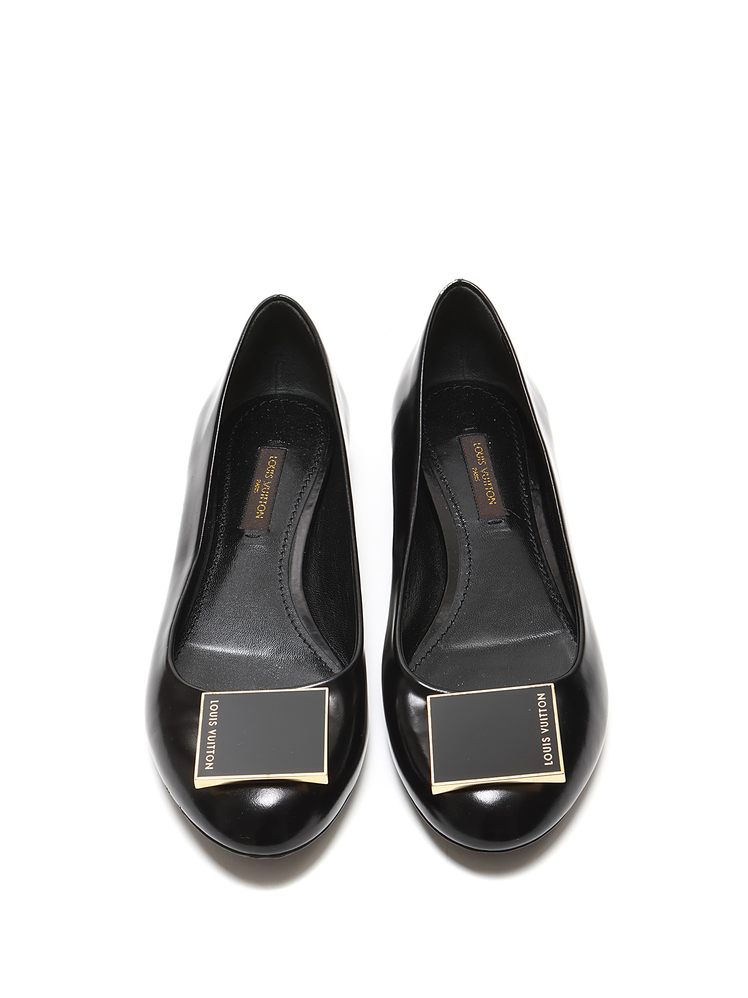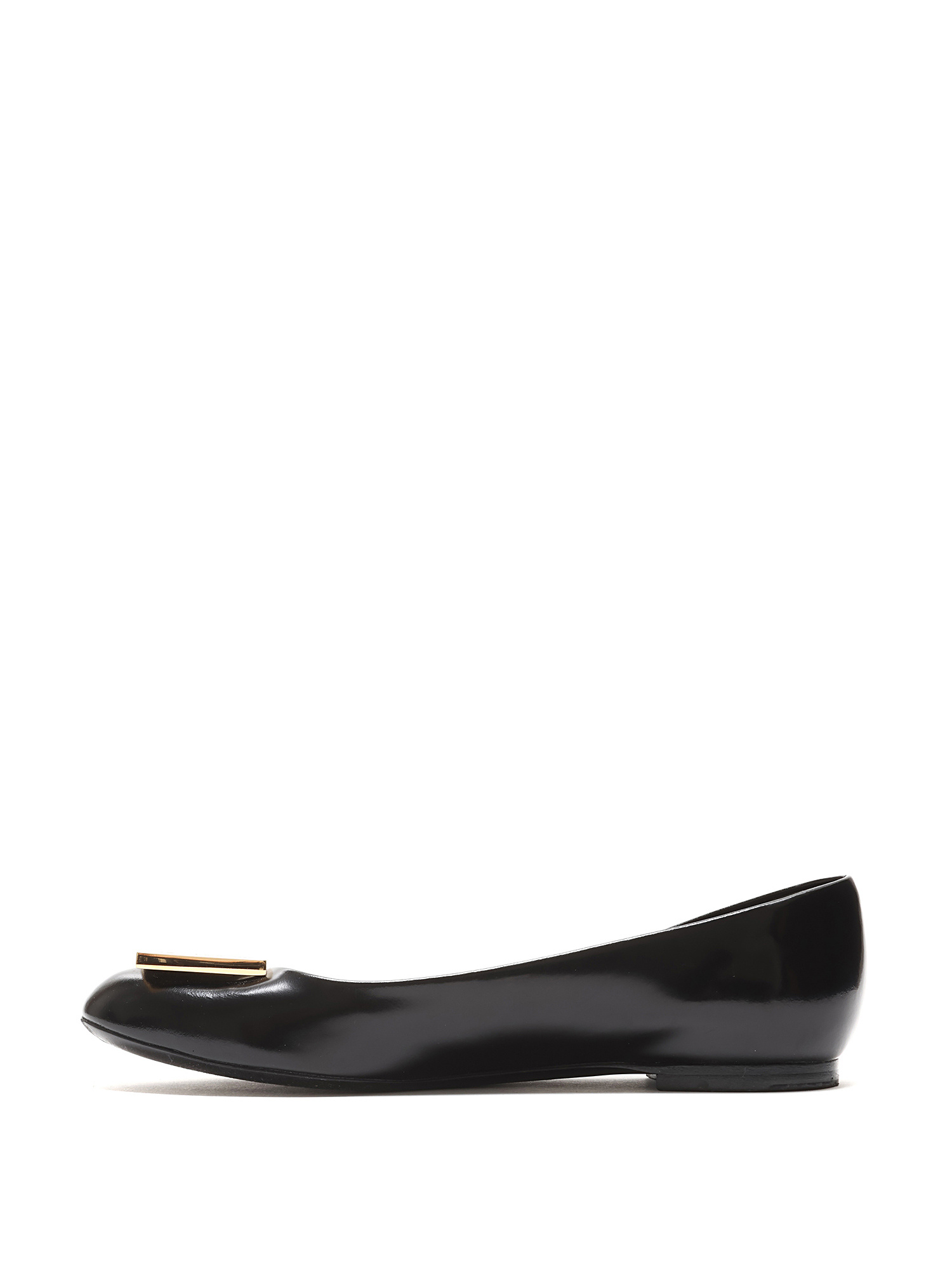 Black leather ballet flats with gold-tone logo plaque. Round toe. Leather sole.