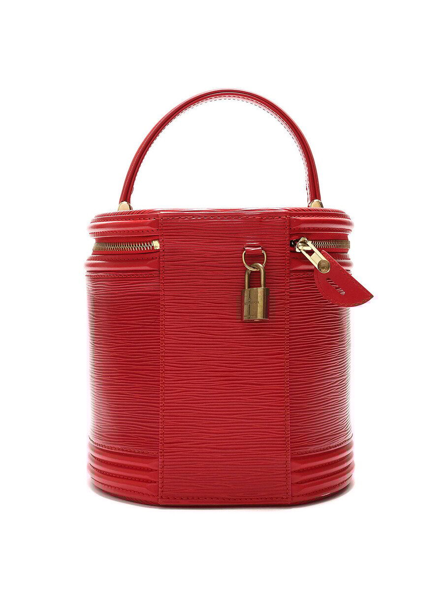Epi red leather bucket bag with a top handle and gold-tone hardware. Secure peripheral zipper closure.