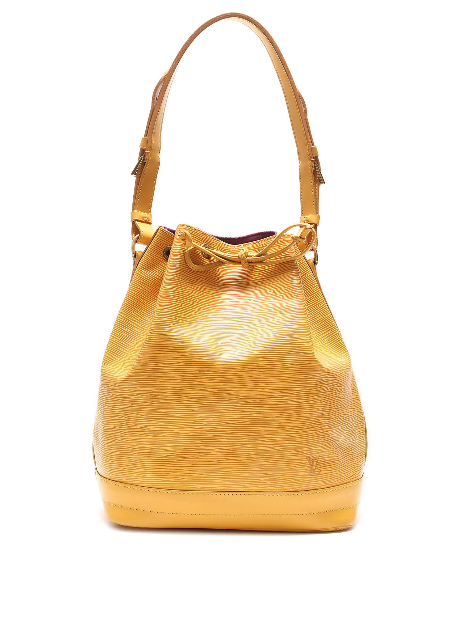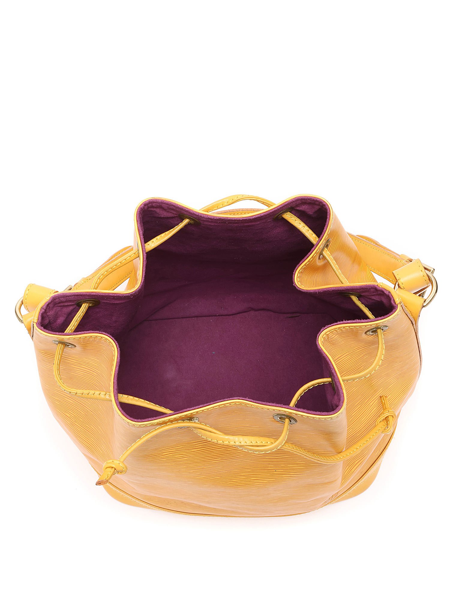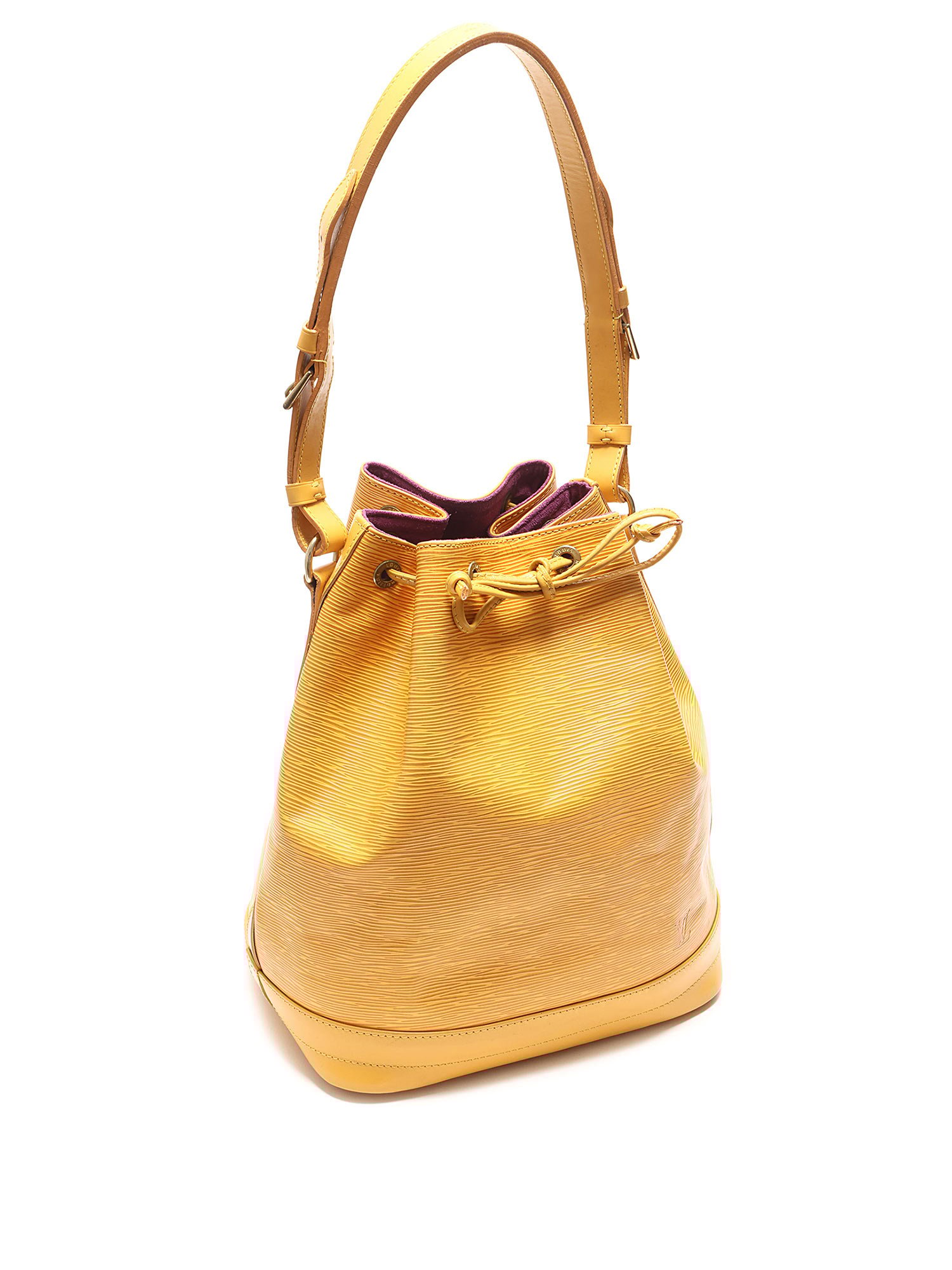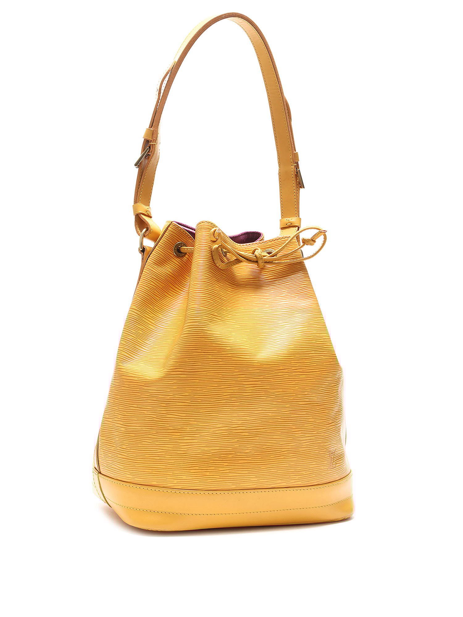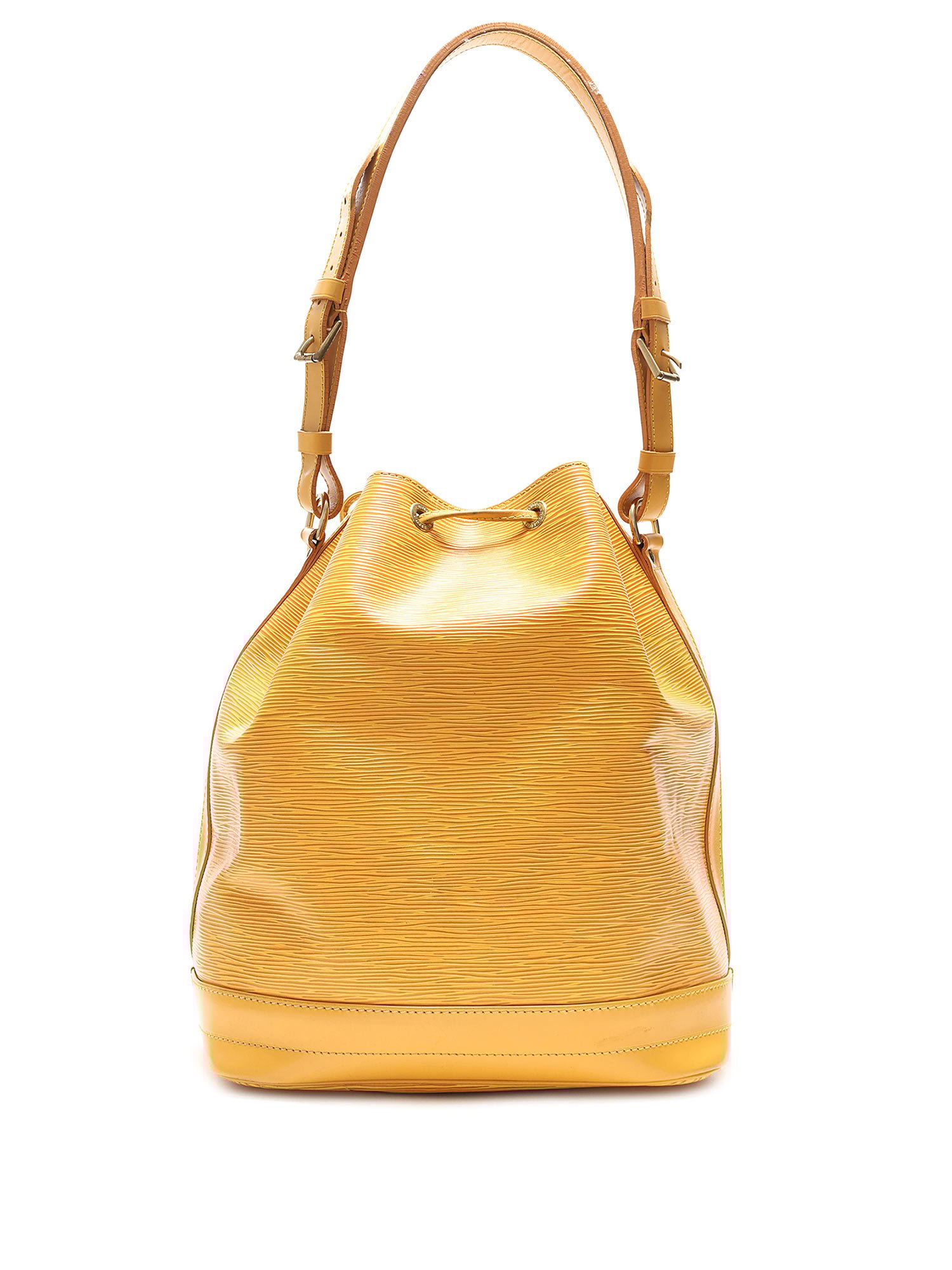 Mustard yellow Epi leather bucket bag featuring a drawstring closure. Adjustable shoulder strap with gold-tone hardware. Leather trim.