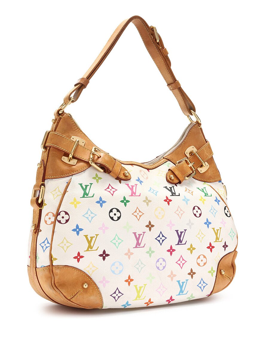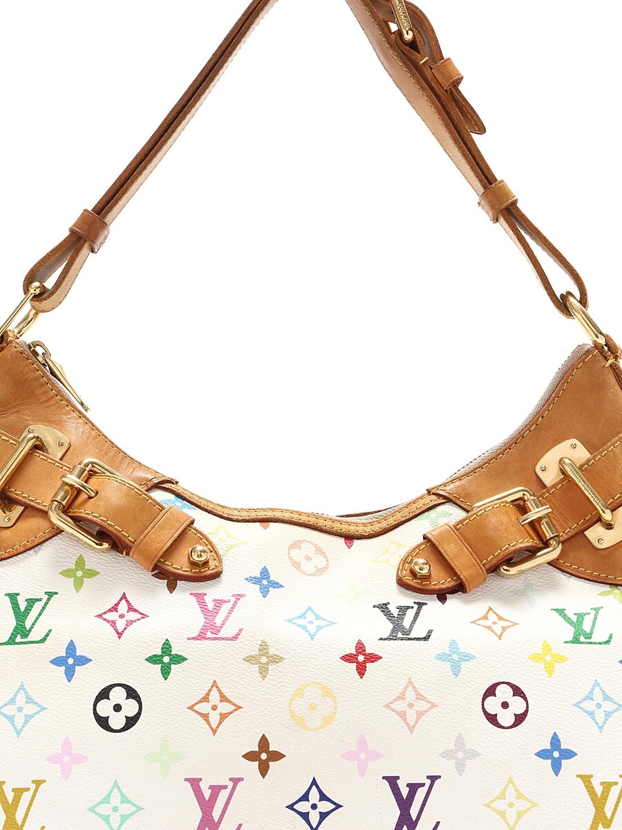 Coated canvas shoulder bag in white with multicolor pattern. Vachetta leather trim. Gold-tone brass hardware. Adjustable leather strap. Zipper closure.