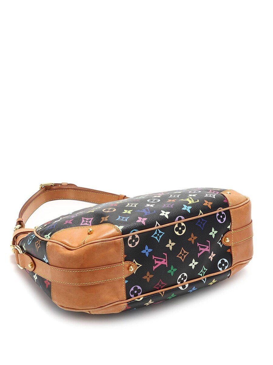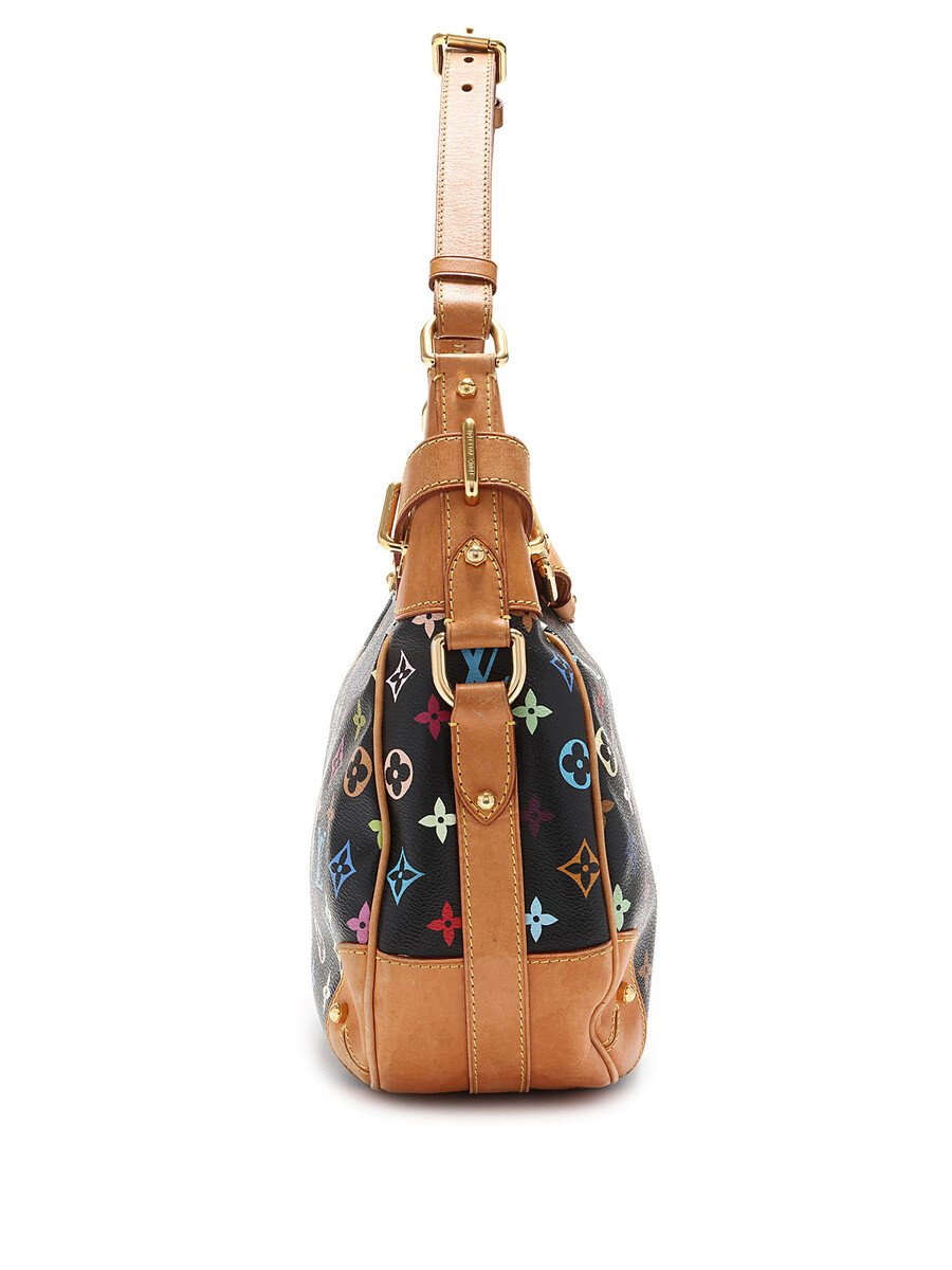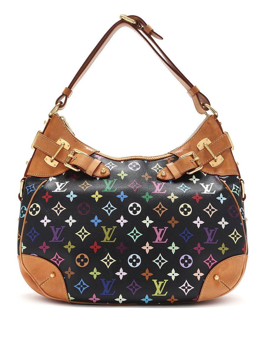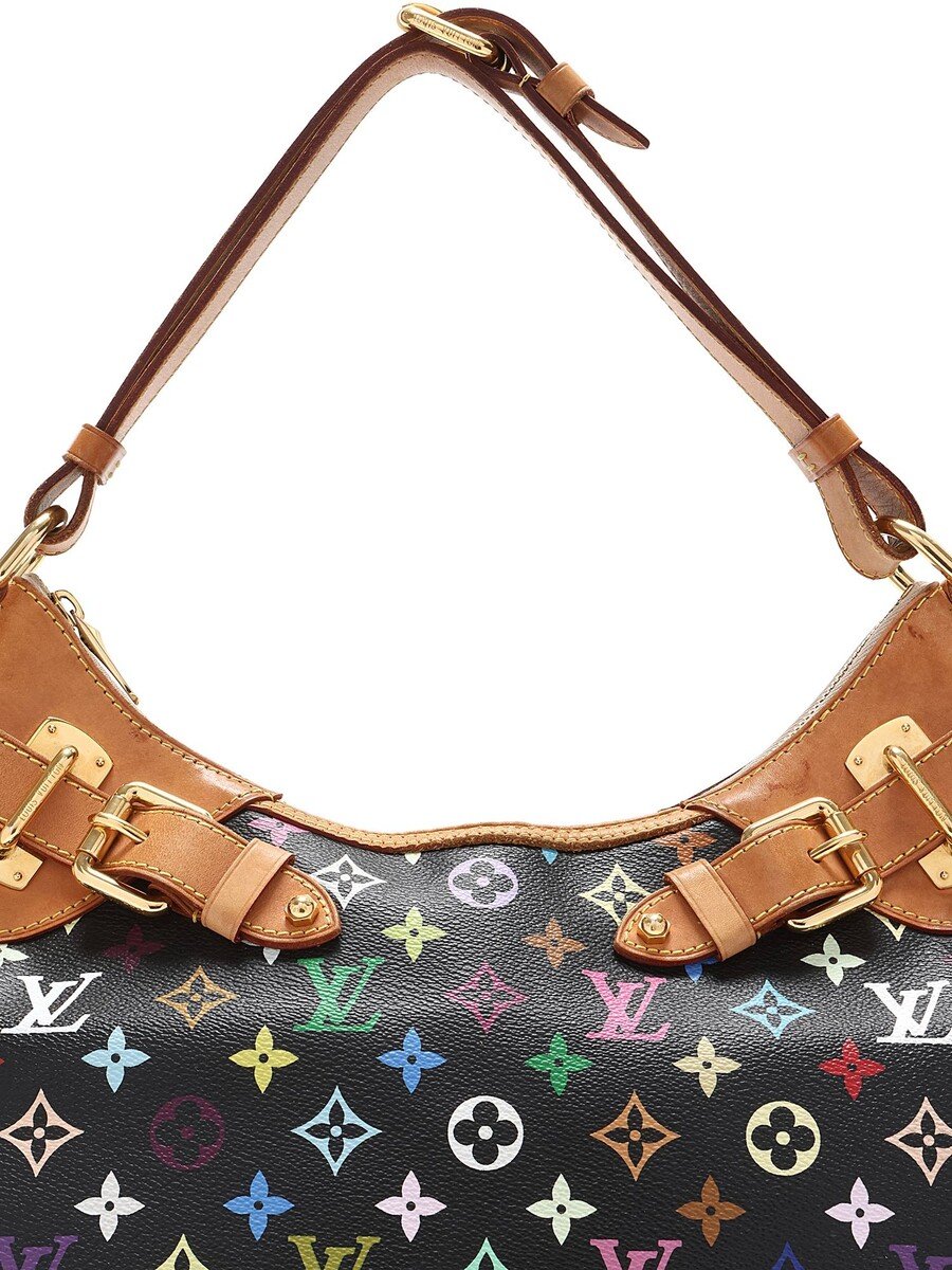 Coated canvas shoulder bag in black and multicolor. Vachetta leather trim. Gold-tone brass hardware. Adjustable leather strap. Zipper closure.