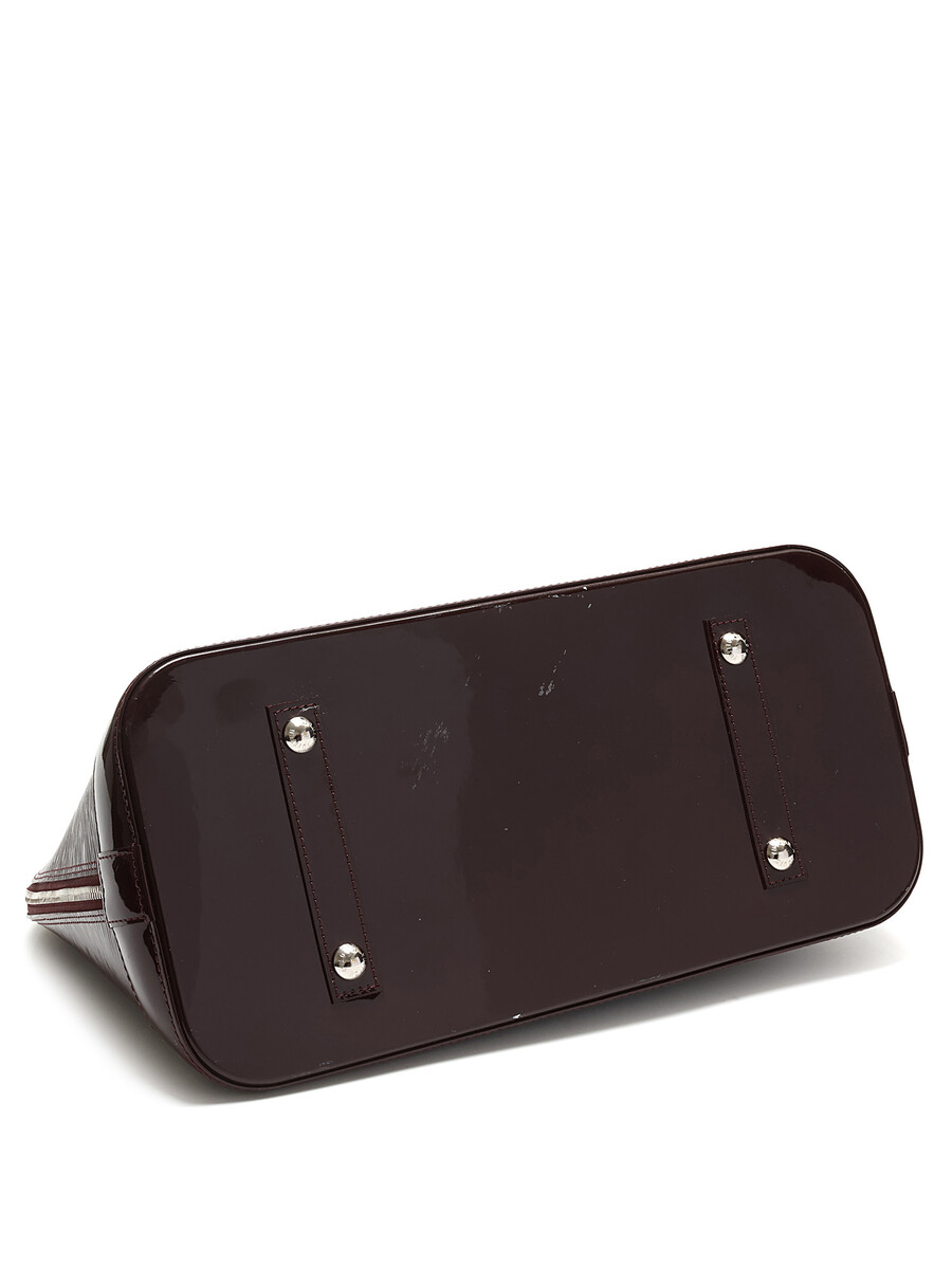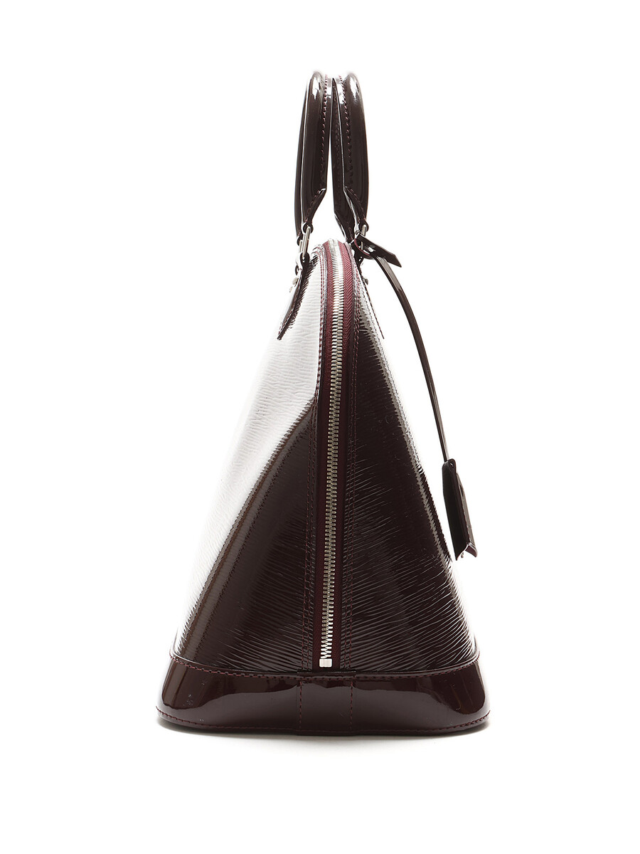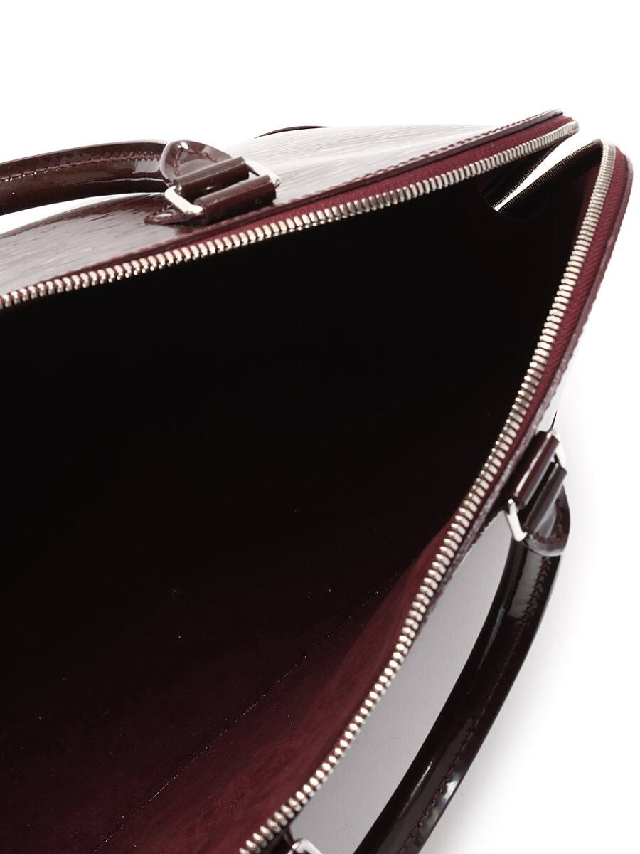 Patent Epi leather handbag in prune color. Silver-tone metal hardware. Dual rolled handles. Top zip closure with lock and clochette. Protective feet at base.