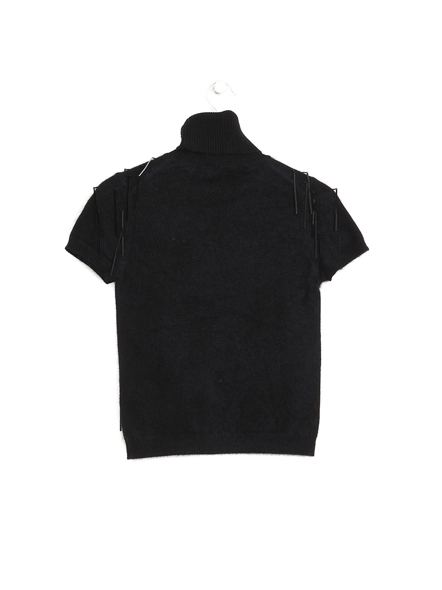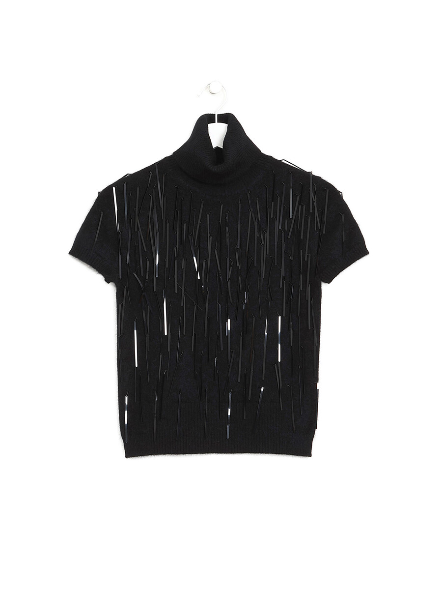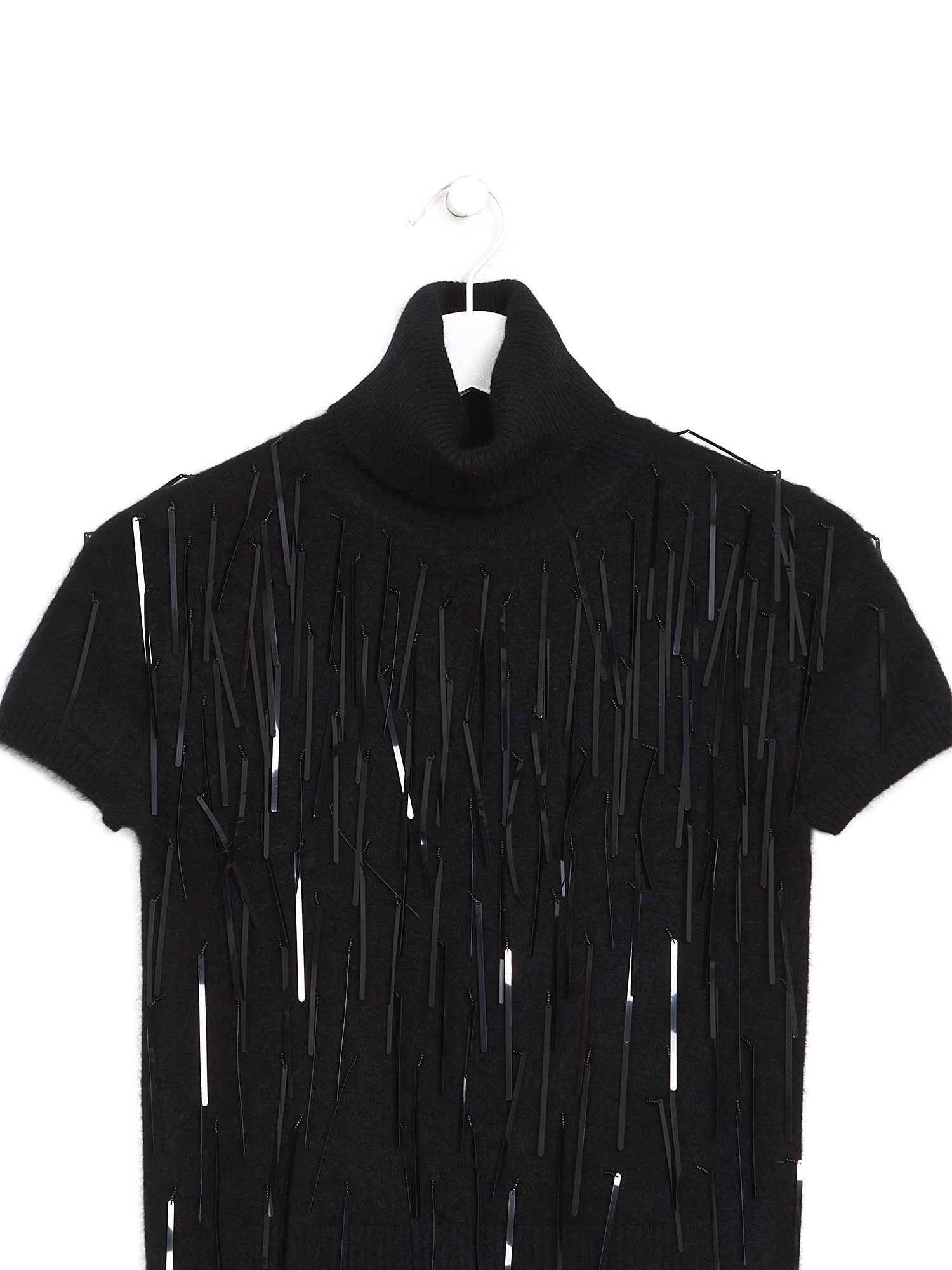 Short sleeve rolled neck cashmere sweater in black. Features sequin embellishments and fringe detailing.