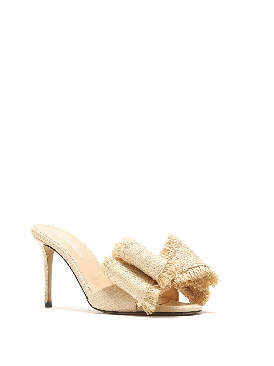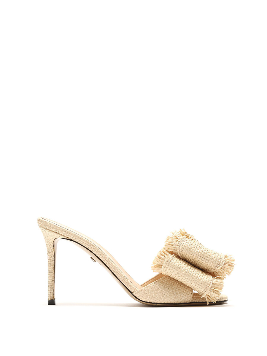 Raffia heeled mules featuring a large decorative bow at the vamp. Slip-on style with open toe. Leather sole.