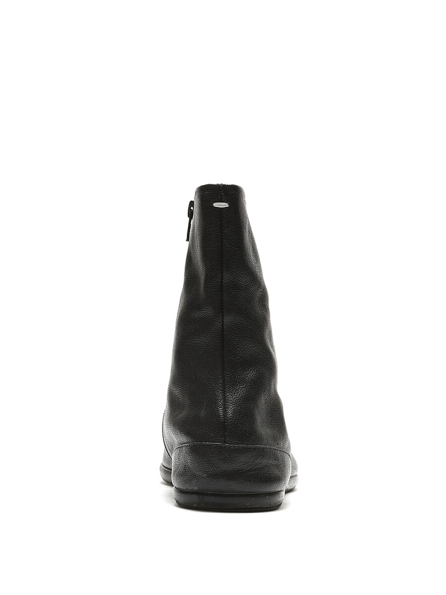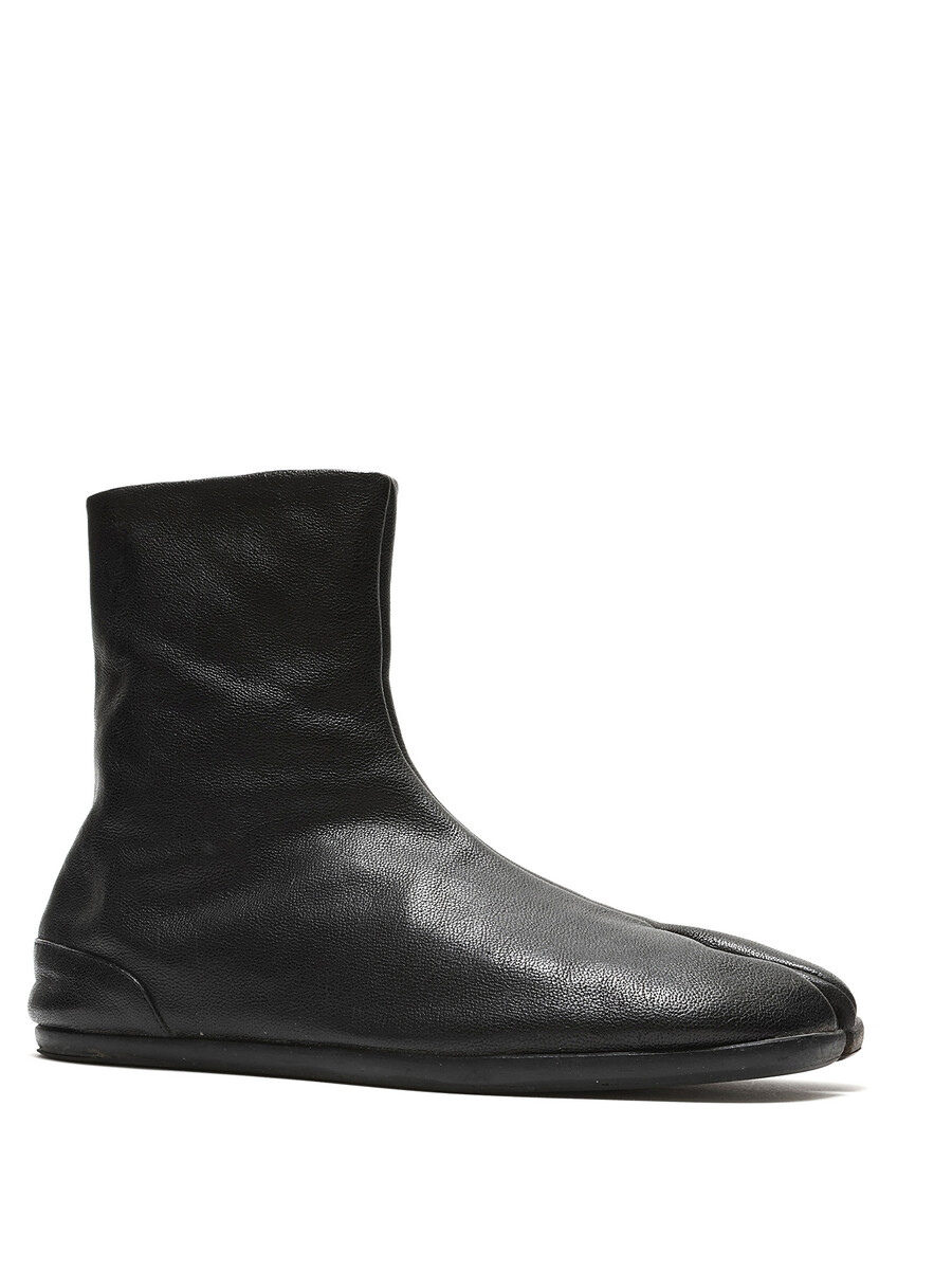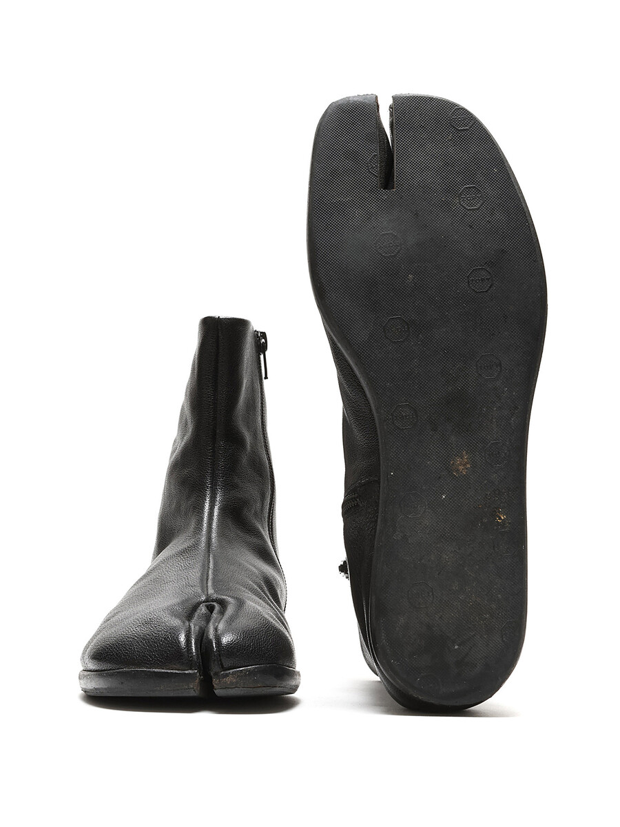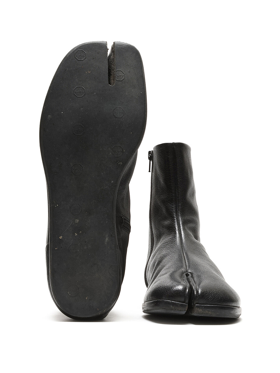 Black leather split-toe boots with zip closure. Tonal stitching and leather lining. Replaced sole with signs of wear and separation at heel.