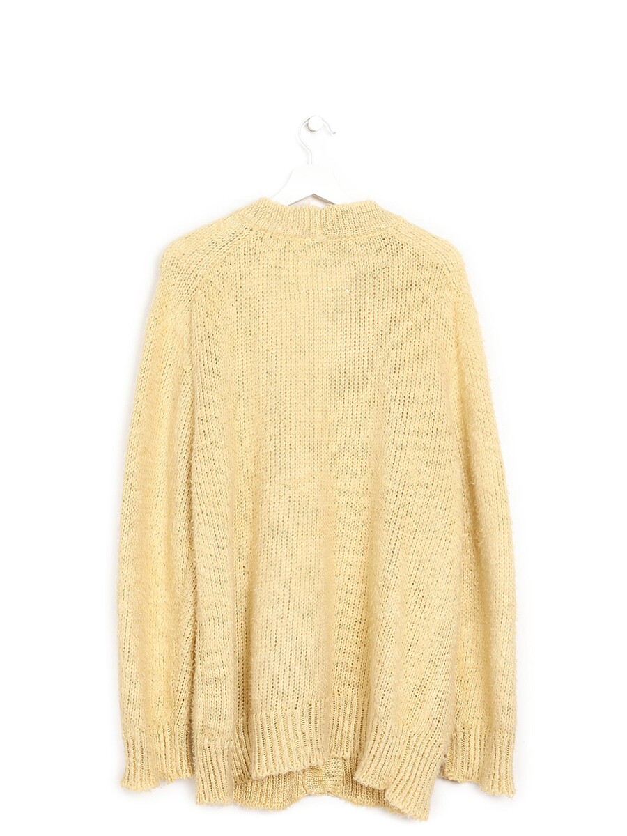 Knit cardigan in yellow with a v-neckline. Features button front closure and patch pockets.
