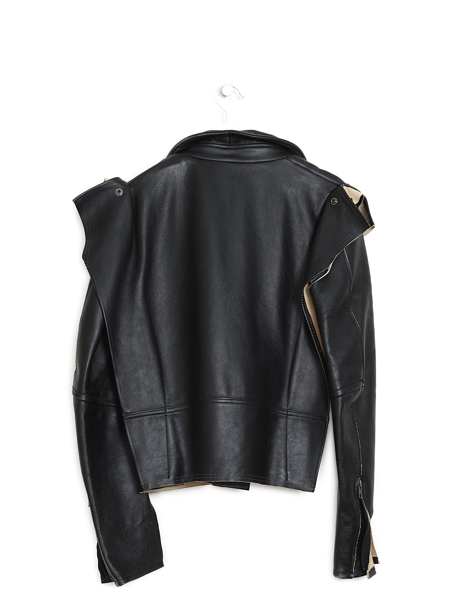 Deconstructed leather perfecto jacket in black. Zipper closure at front. Lapel notch collar and side zipper pockets. Paneled construction.