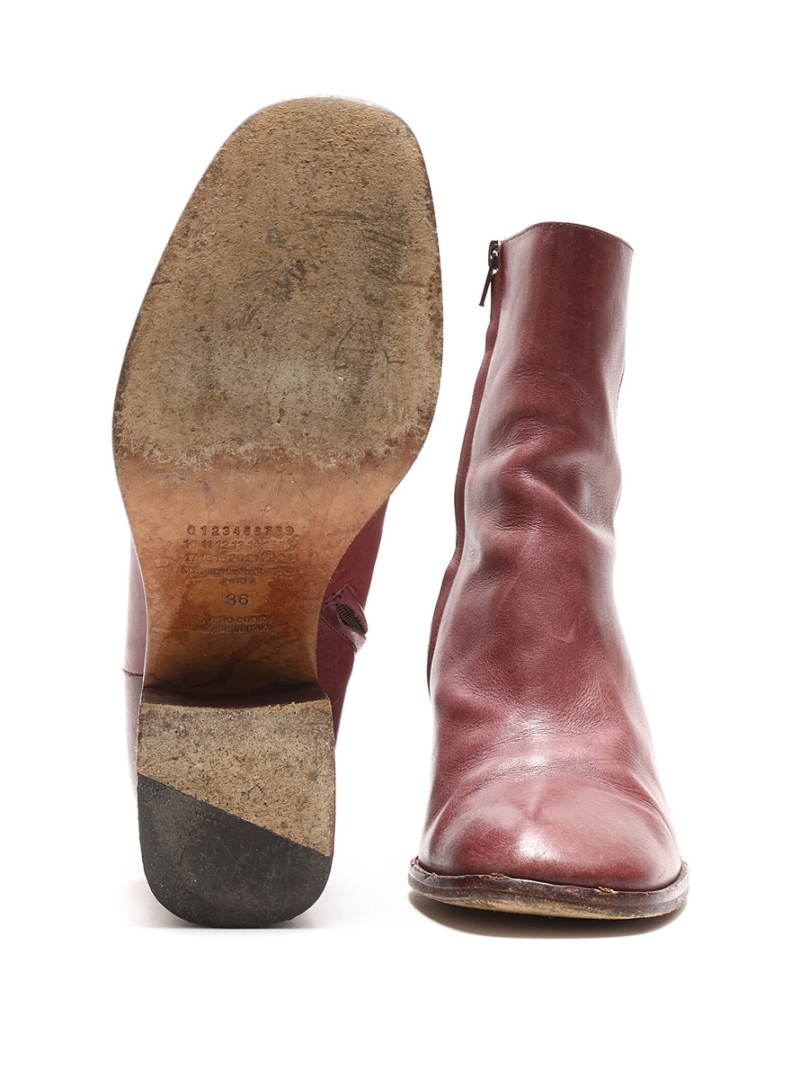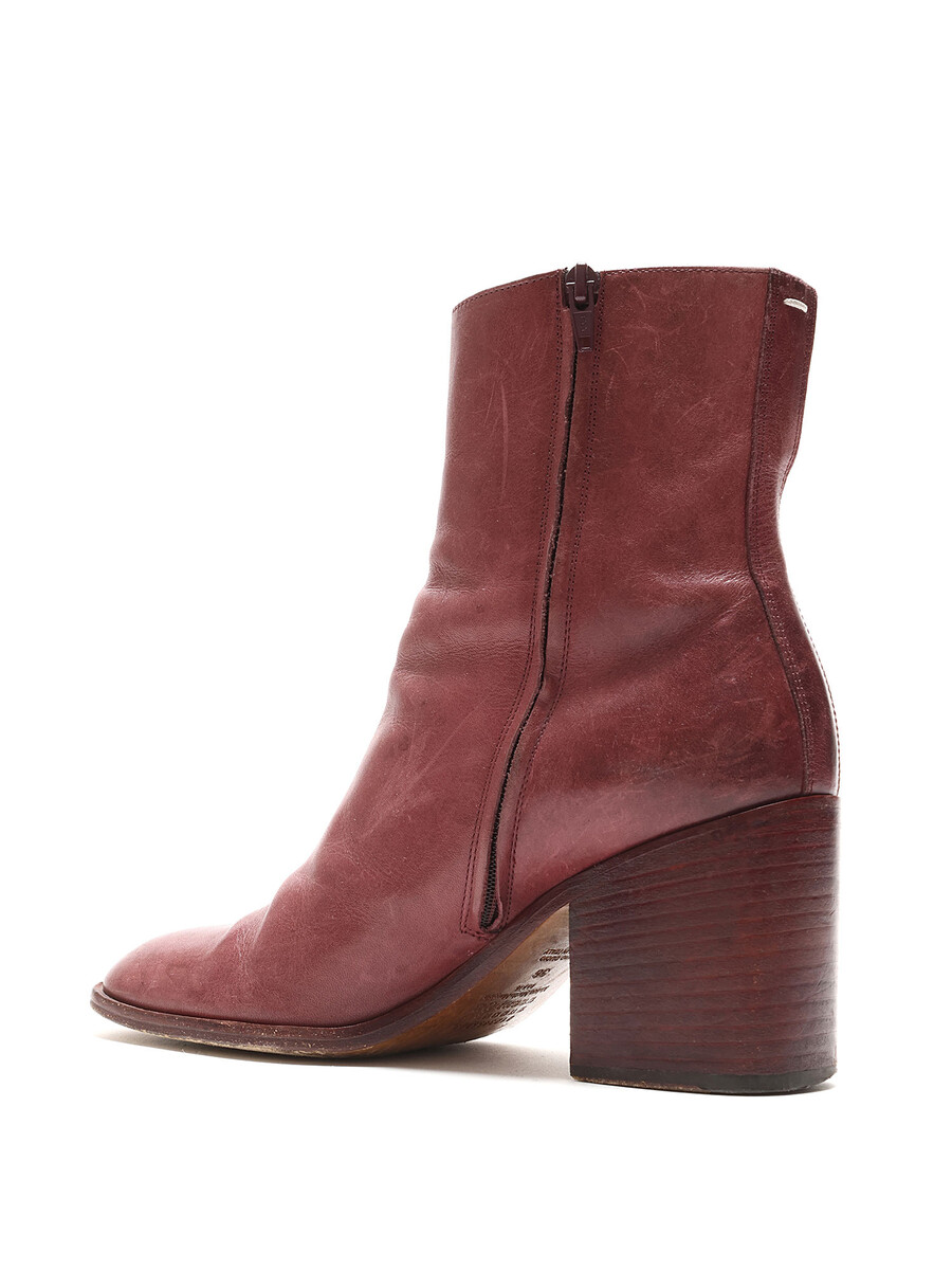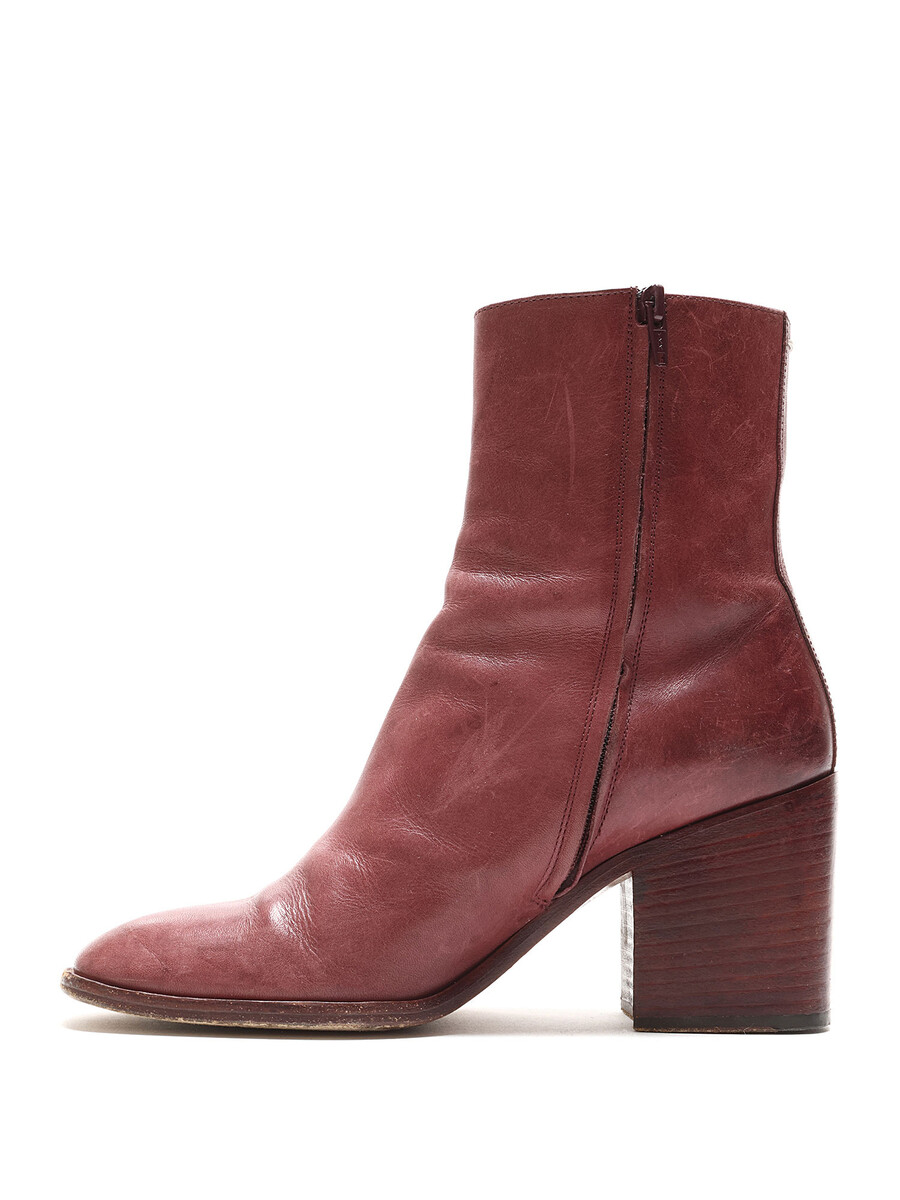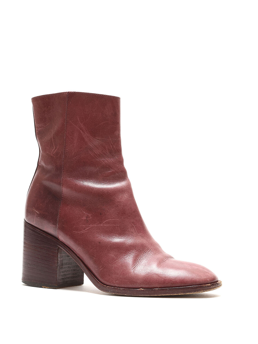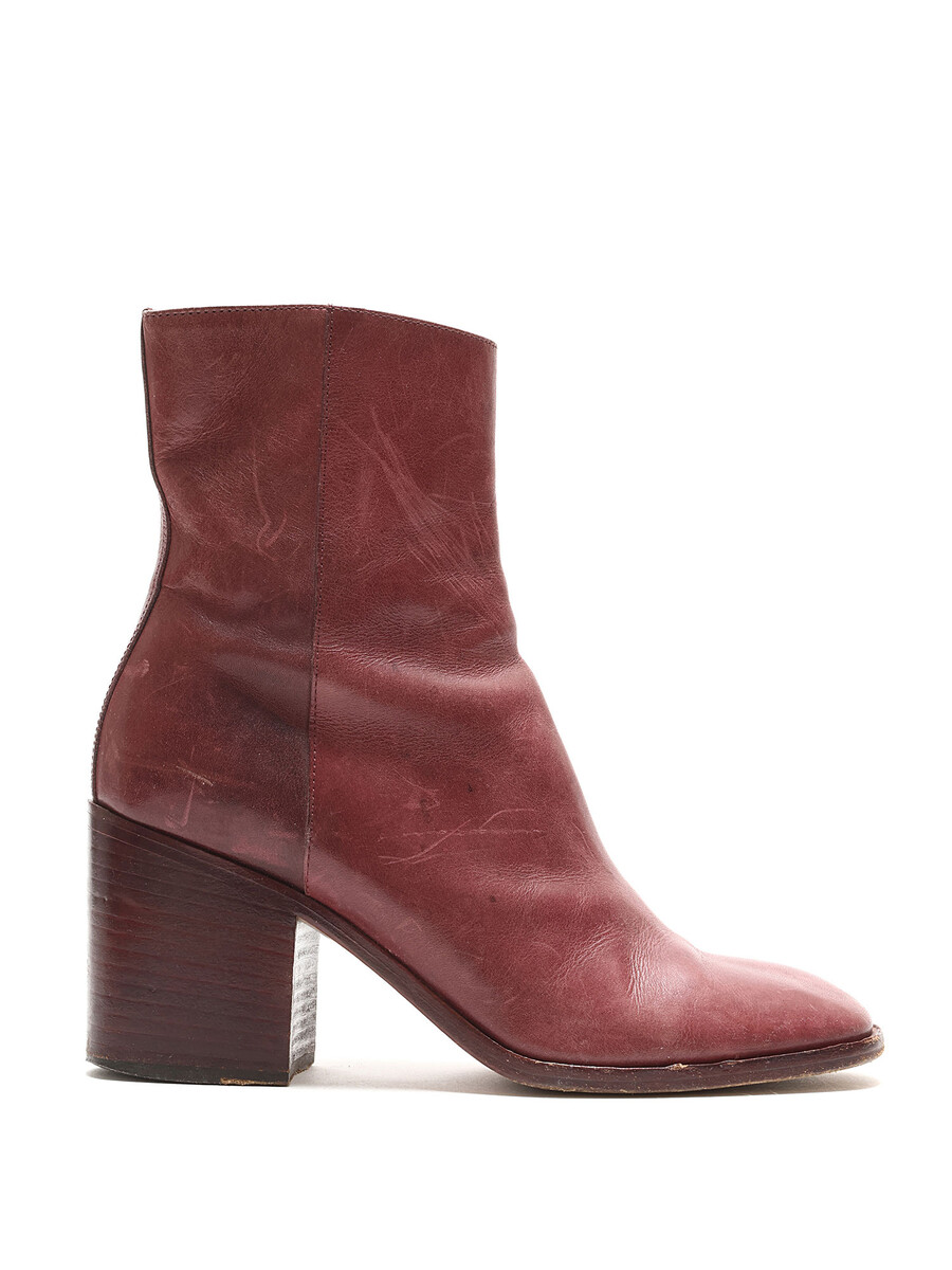 Leather ankle boots in burgundy. Discreet side zipper closure. Round toe style. Leather block heel.