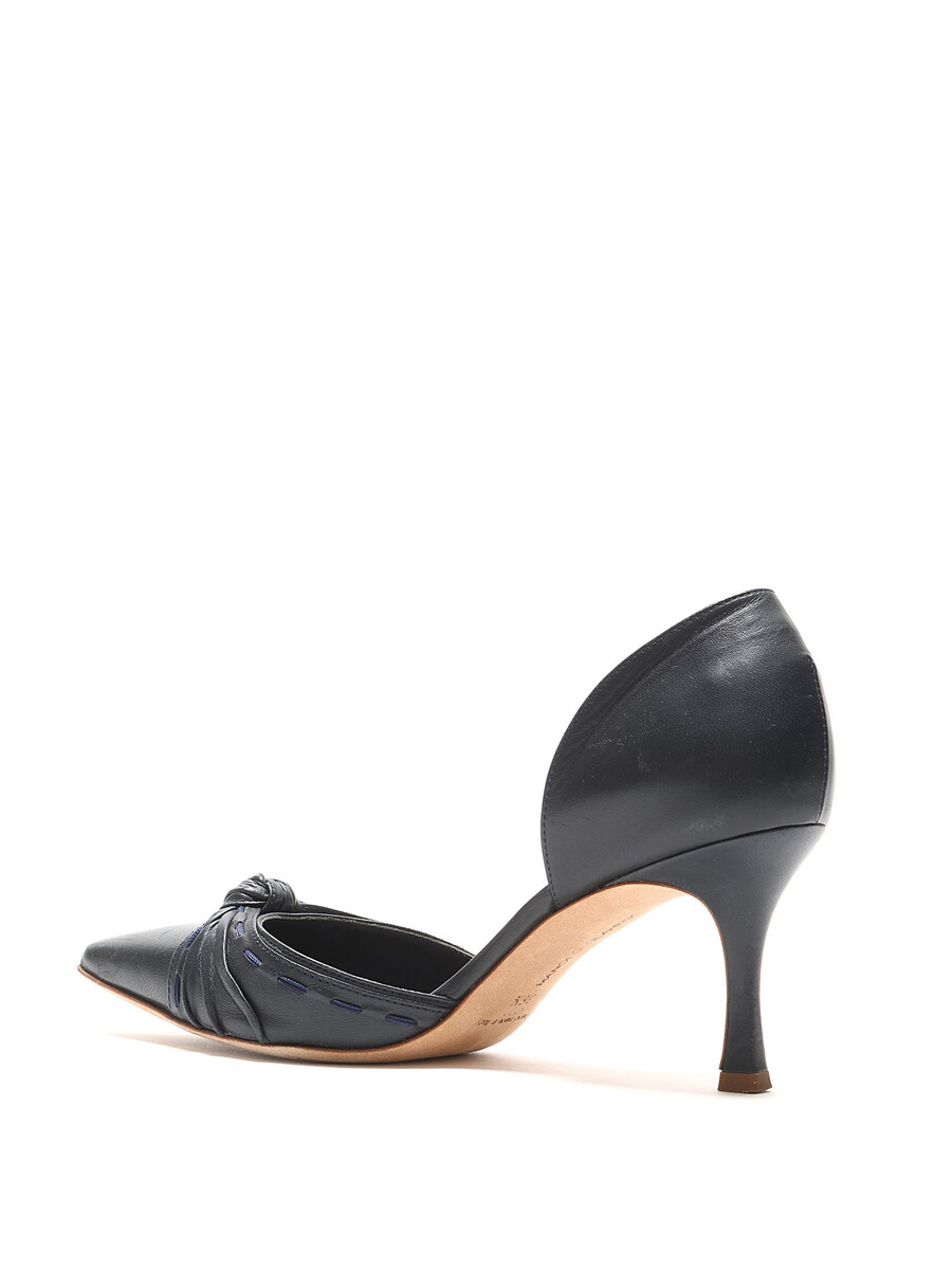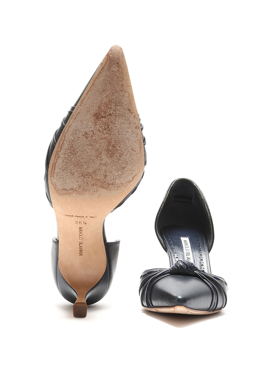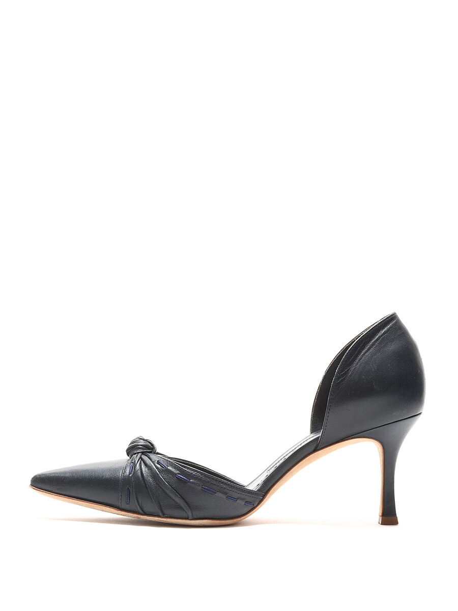 Black smooth leather pumps featuring elegant knot detailing. Slip-on closure with a pointed toe design. Leather sole.