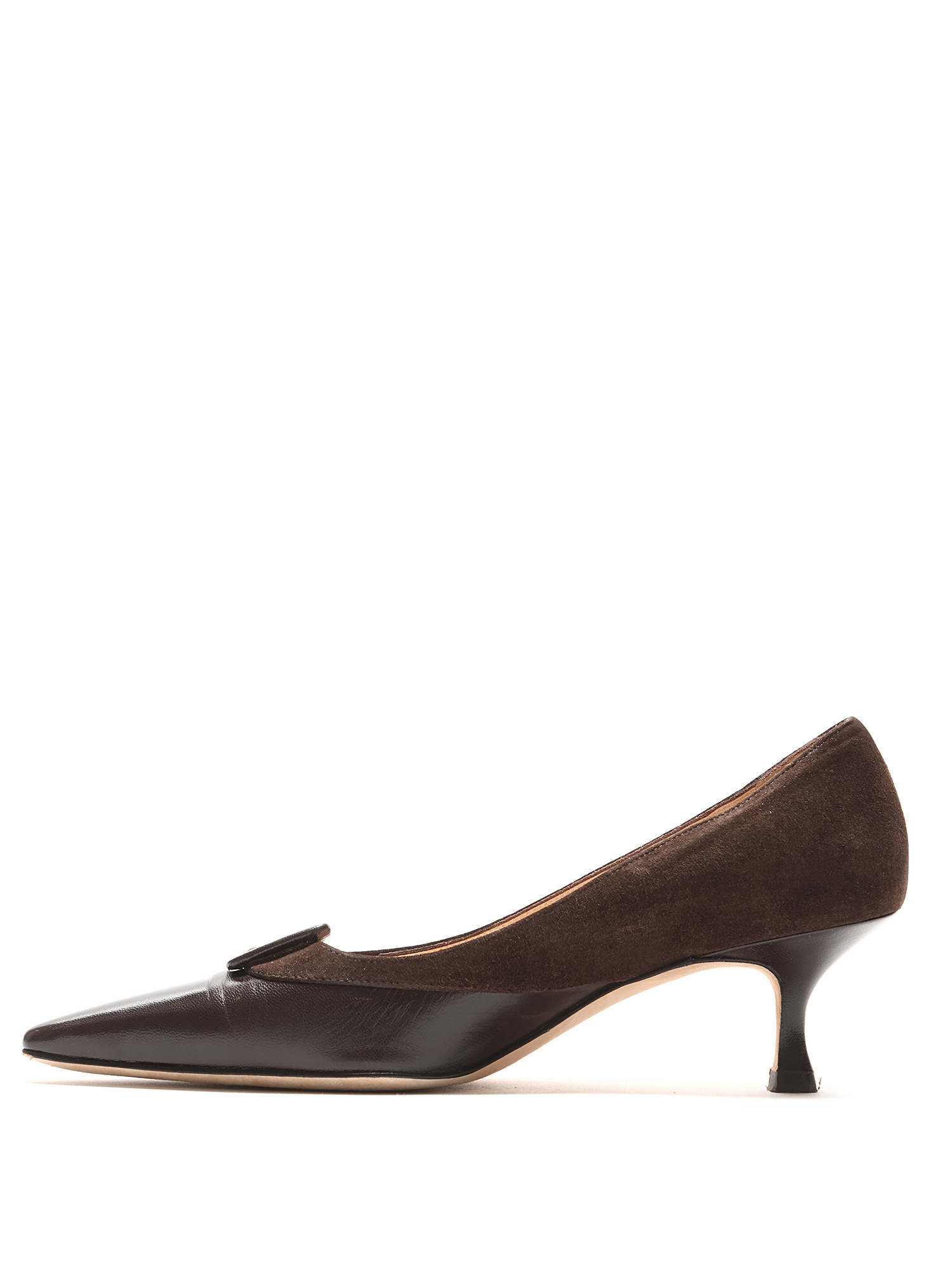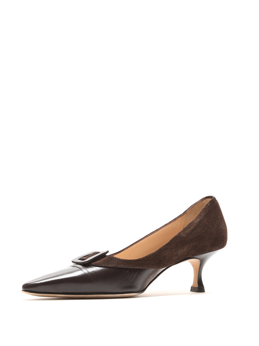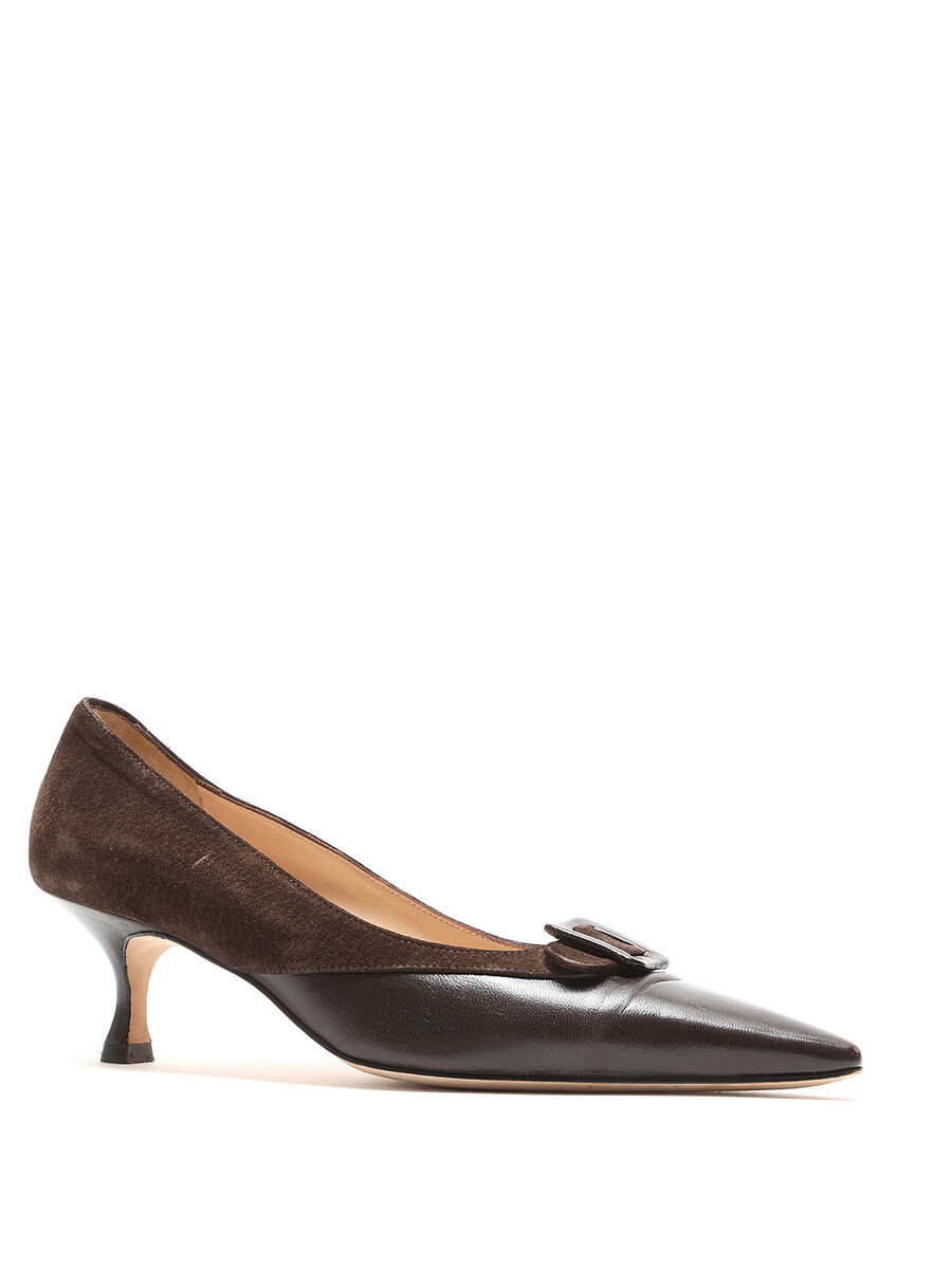 Brown leather kitten heels with buckle detail. Pointed toe. Leather sole.