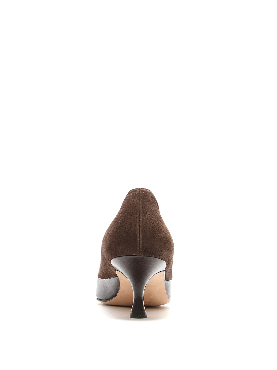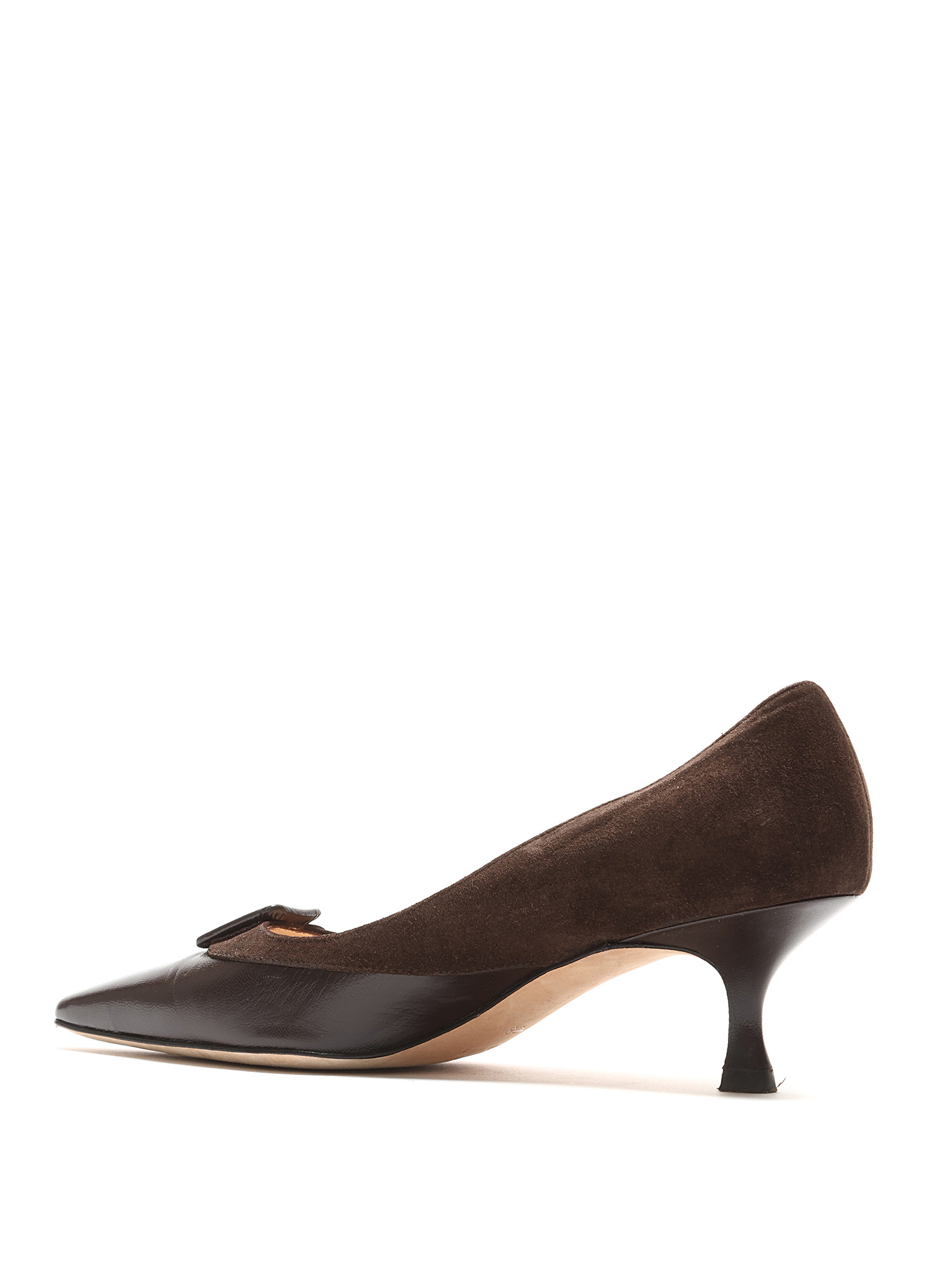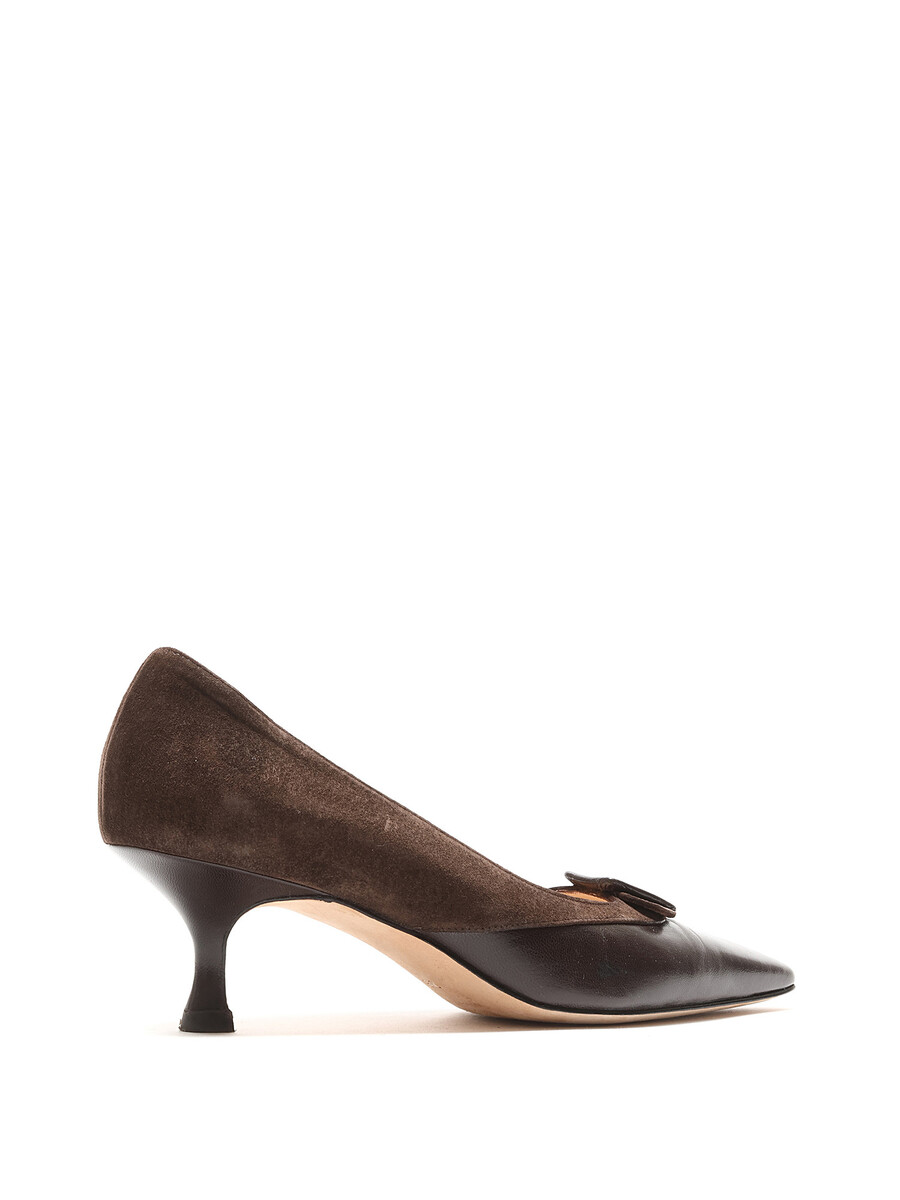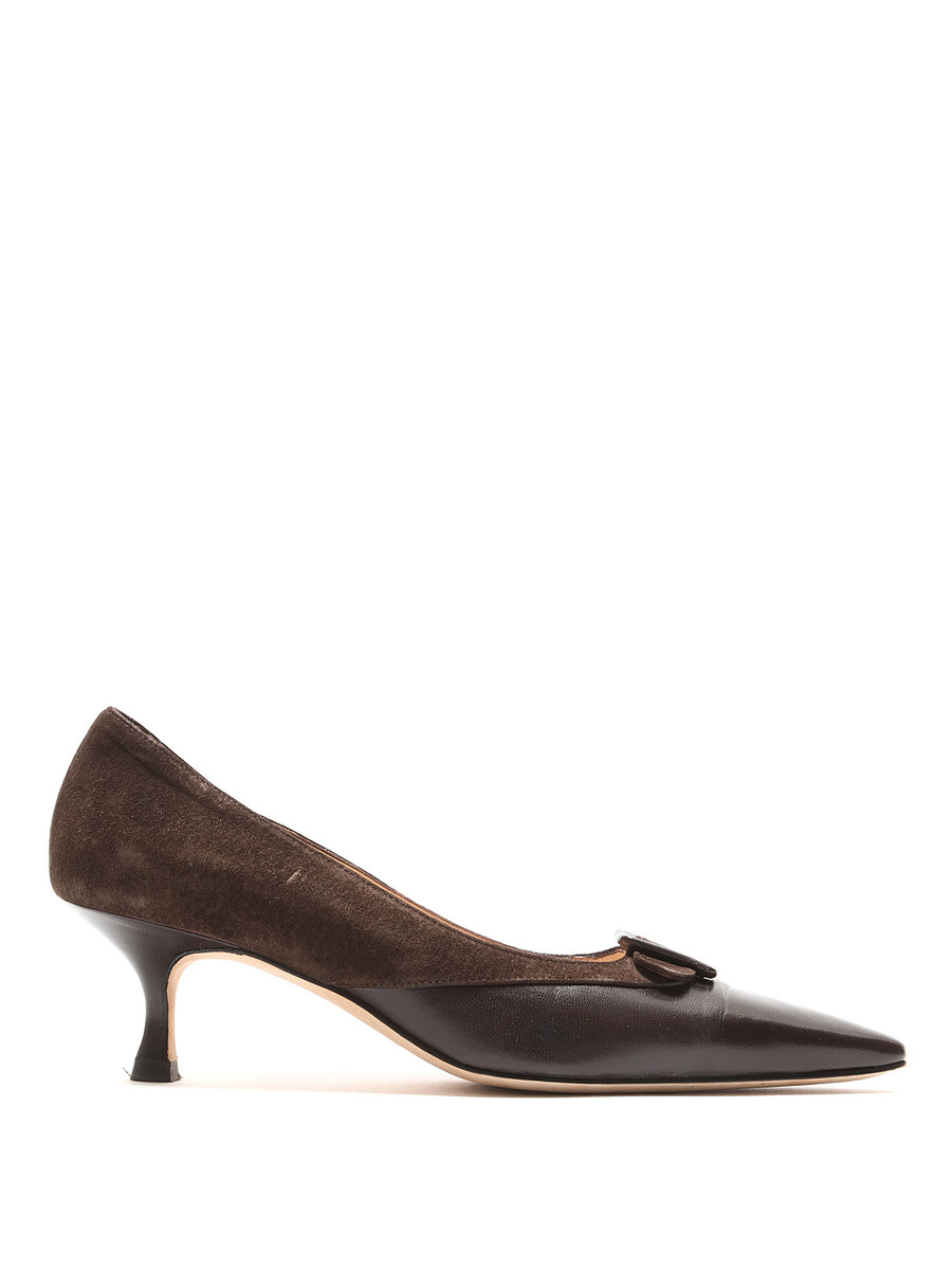 Brown leather kitten heels with buckle detail. Pointed toe. Leather sole.