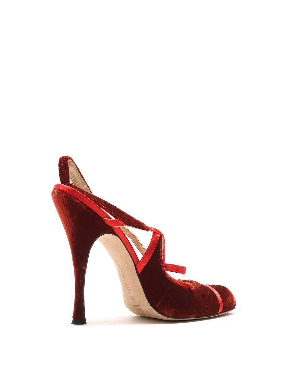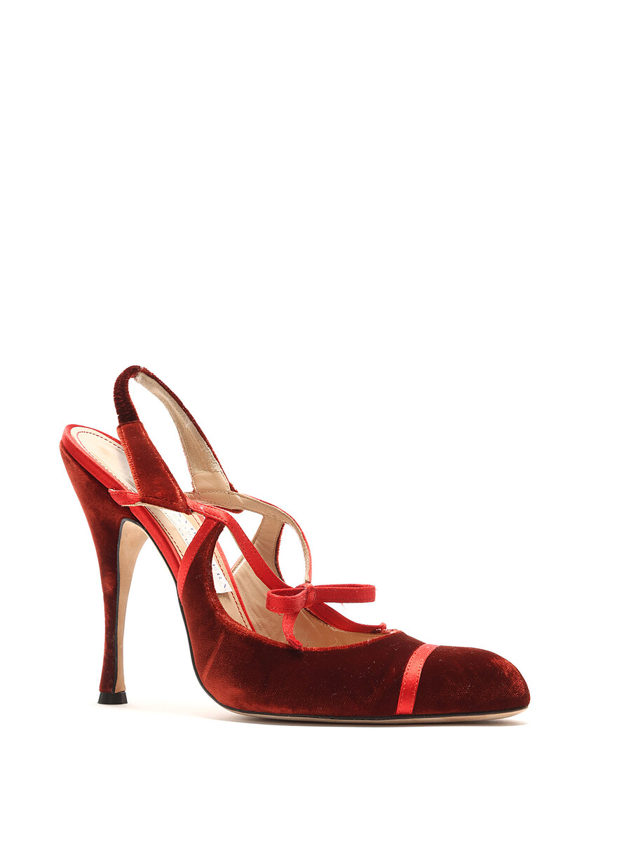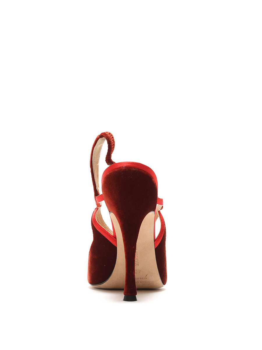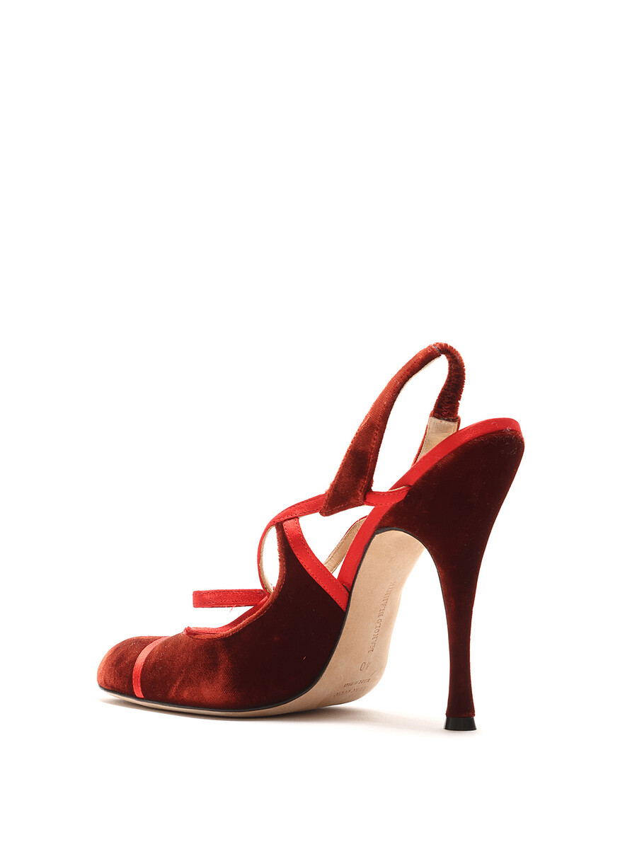 High-heel velvet sandals in vibrant red. Pointed toe. Leather sole.