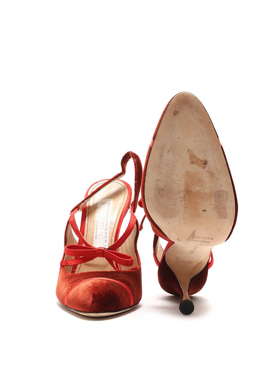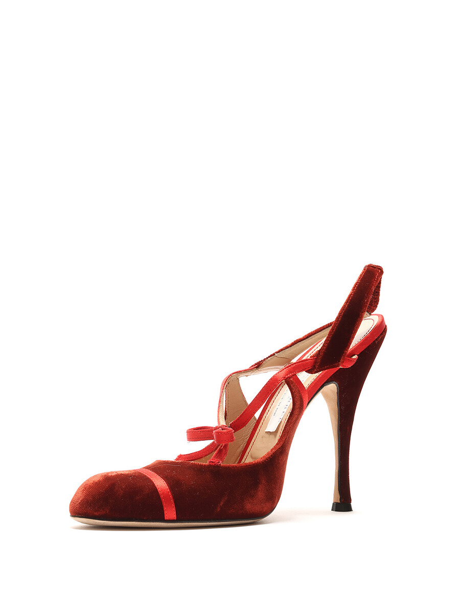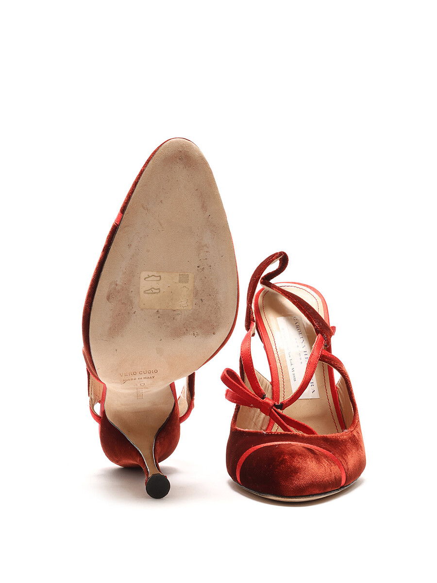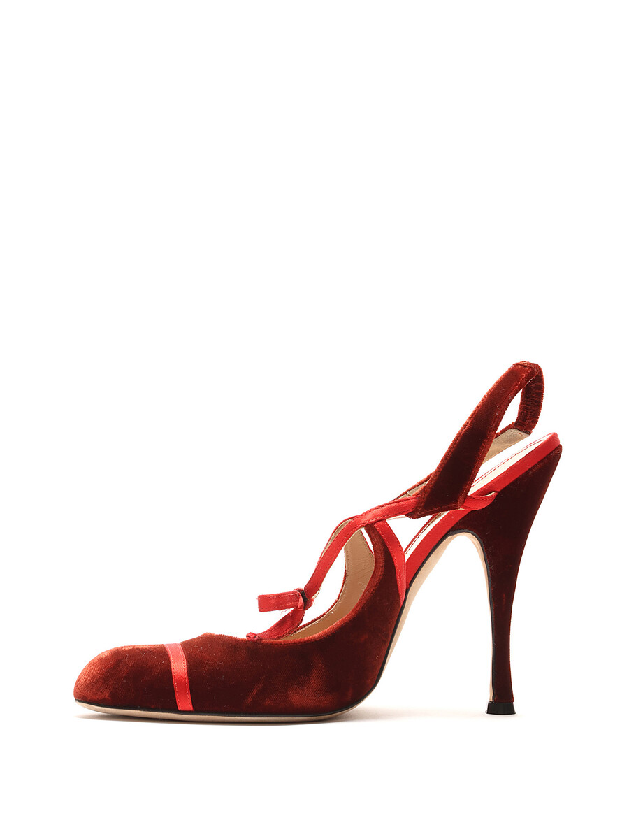 High-heel velvet sandals in vibrant red. Pointed toe. Leather sole.