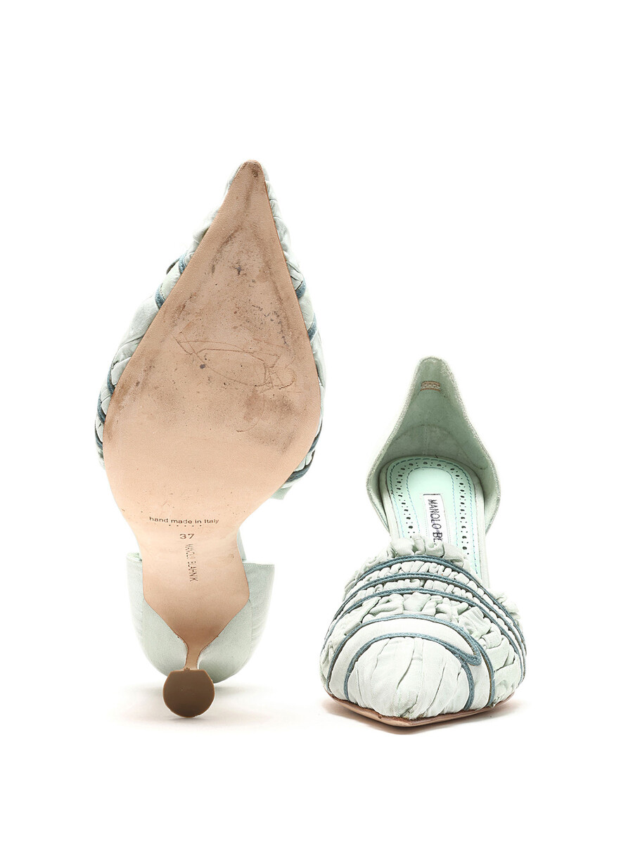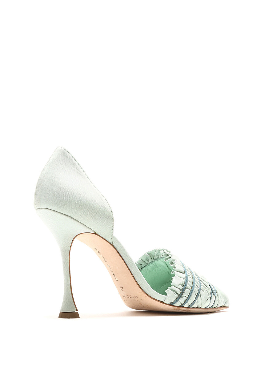 Ruched fabric stiletto heels in light green with dark green piping. Pointed toe. Leather sole. With dust bag.