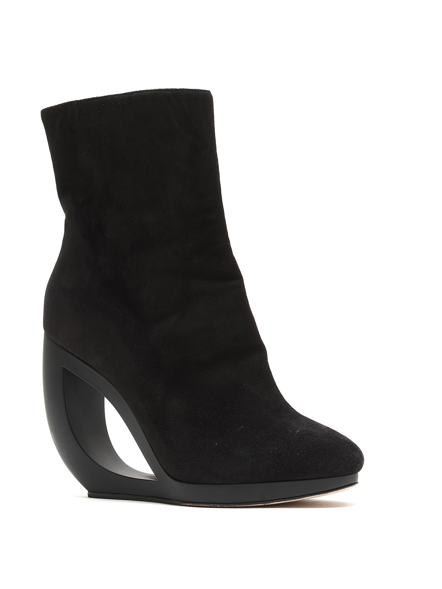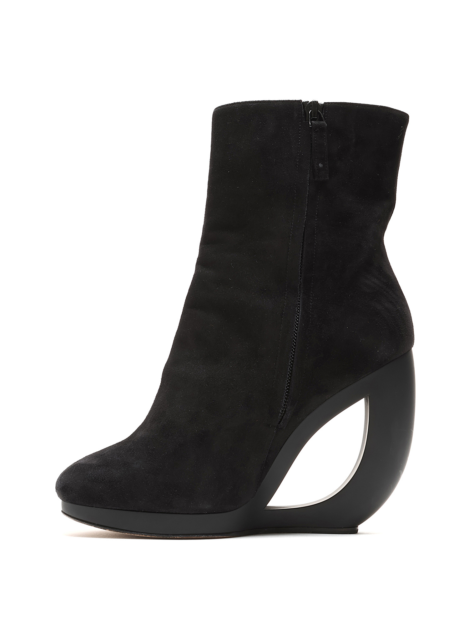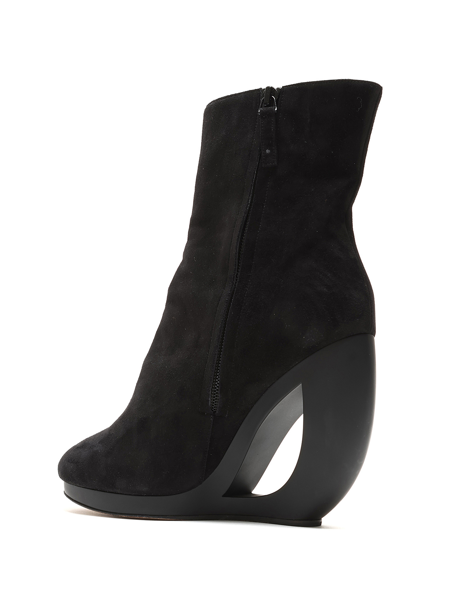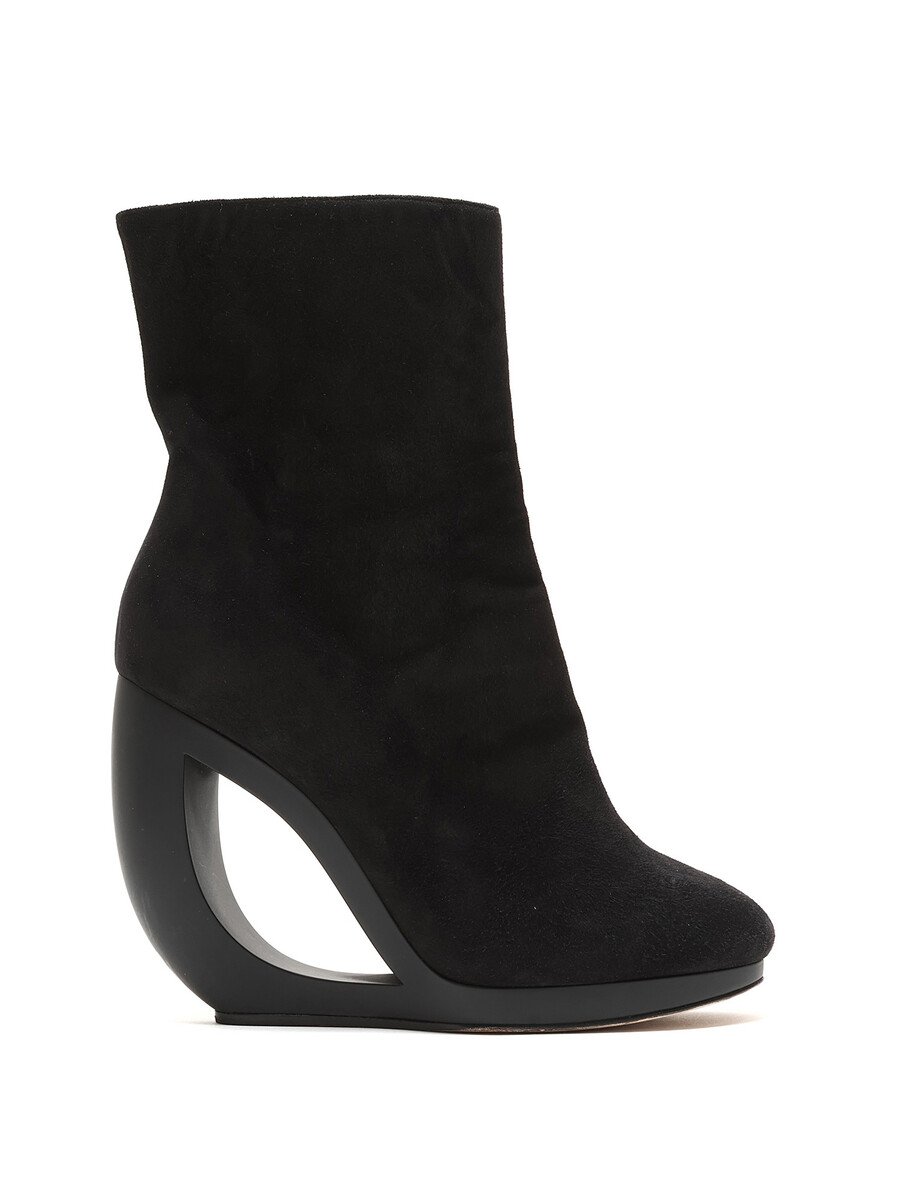 Sculptural-heeled suede ankle boots in black. Side zipper closure. Closed round toe. Leather sole. With box.