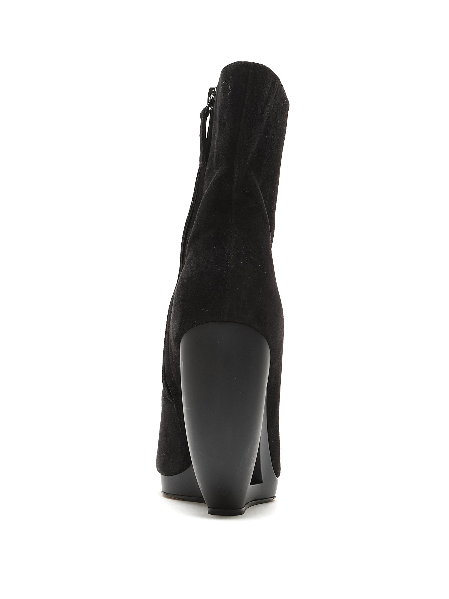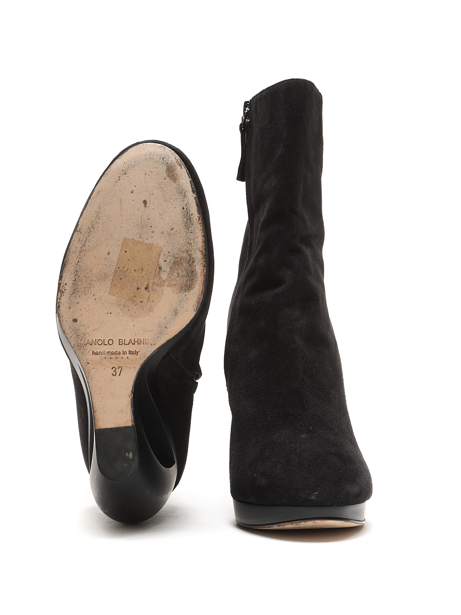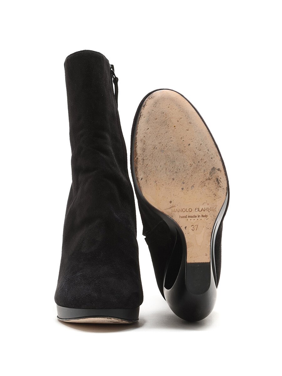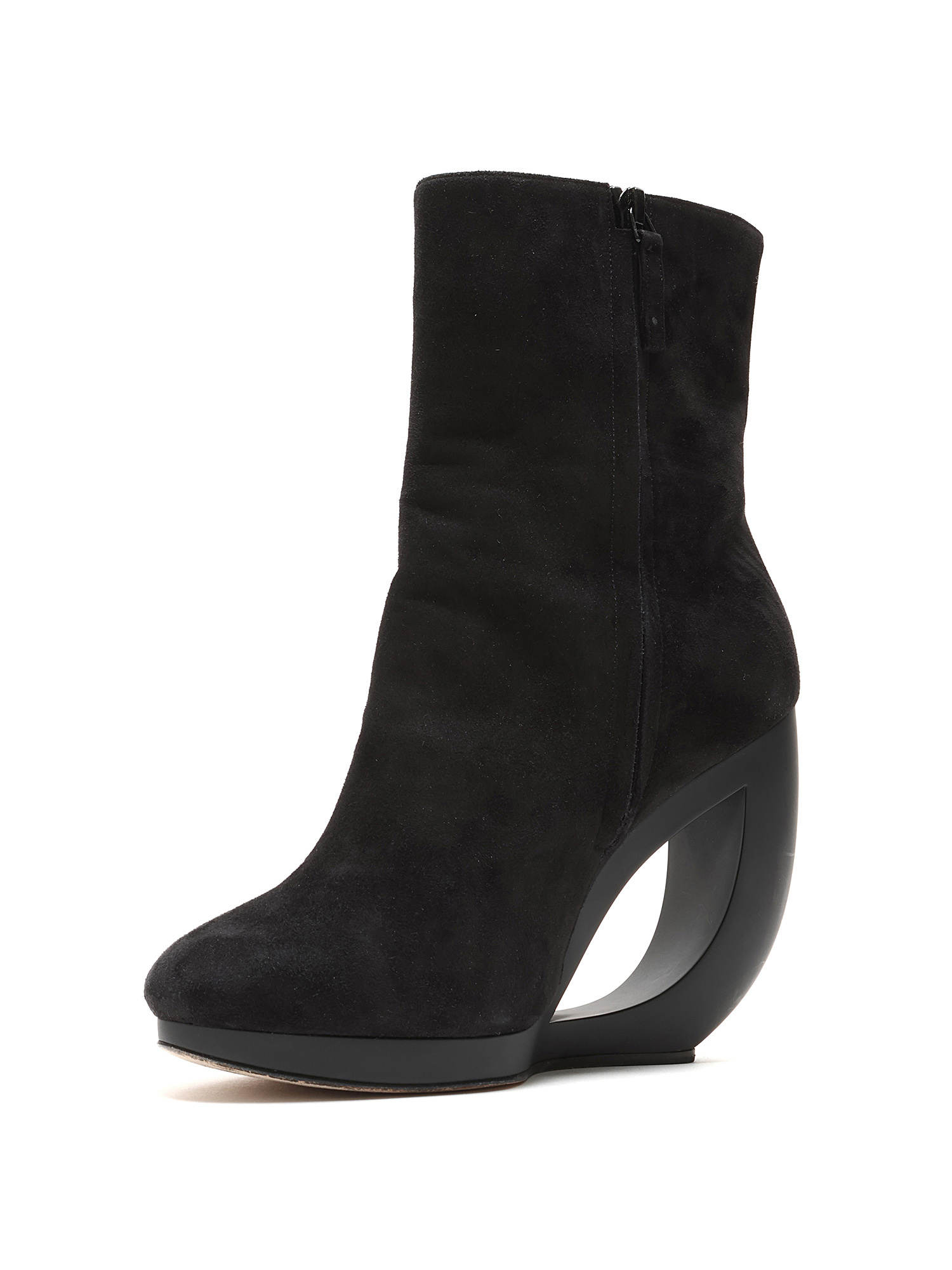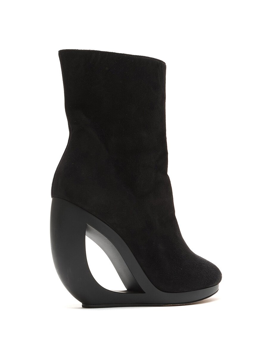 Sculptural-heeled suede ankle boots in black. Side zipper closure. Closed round toe. Leather sole. With box.