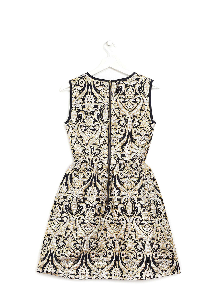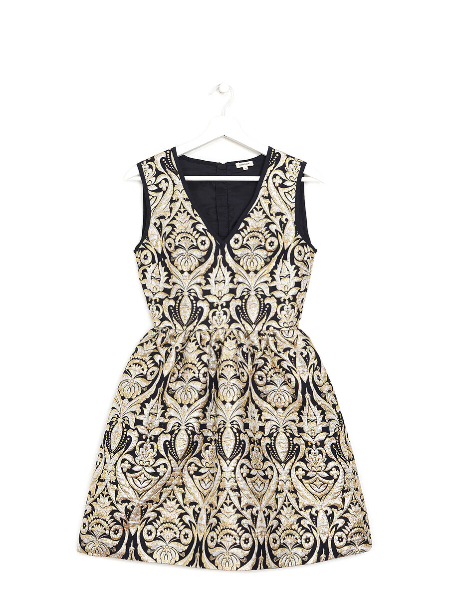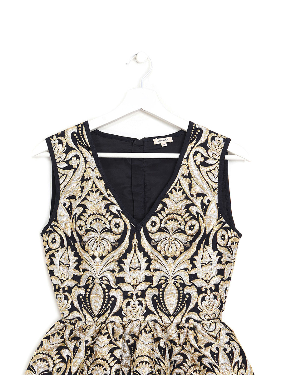 Sleeveless midi dress in black featuring abstract metallic gold fibre detailing. V-neckline.