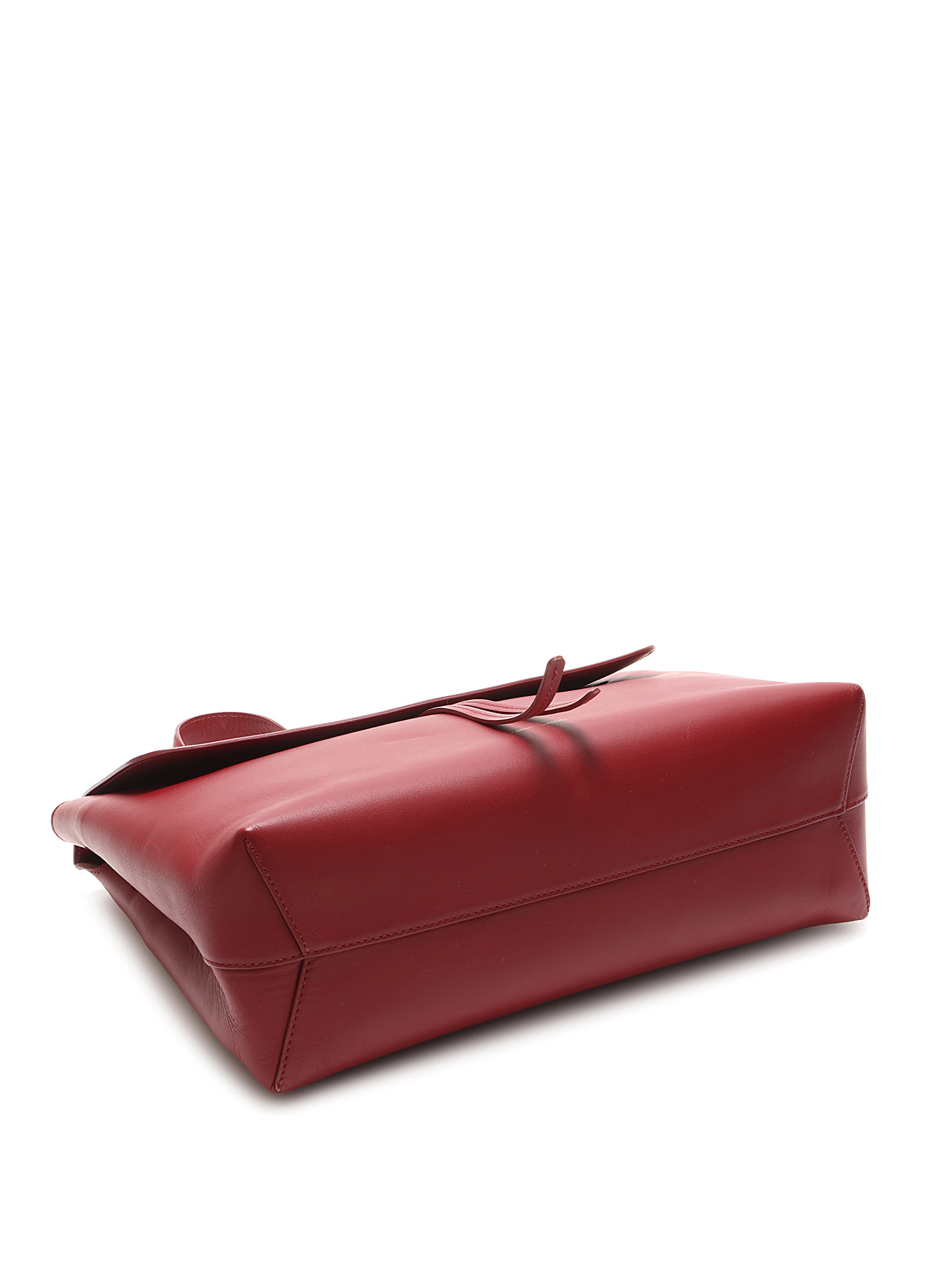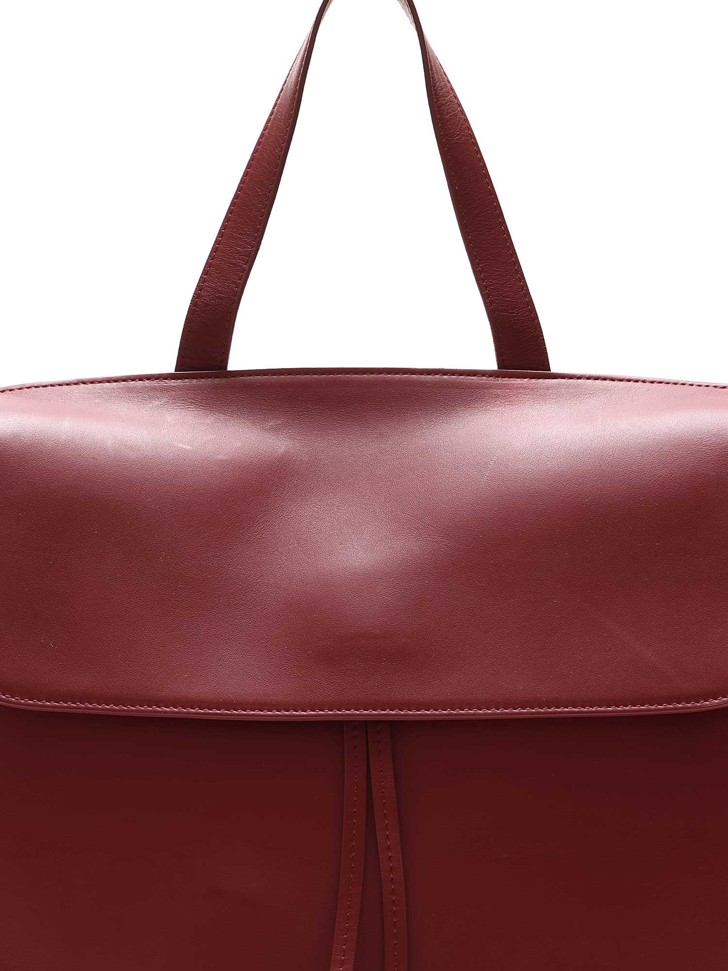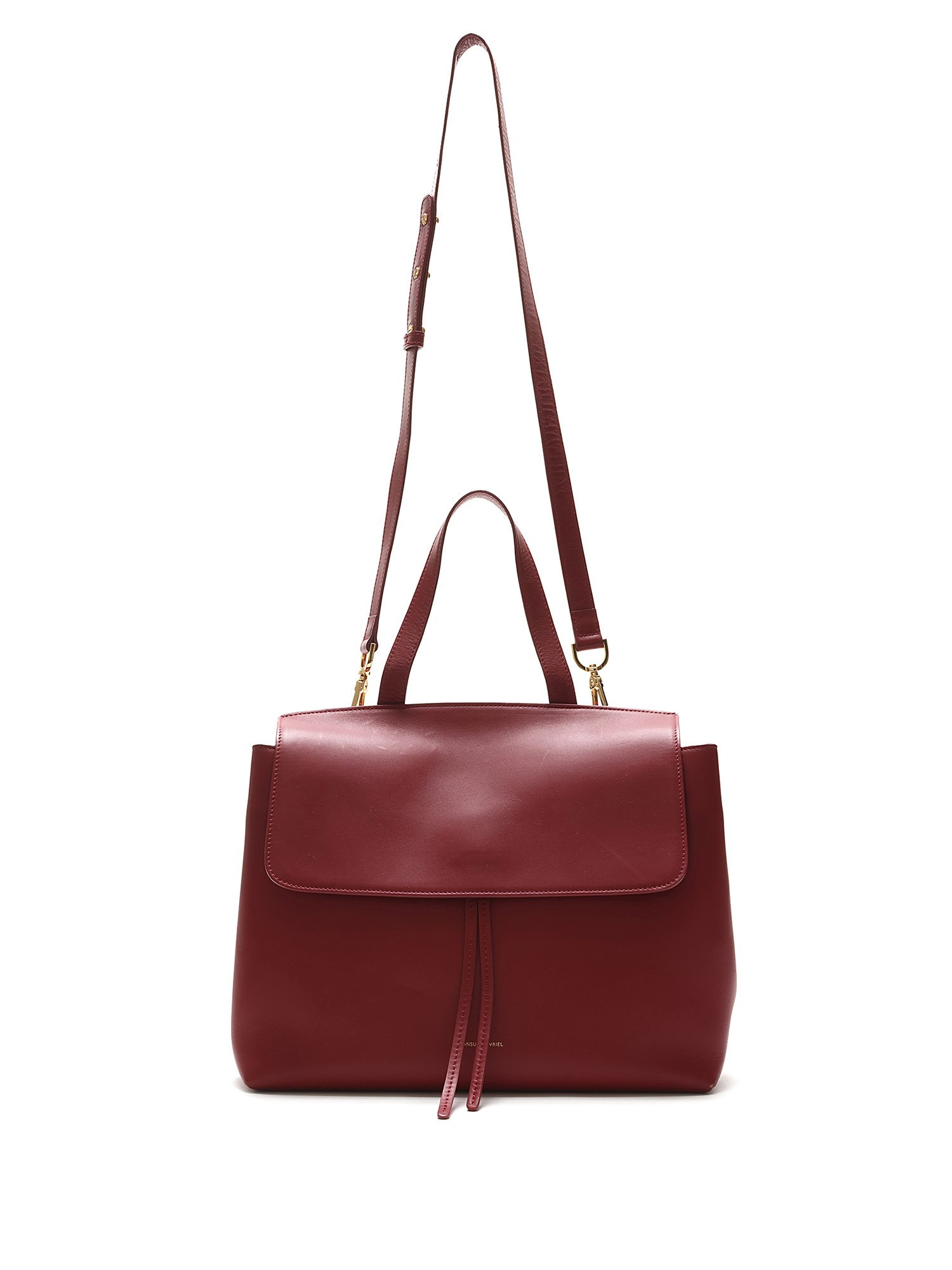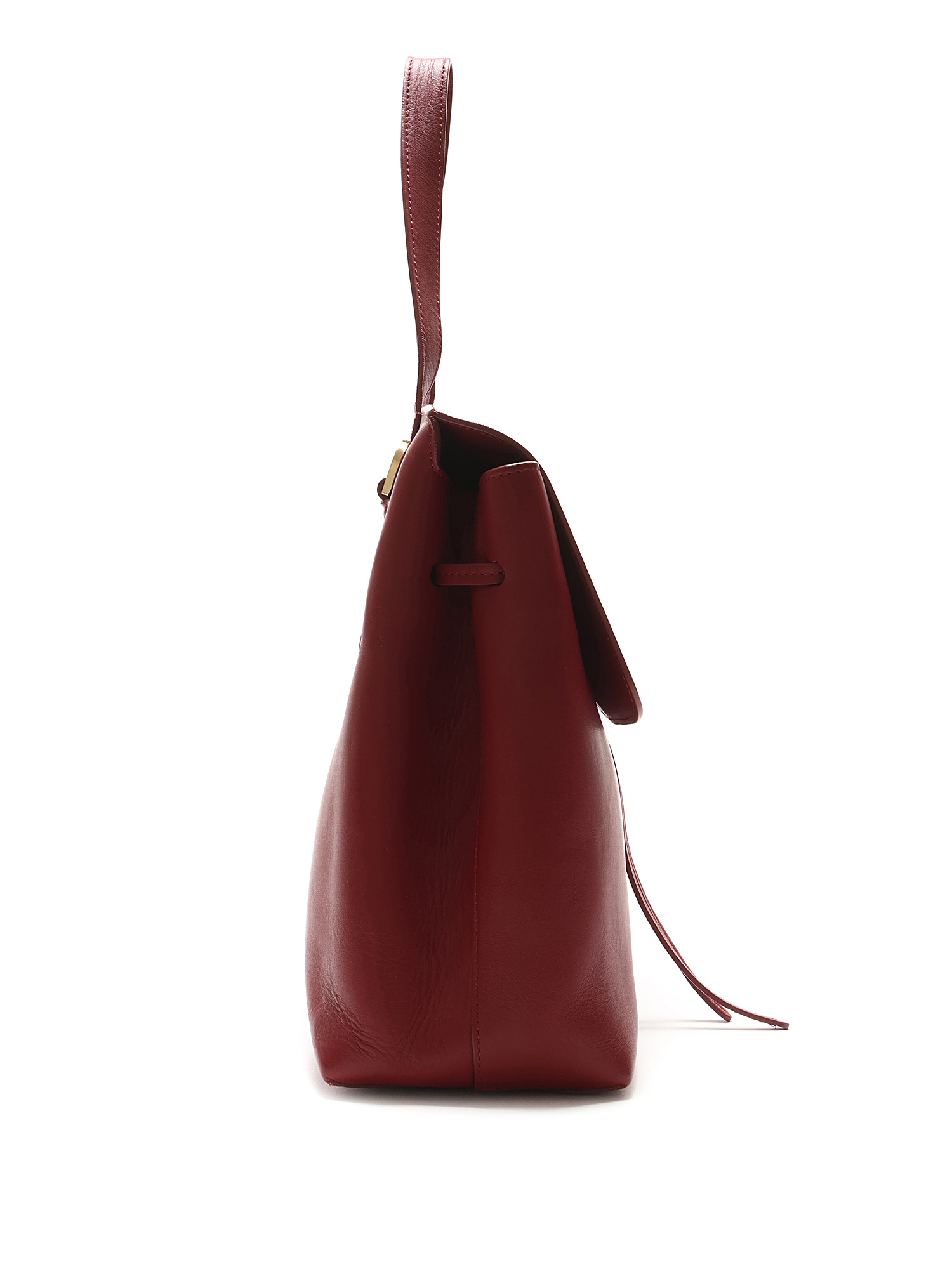 Minimalistic leather handbag with a smooth finish in burgundy. Features a flap with drawstring closure and gold-tone hardware. Detachable and adjustable leather straps. Comes with a dustbag.