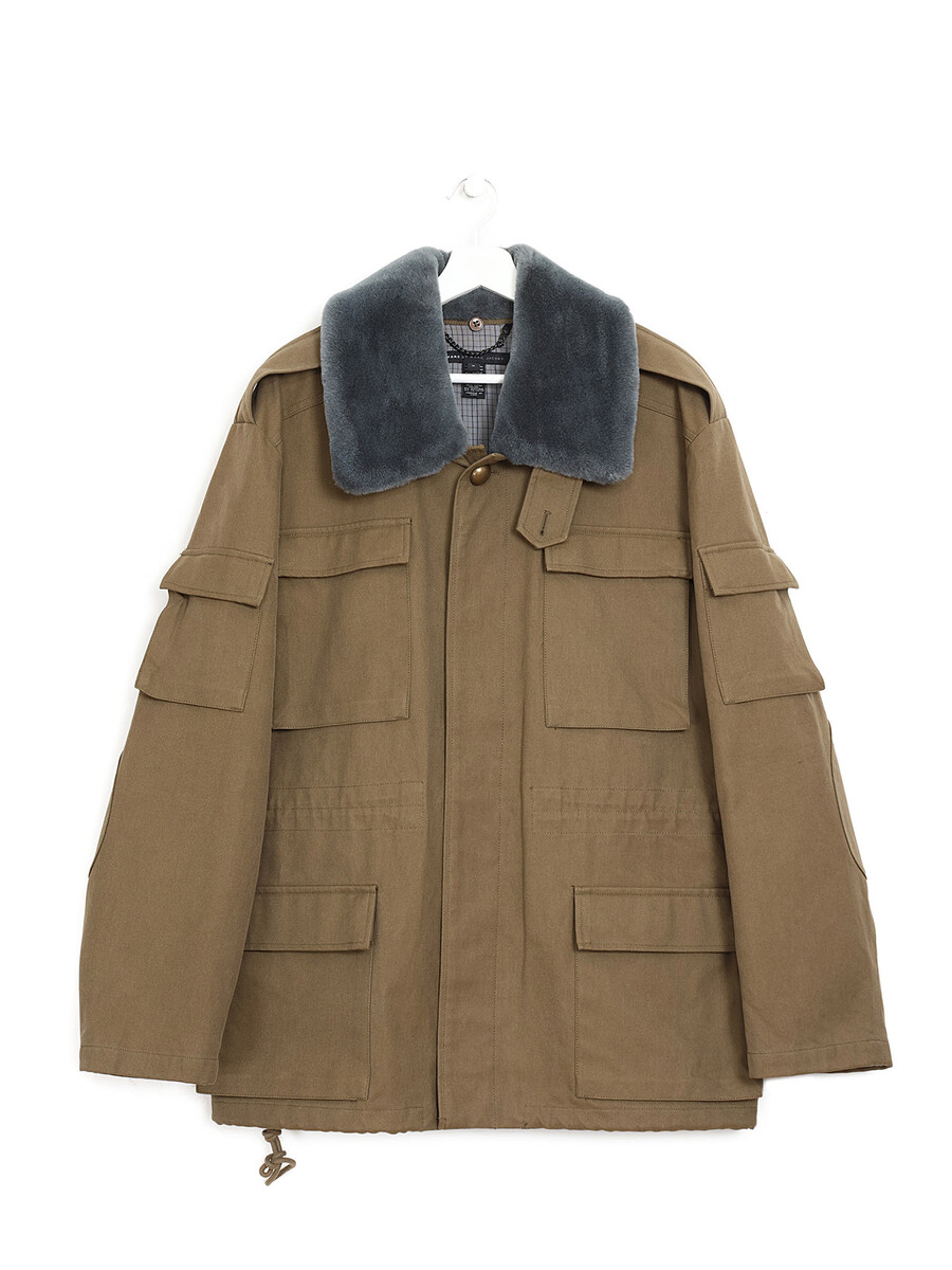 Cotton jacket with large faux fur collar. Multiple front patch pockets.