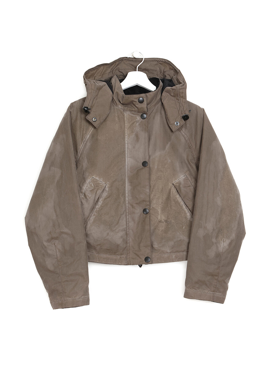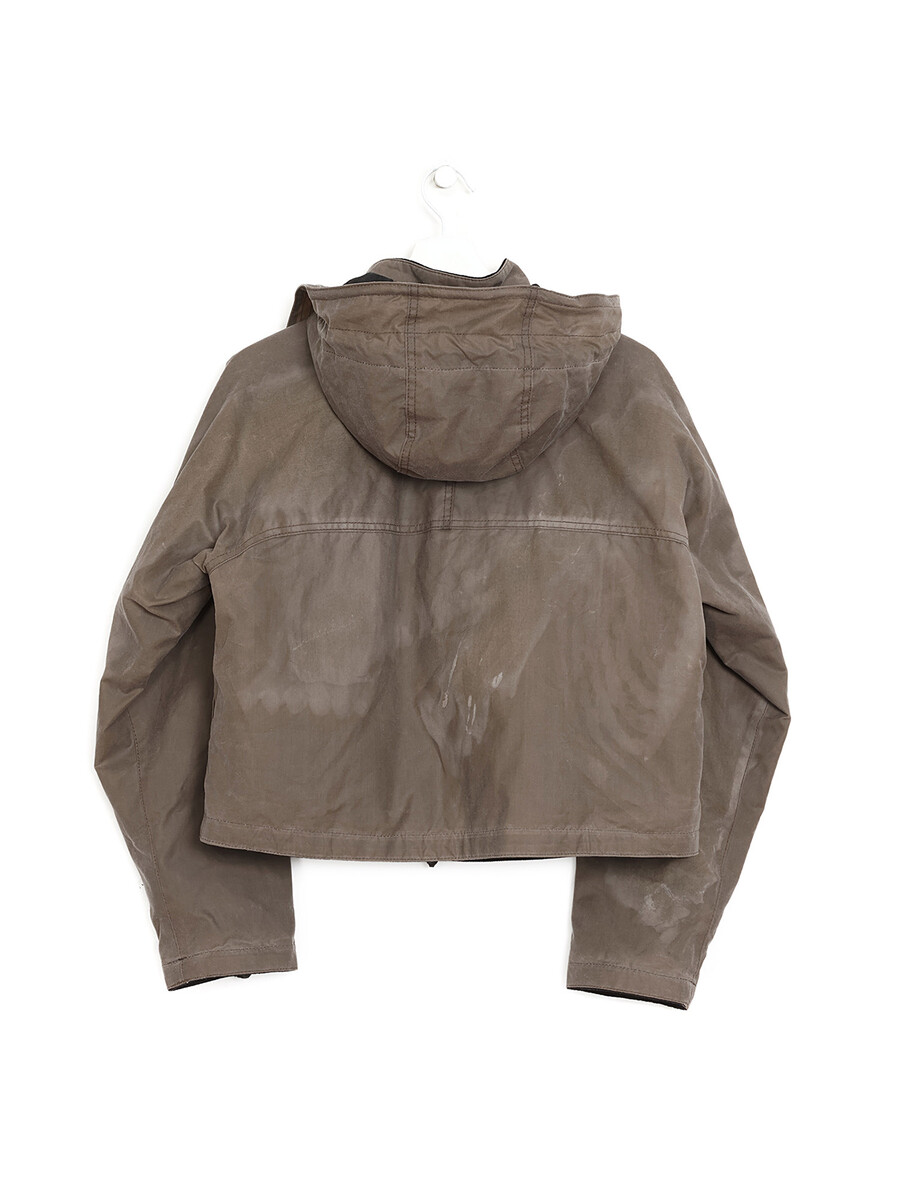 Long sleeve taupe coat featuring front zipper closure. High collar with hood. Two front pockets.