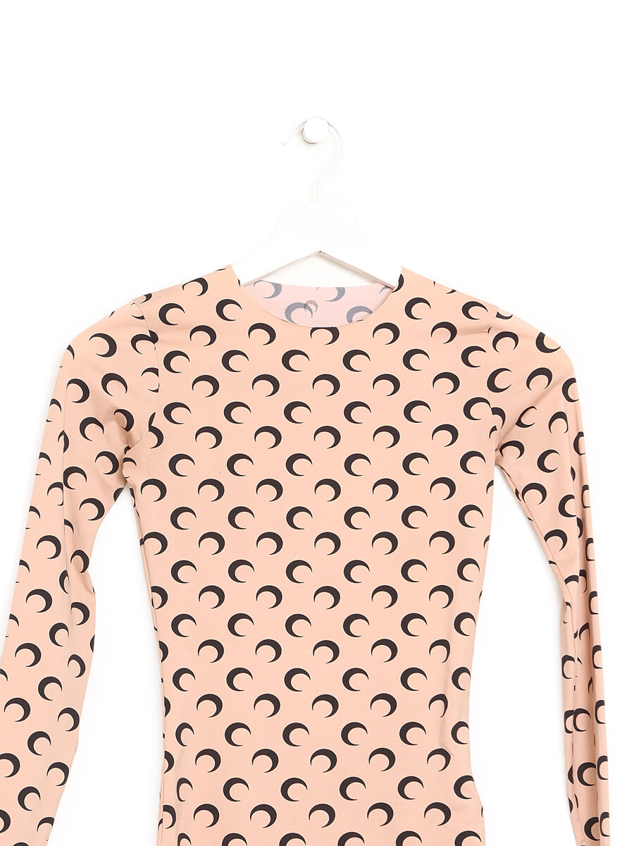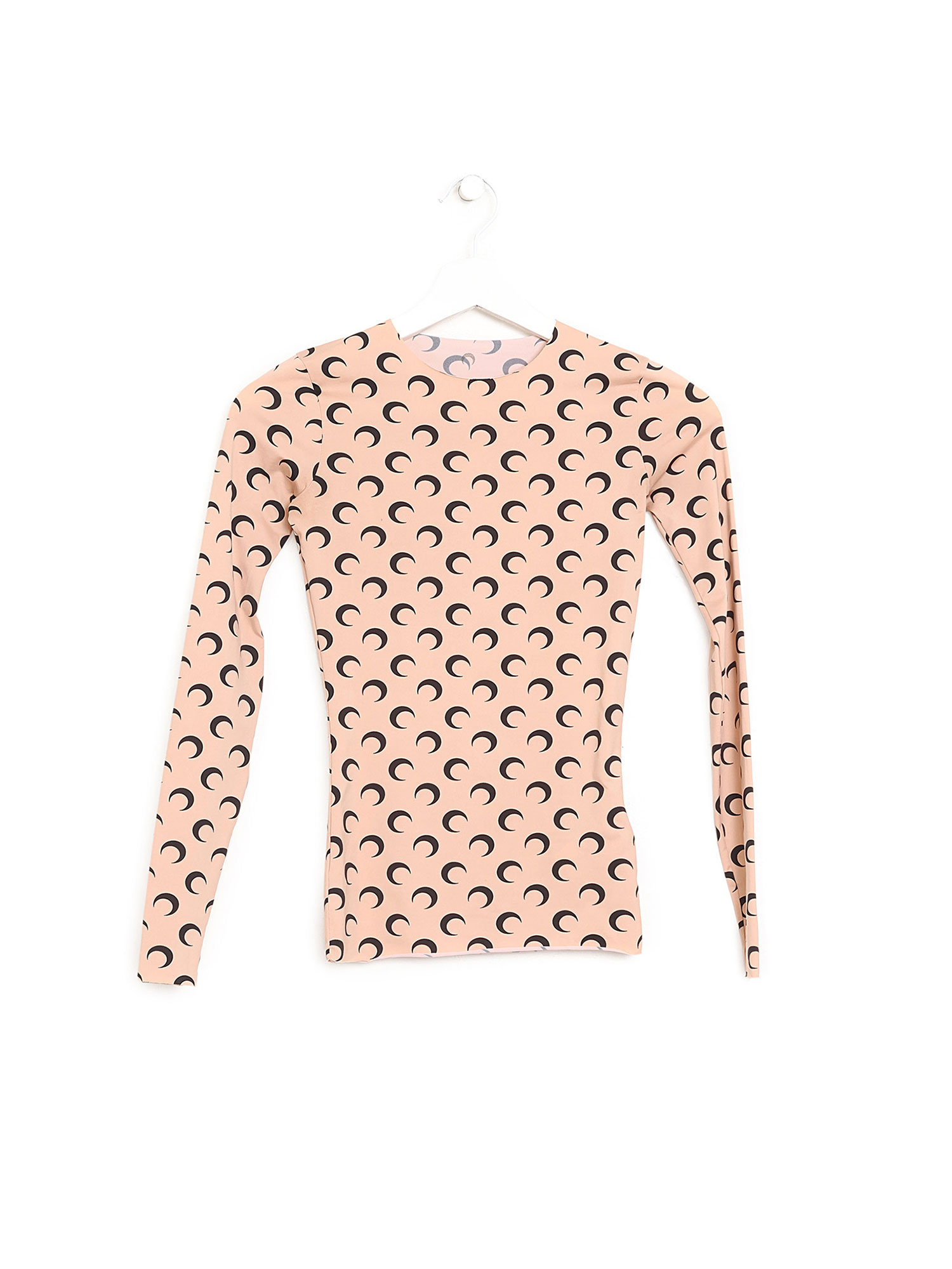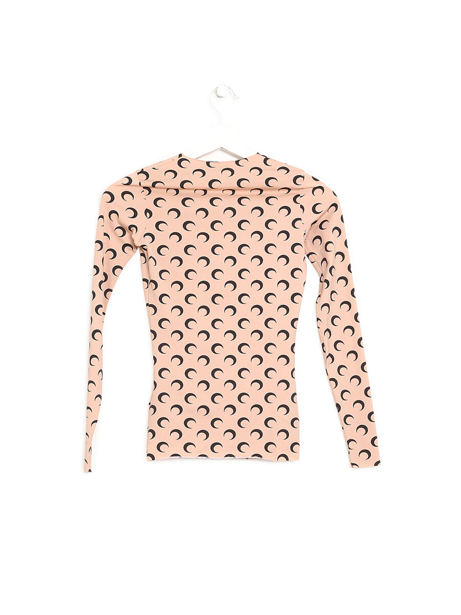 Long sleeve top in black and beige featuring moon motif throughout. Round collar.