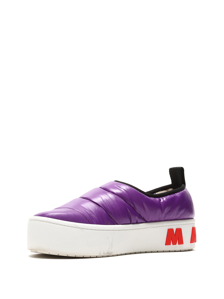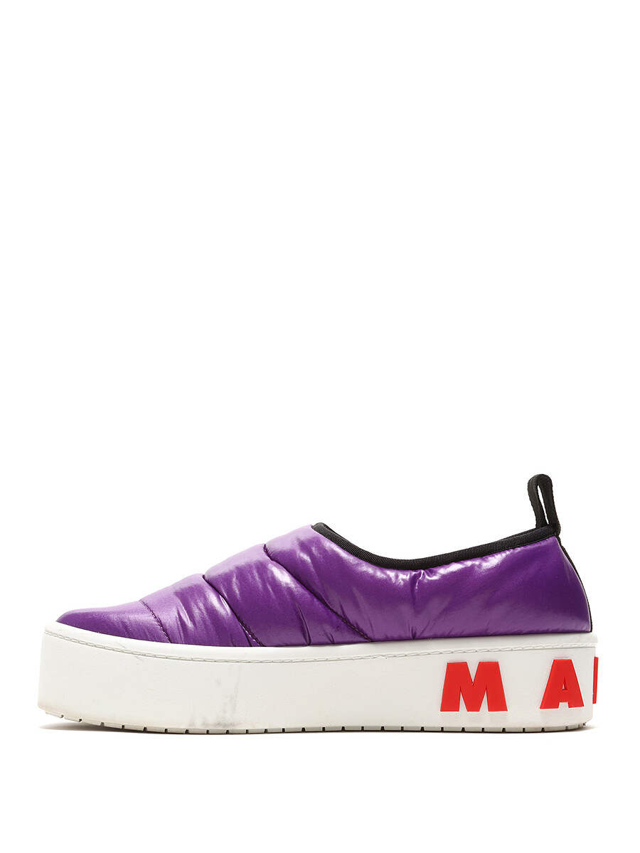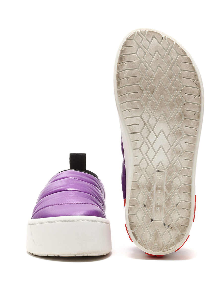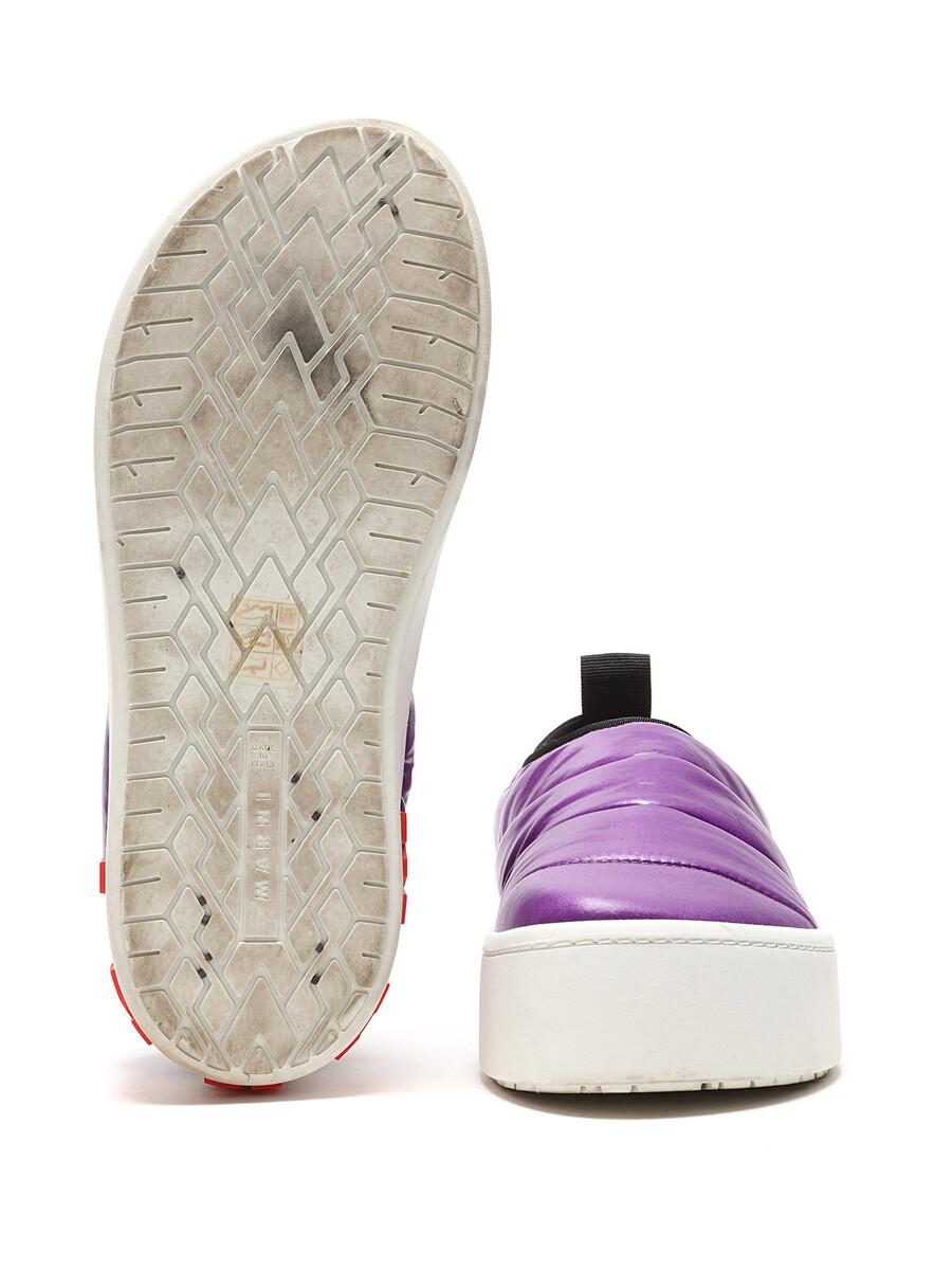 Quilted slip-on sneakers in purple and white. Closed round toe design with a comfortable slip-on closure. Featuring a durable rubber sole.