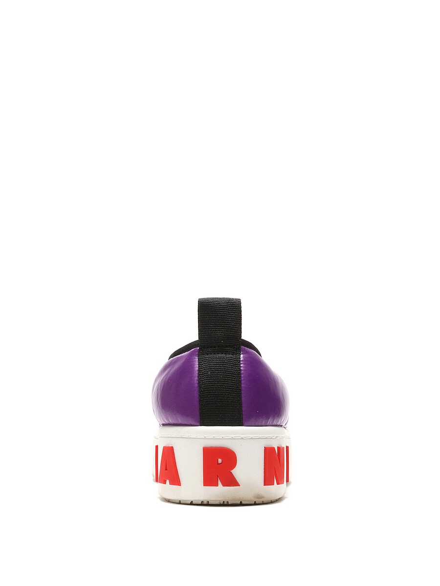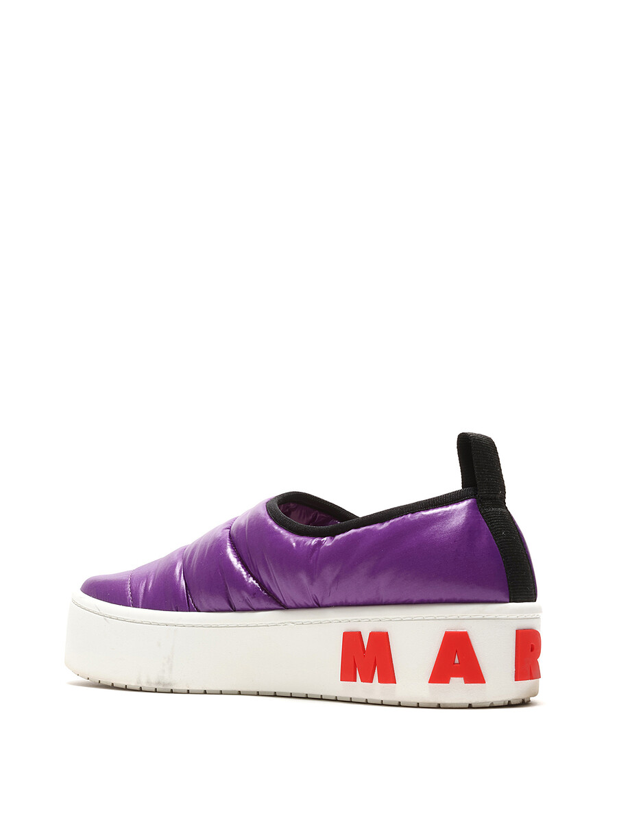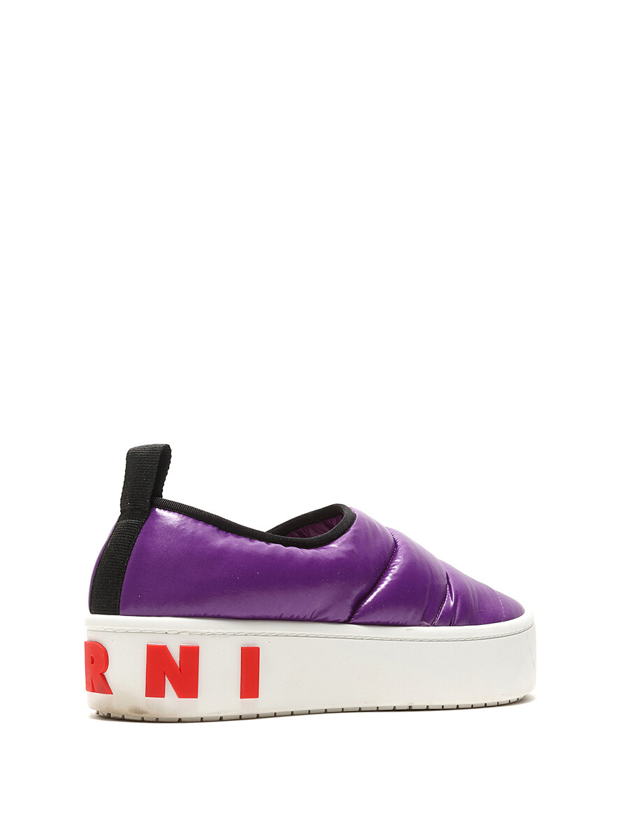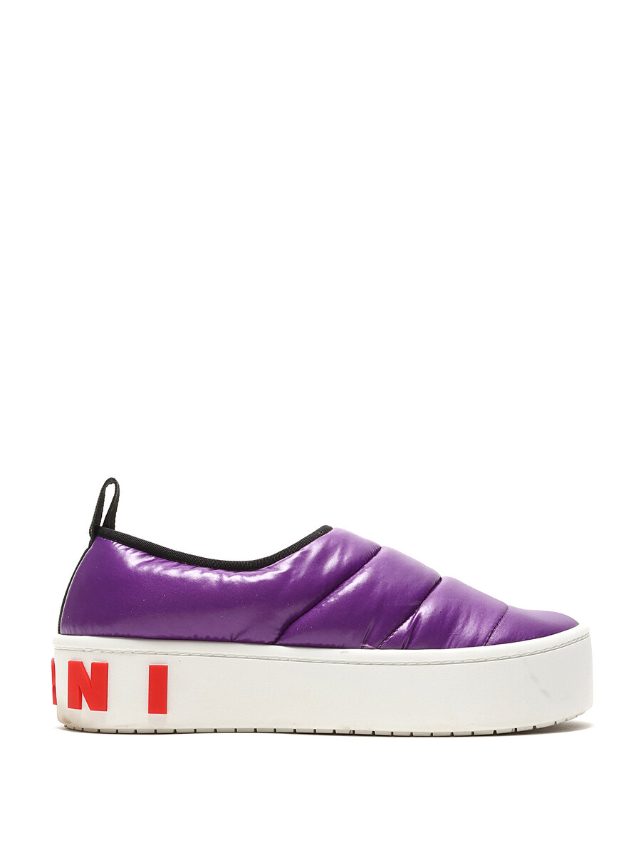 Quilted slip-on sneakers in purple and white. Closed round toe design with a comfortable slip-on closure. Featuring a durable rubber sole.