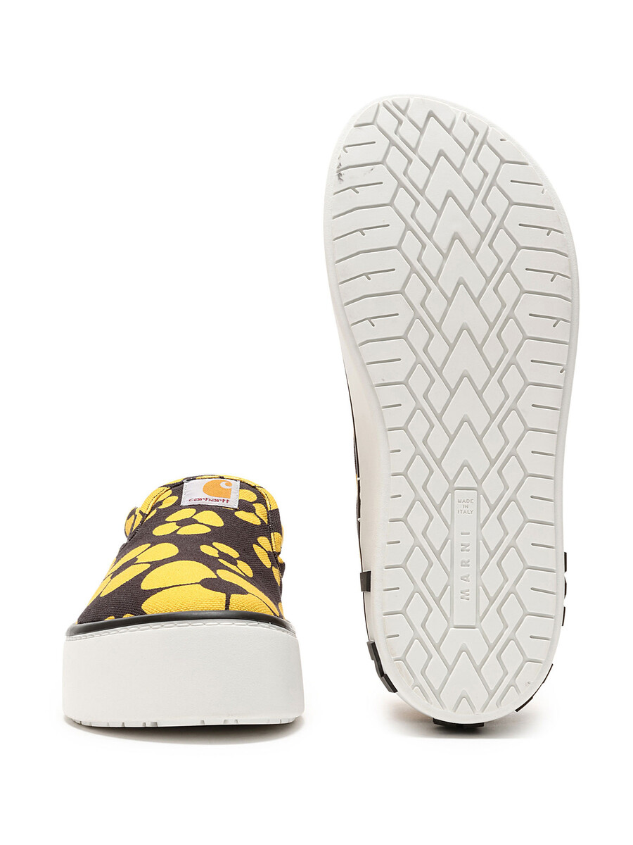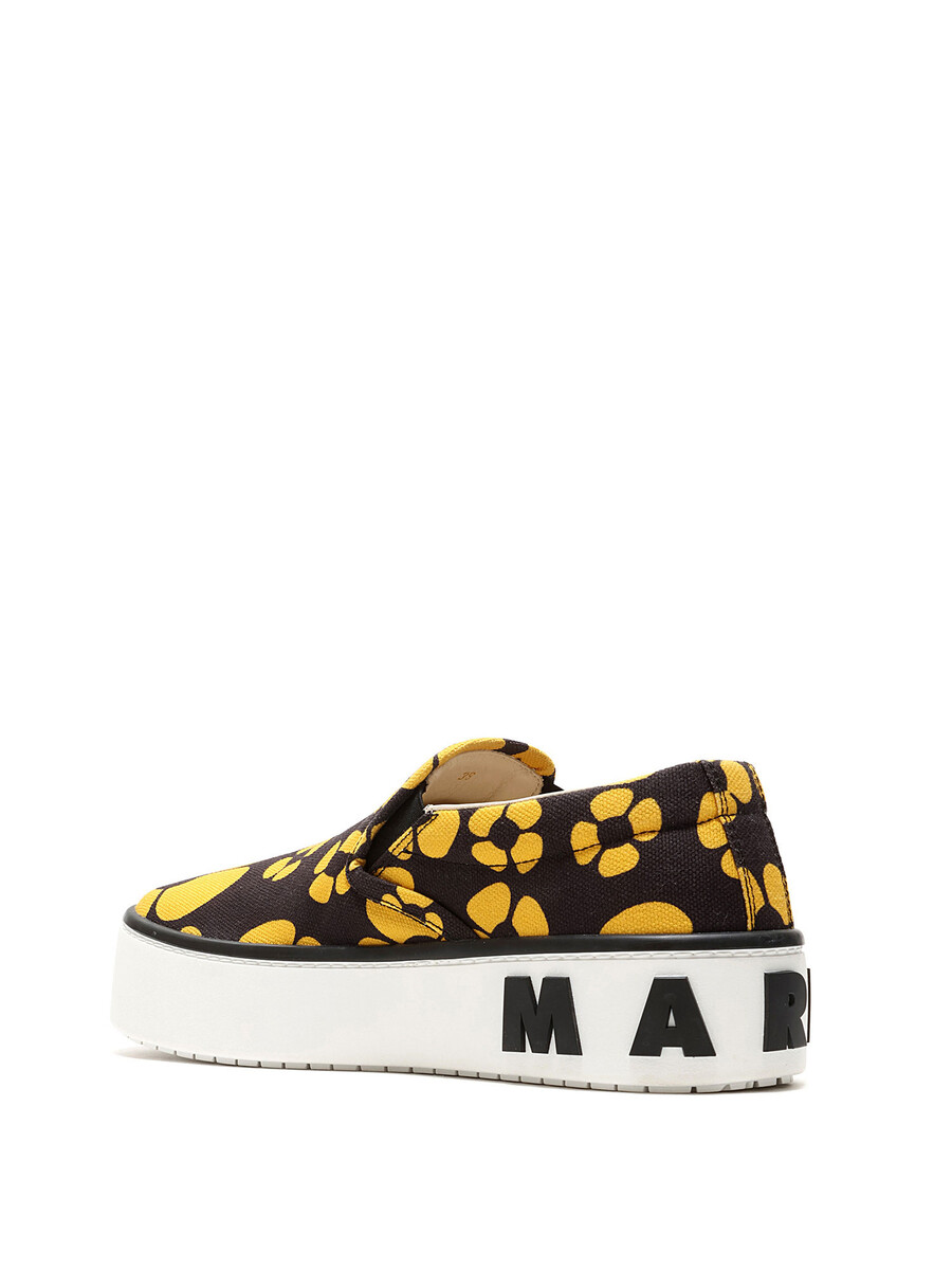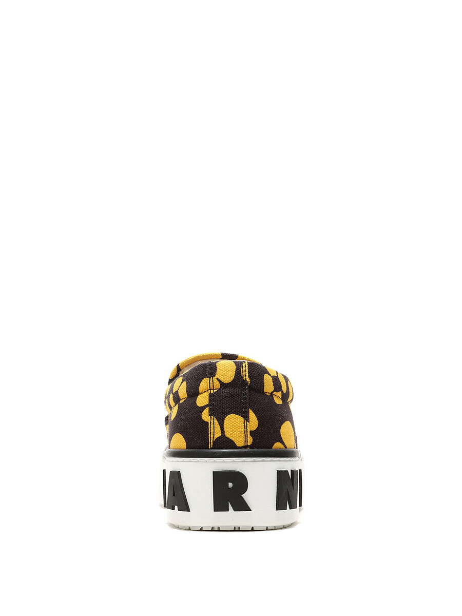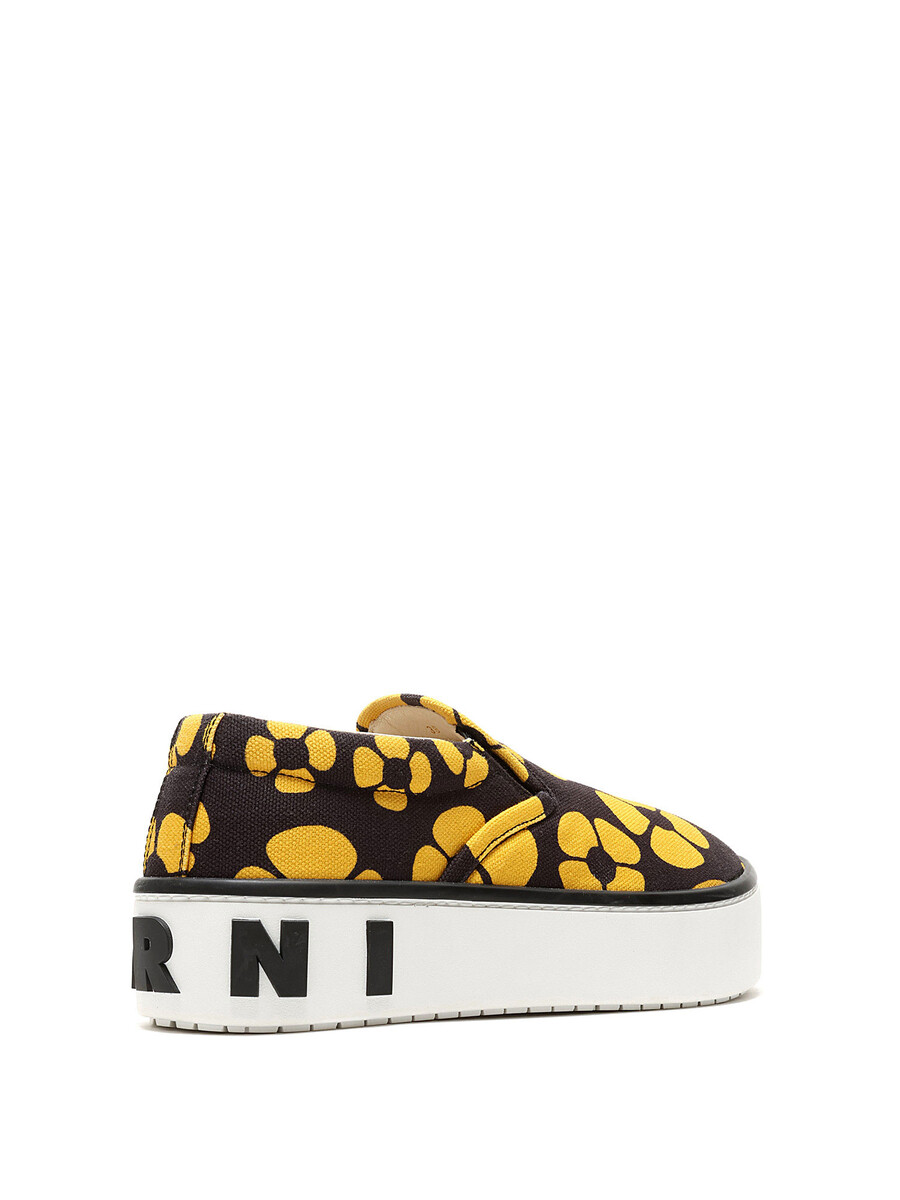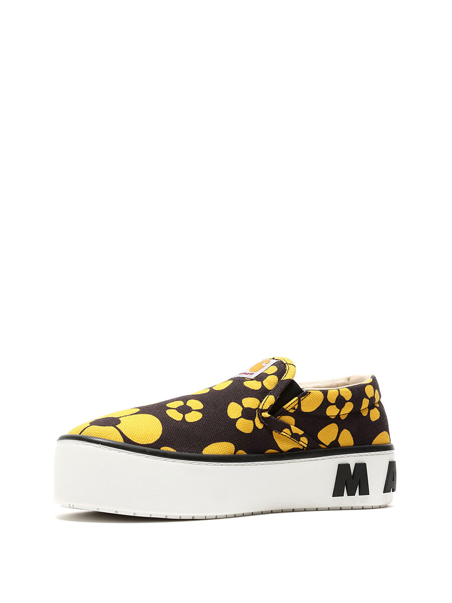 Slip-on sneakers with a vibrant floral print in black and yellow. Featuring a closed round toe and rubber sole.