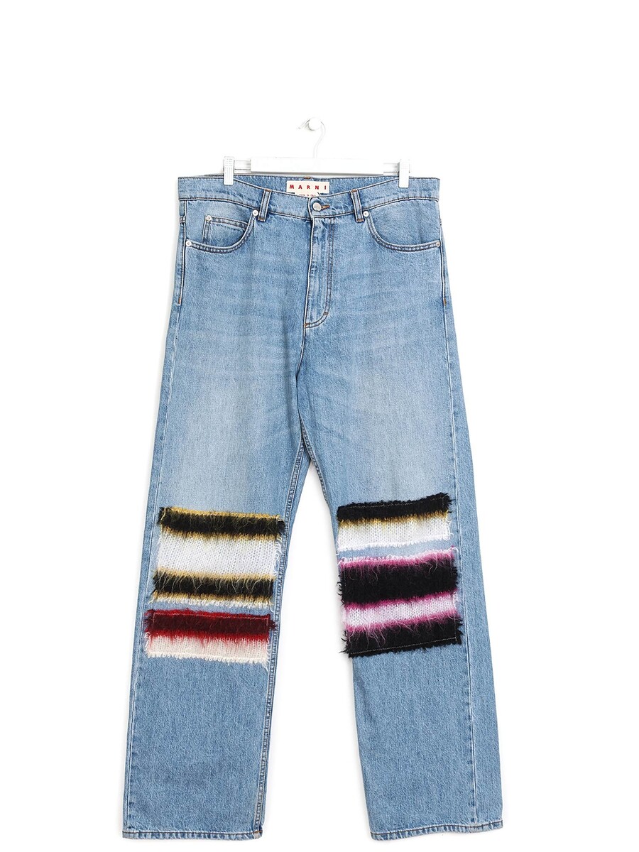 Wide-leg jeans featuring abstract mohair stripe patches. Mid-rise waist with button-front closure. Patch pockets at the back.