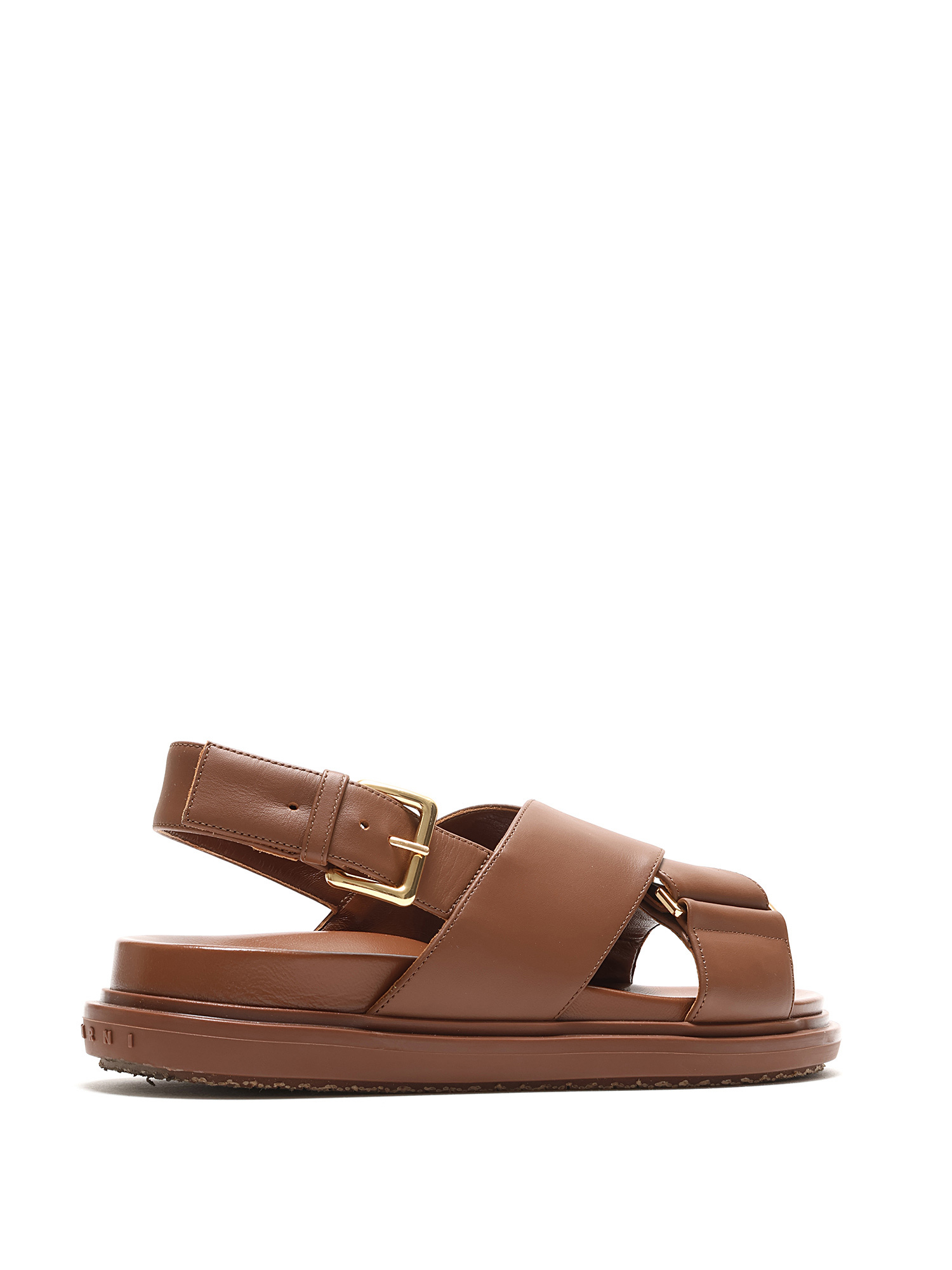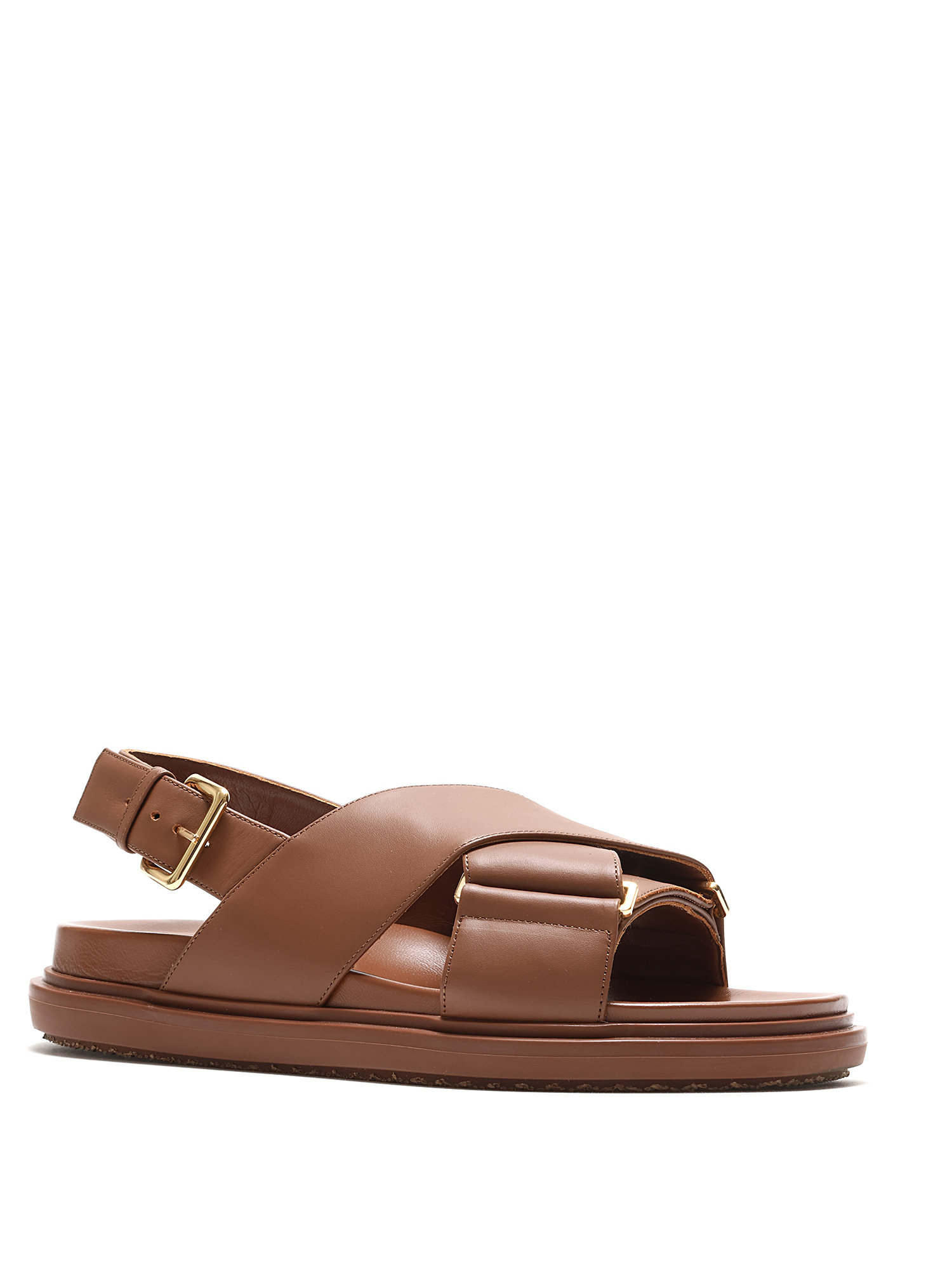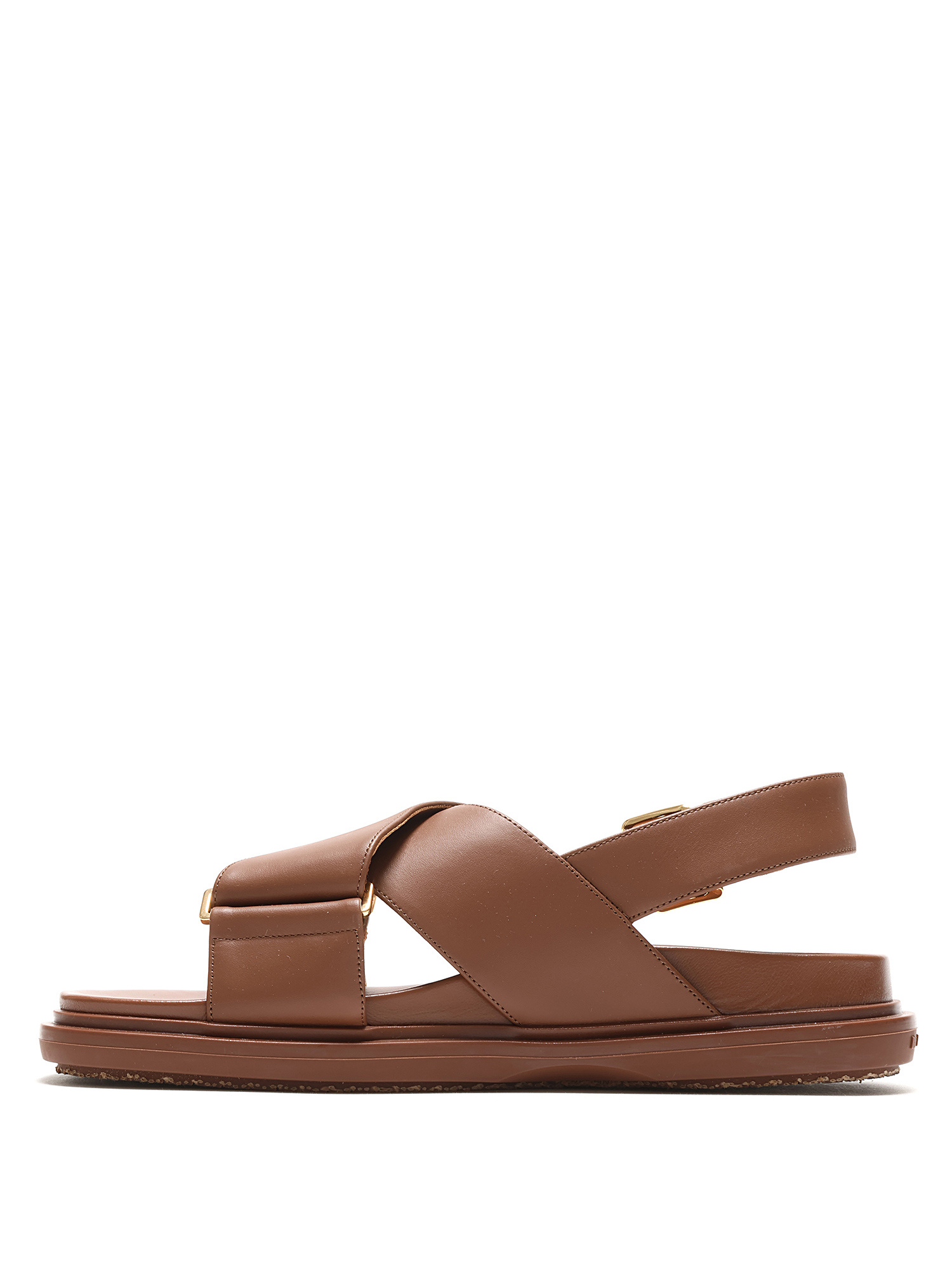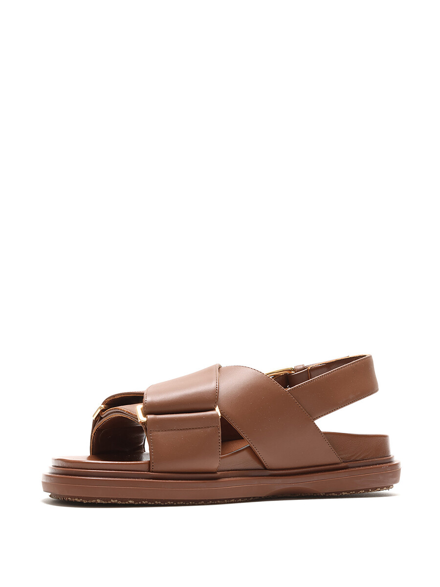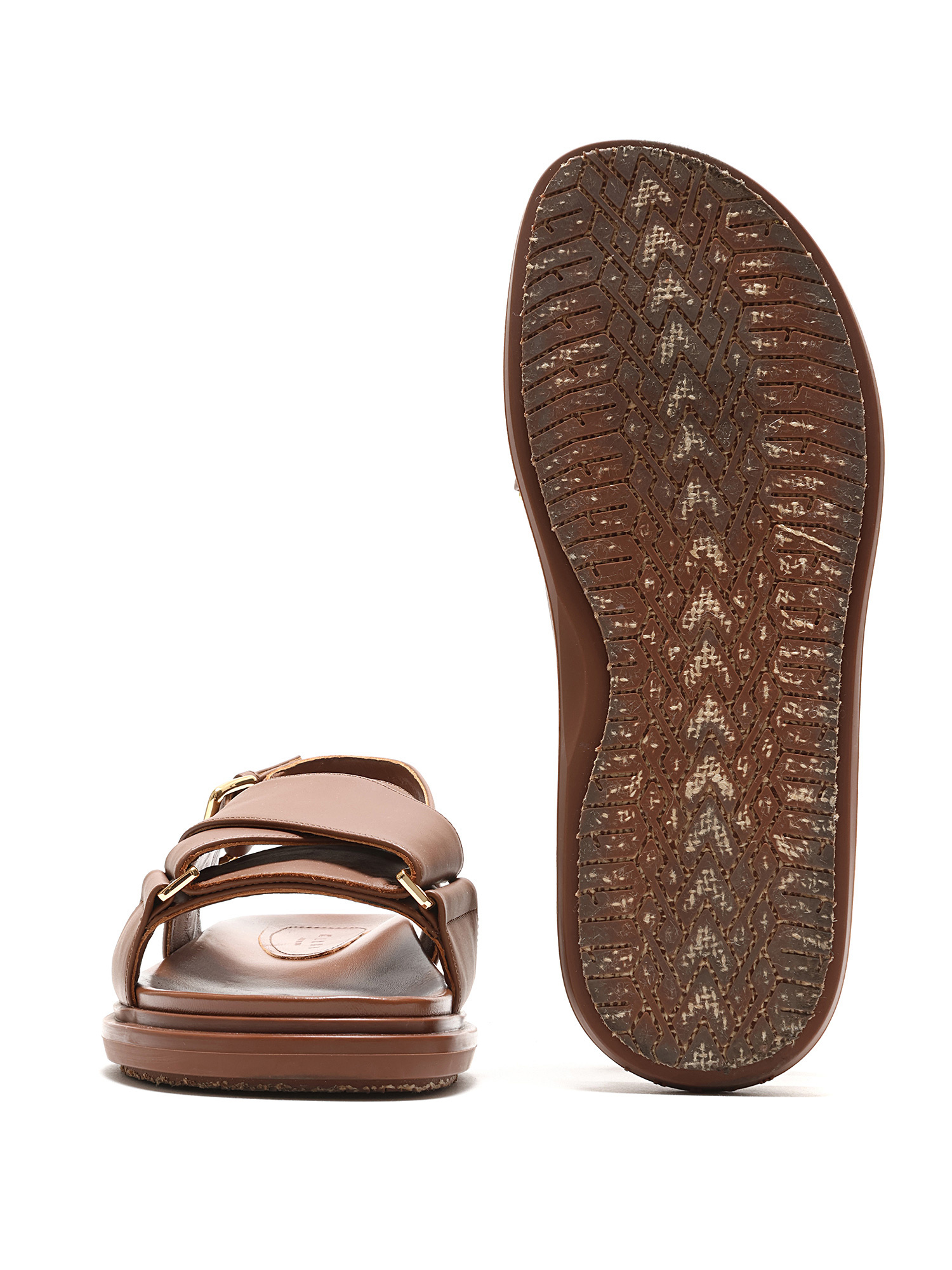 Open toe brown leather sandals with an adjustable buckle closure. Gold-tone metal hardware, featuring rubber soles. With box.