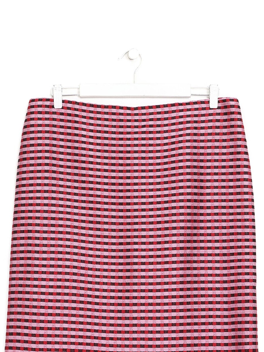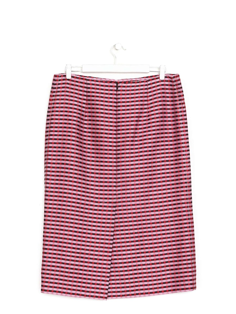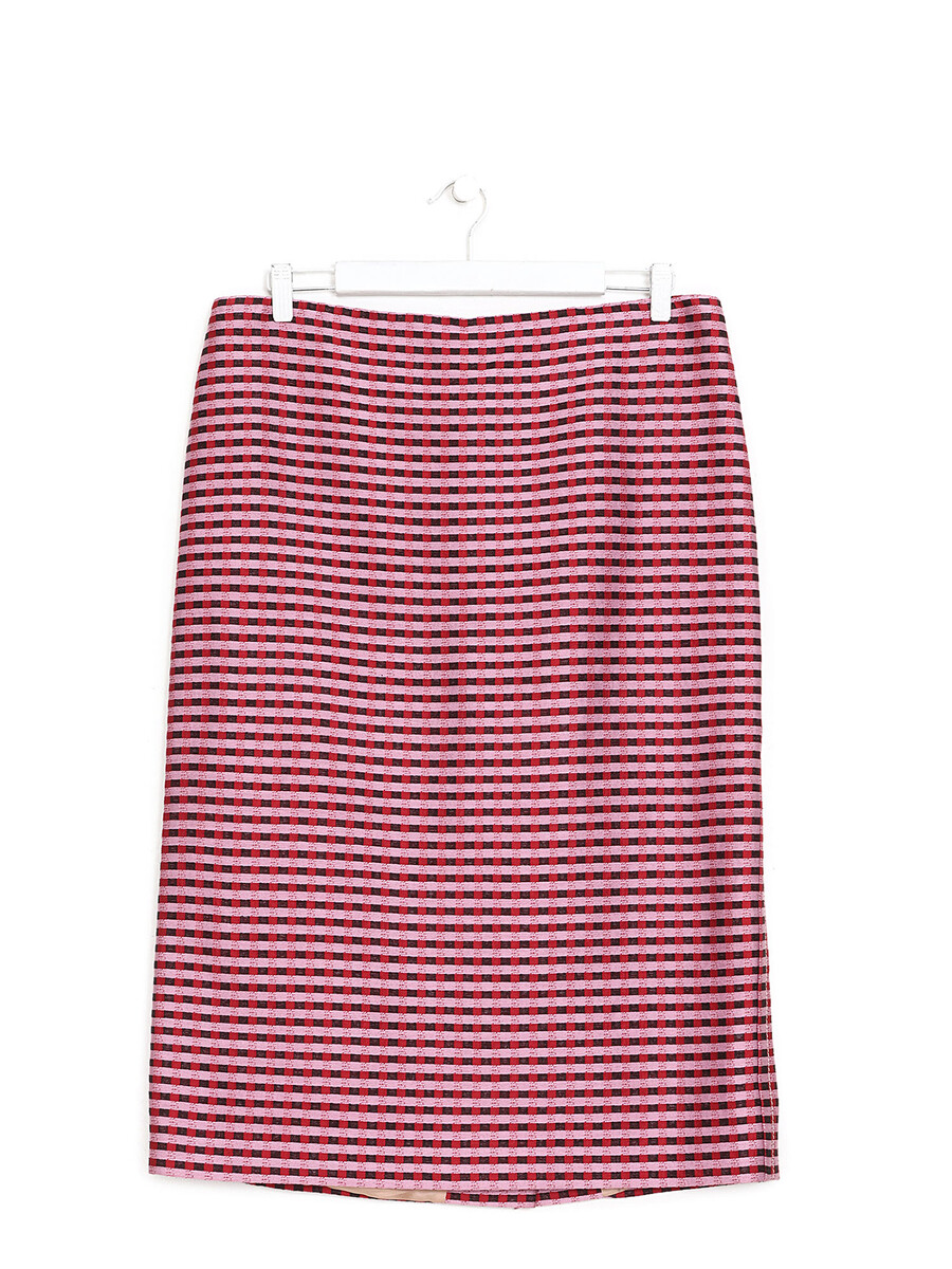Mid-length plaid skirt in shades of purple, red, and pink. Features a zipper closure.
