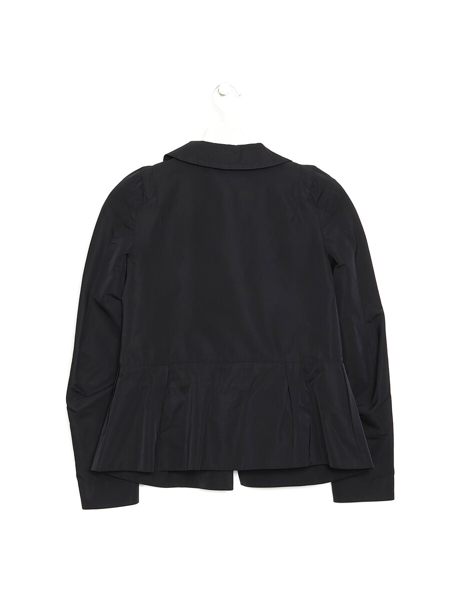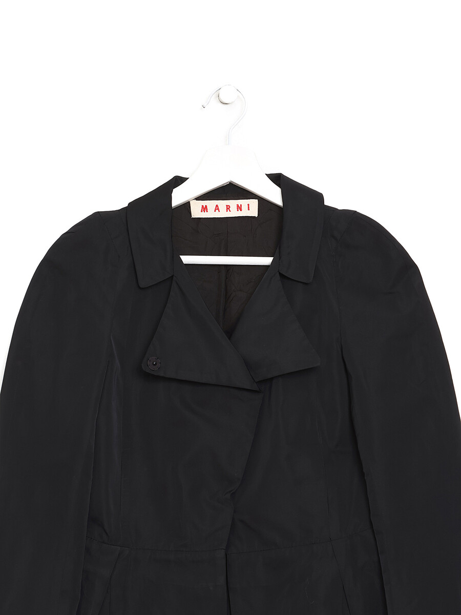Asymmetrical button-down short coat in black. High collar. Lightweight texture. Tailored fit.