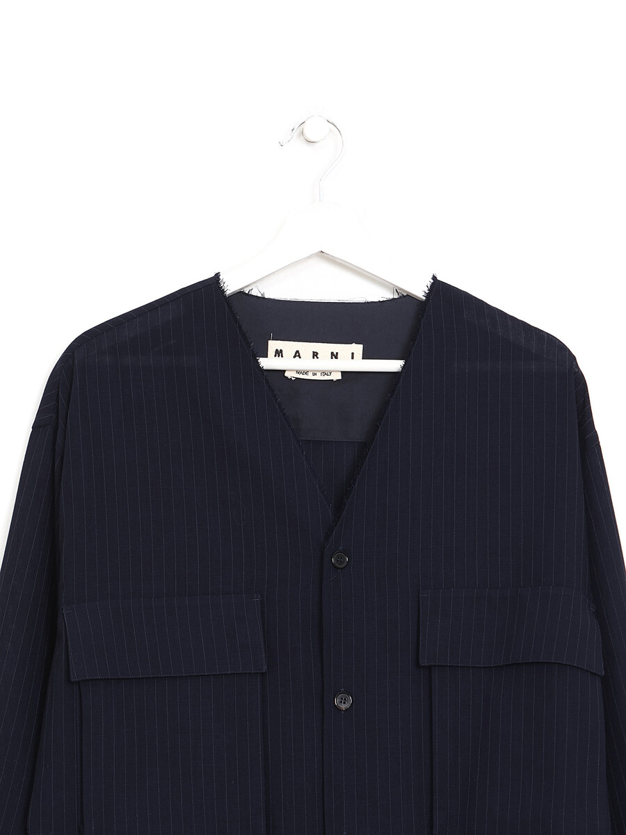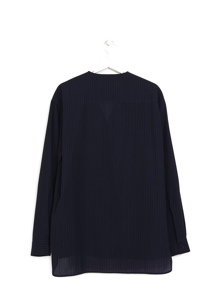 Long sleeve striped shirt in midnight blue and gray tones. Frayed V-neck collar adds a unique, slightly edgy touch. Features two patch pockets and a button-down front.