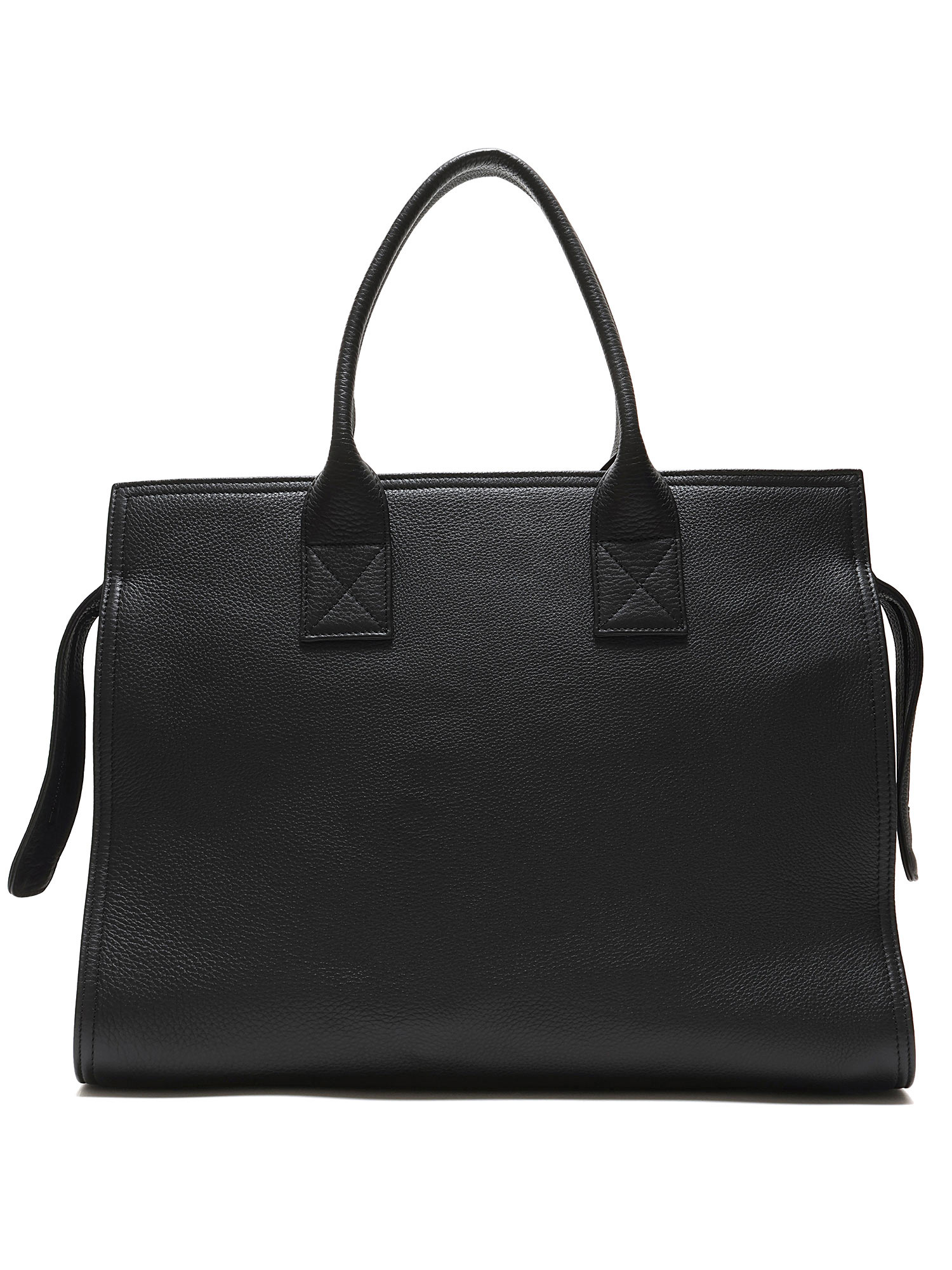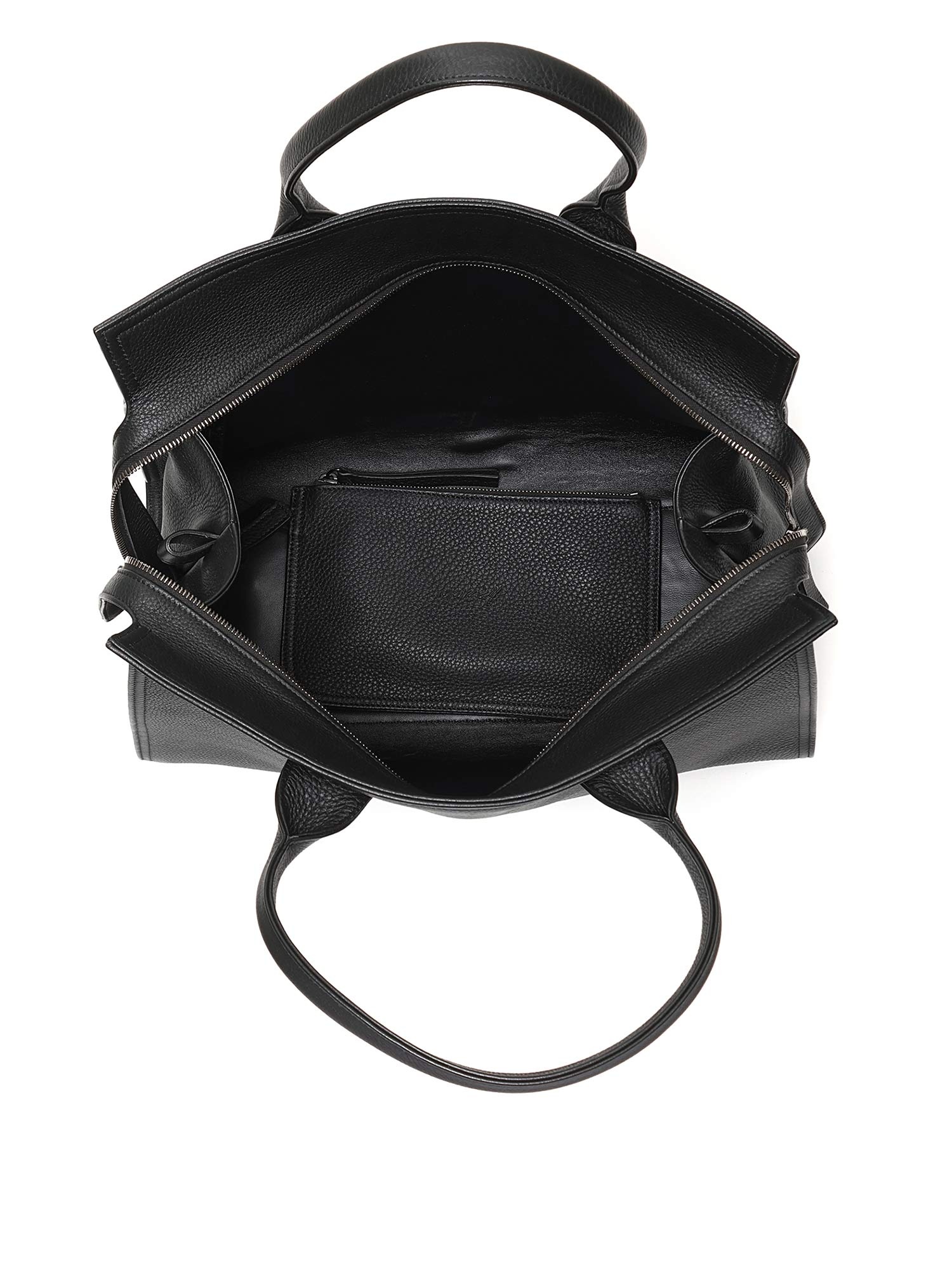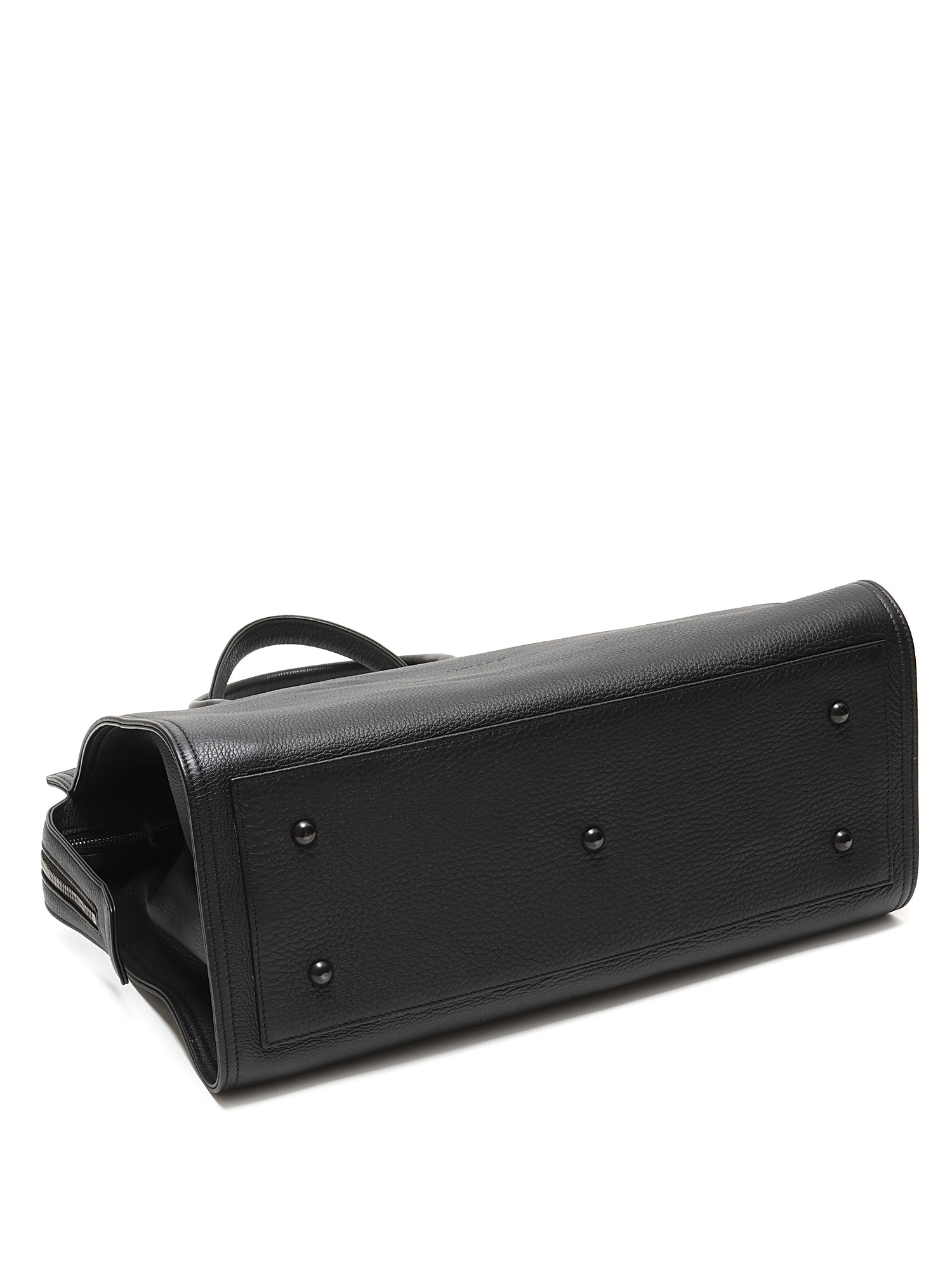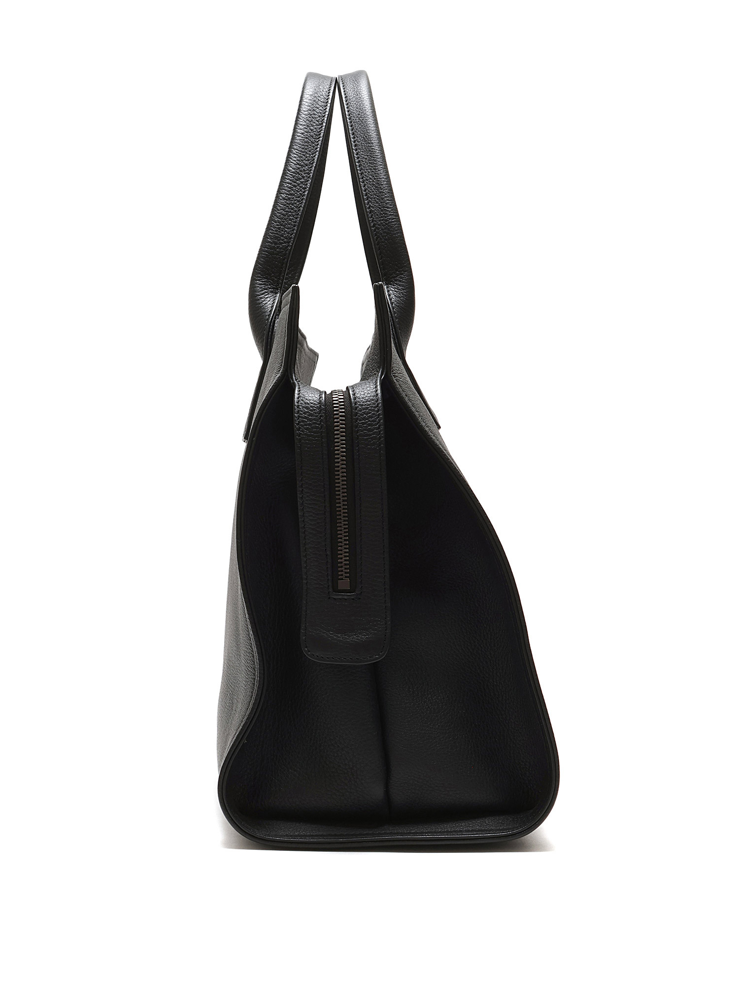 Black leather tote bag featuring a zipper closure, double leather handles, and silver-tone hardware. Includes a pouch and adjustable shoulder strap. Comes with a dust bag.