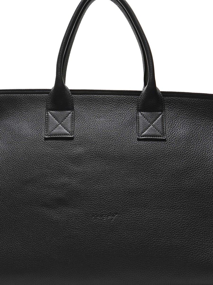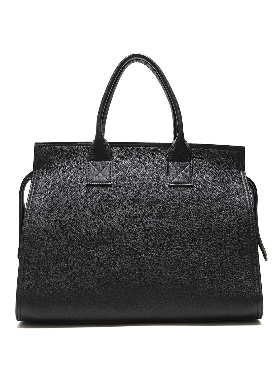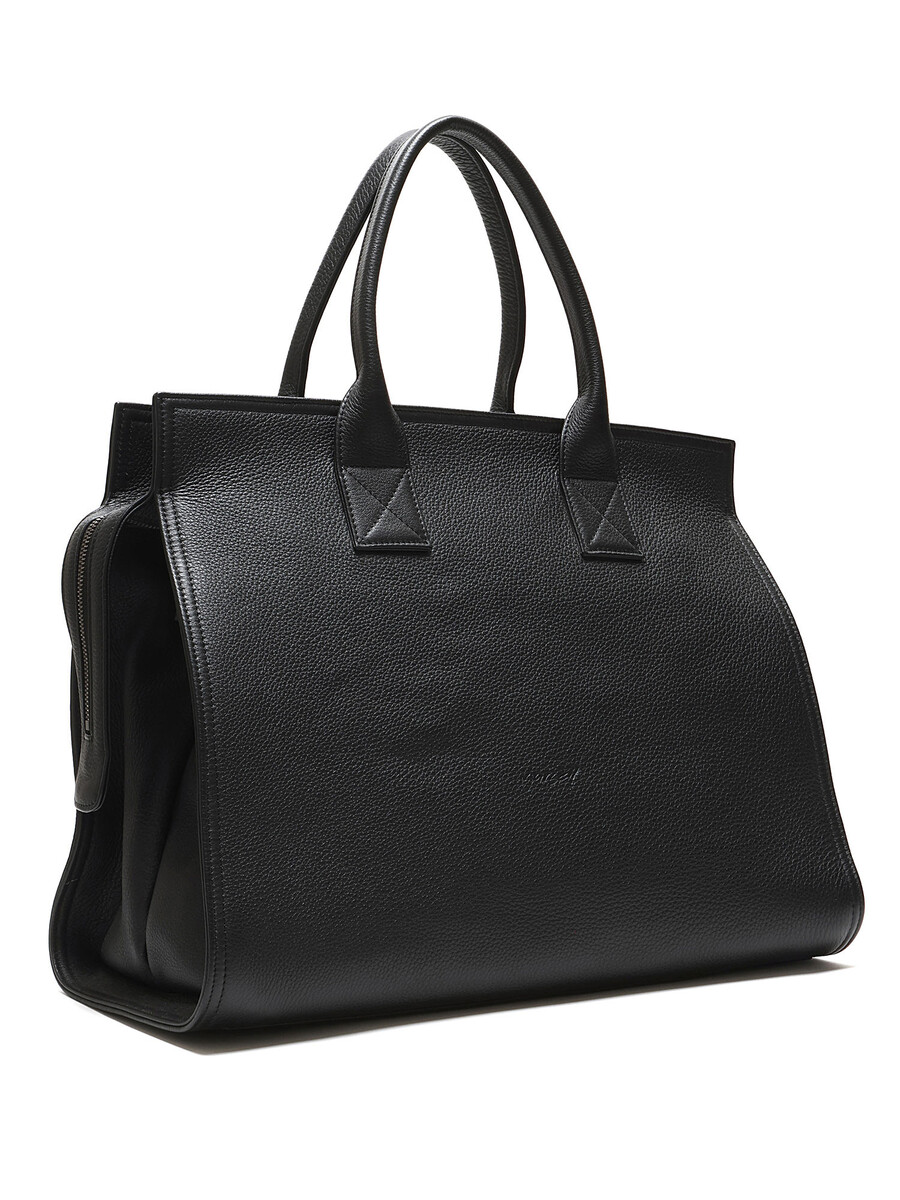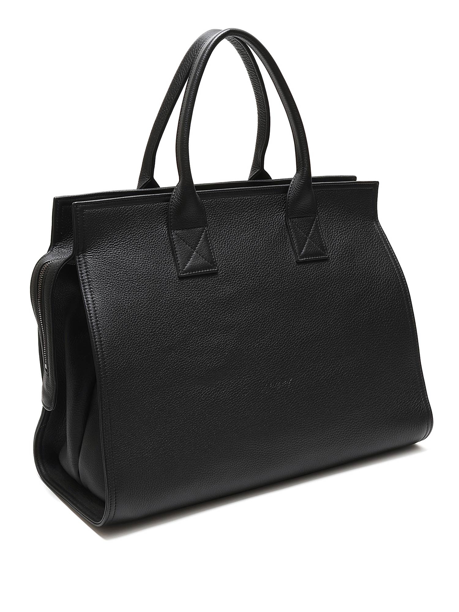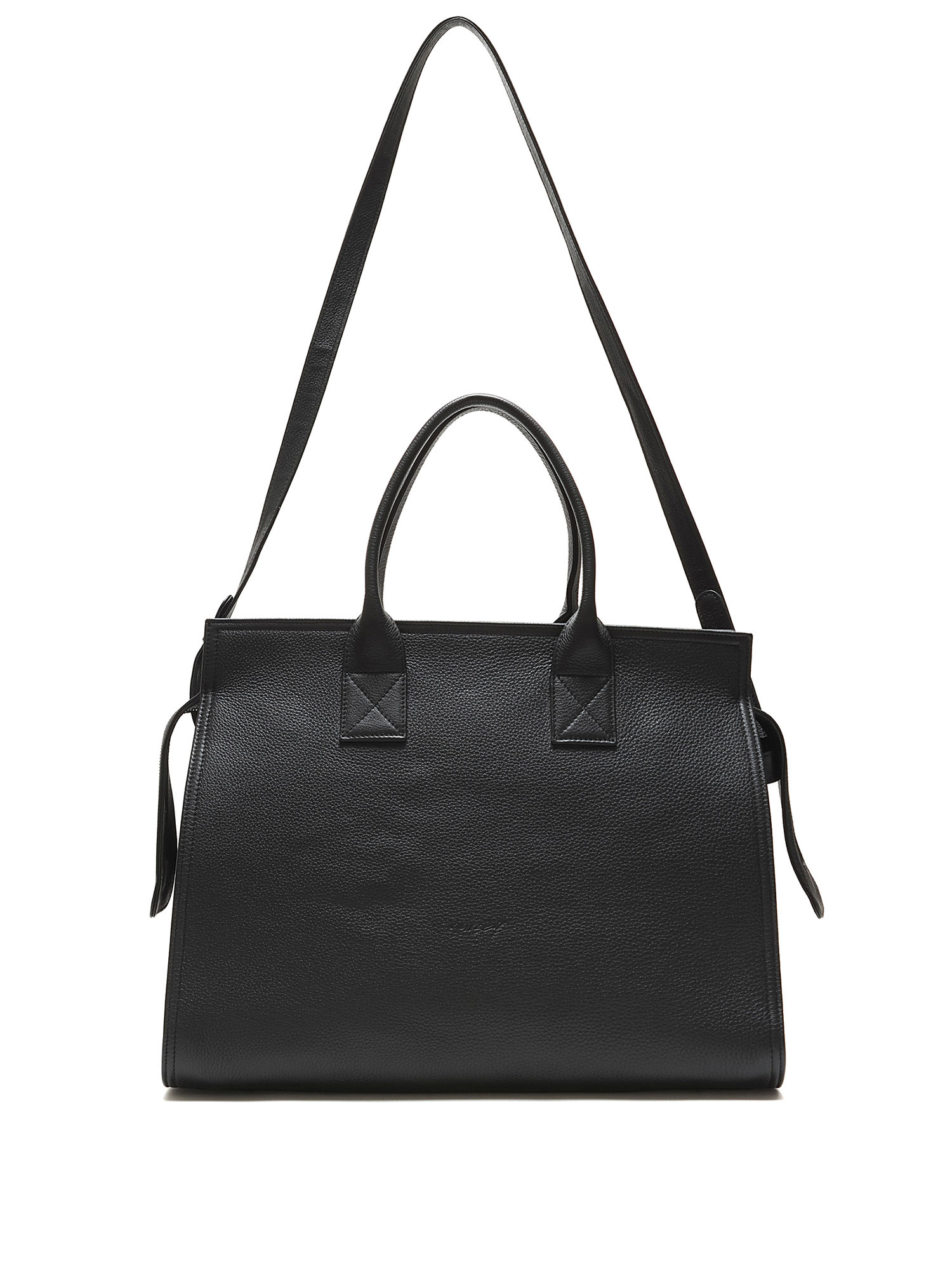Black leather tote bag featuring a zipper closure, double leather handles, and silver-tone hardware. Includes a pouch and adjustable shoulder strap. Comes with a dust bag.