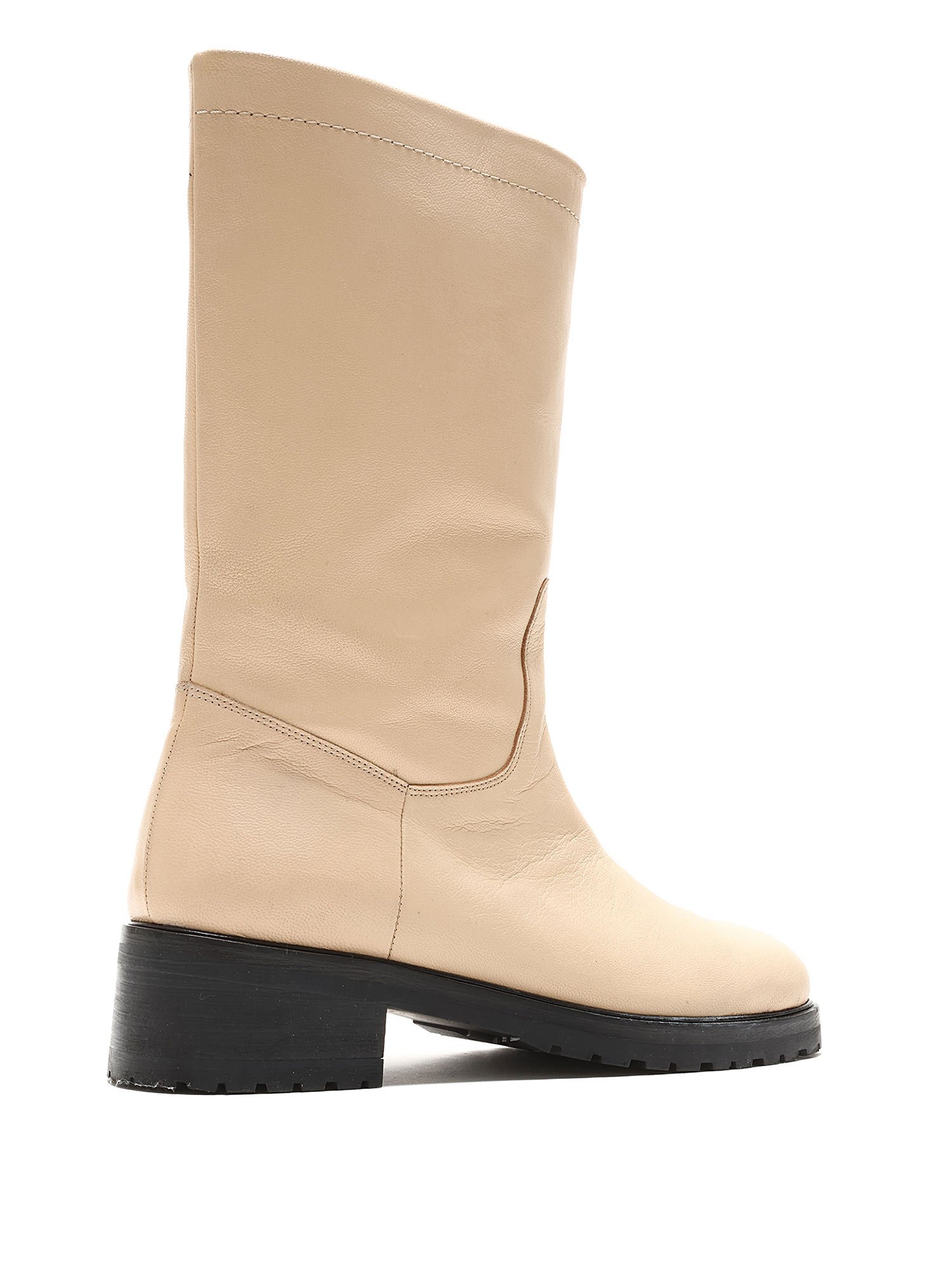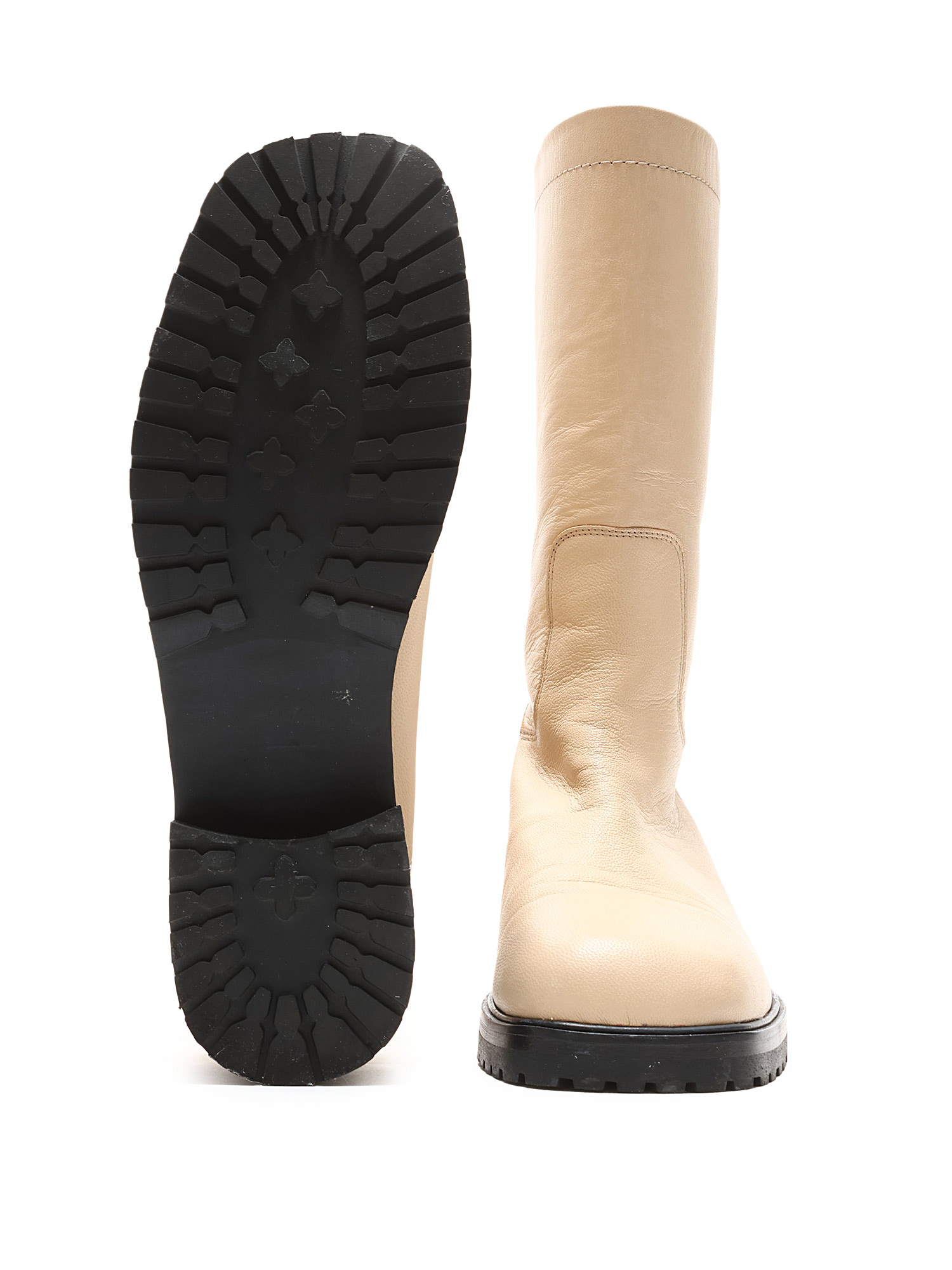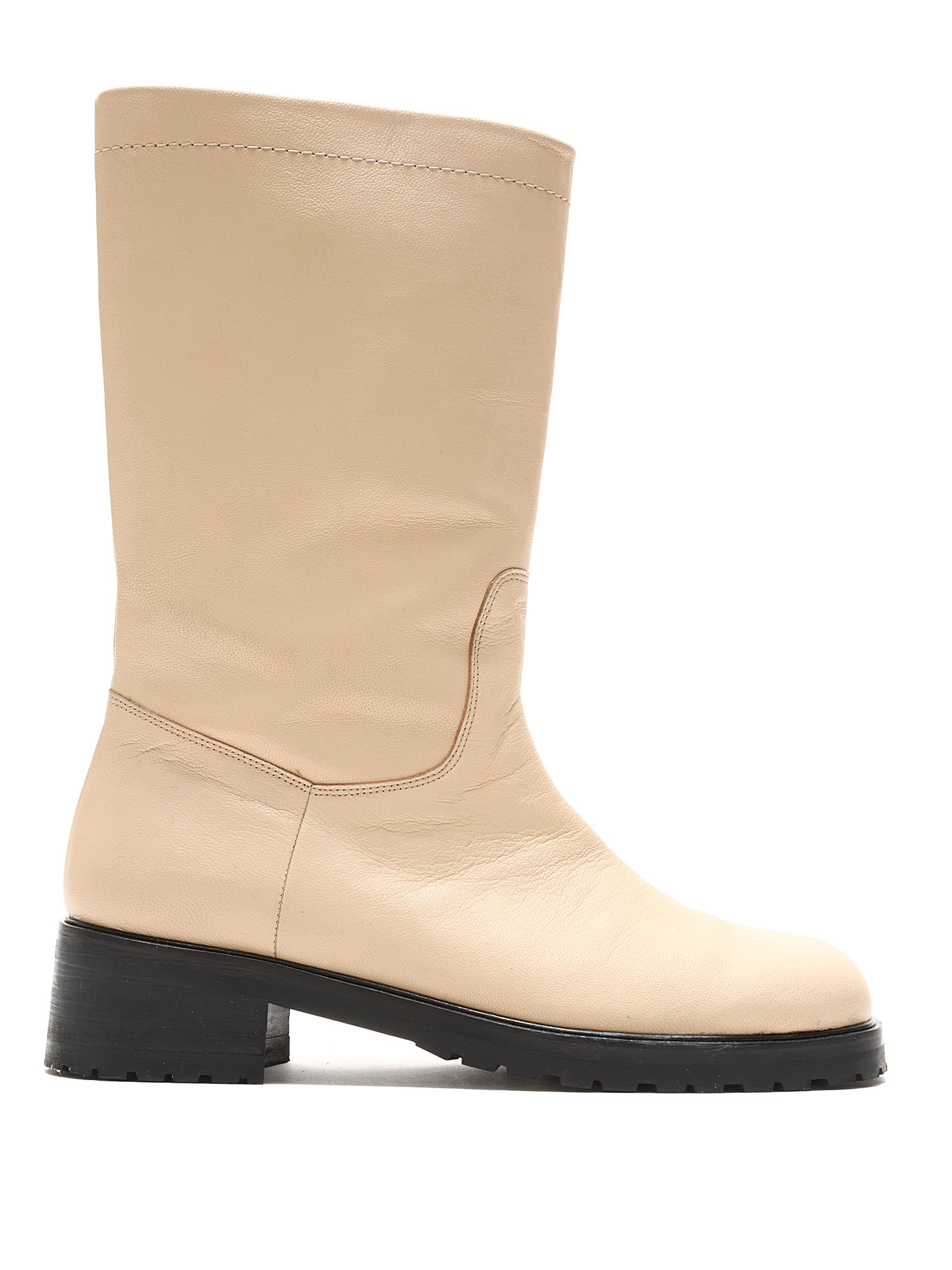 Grained leather boots in beige. Square toe design. Lug rubber sole for durability and traction.