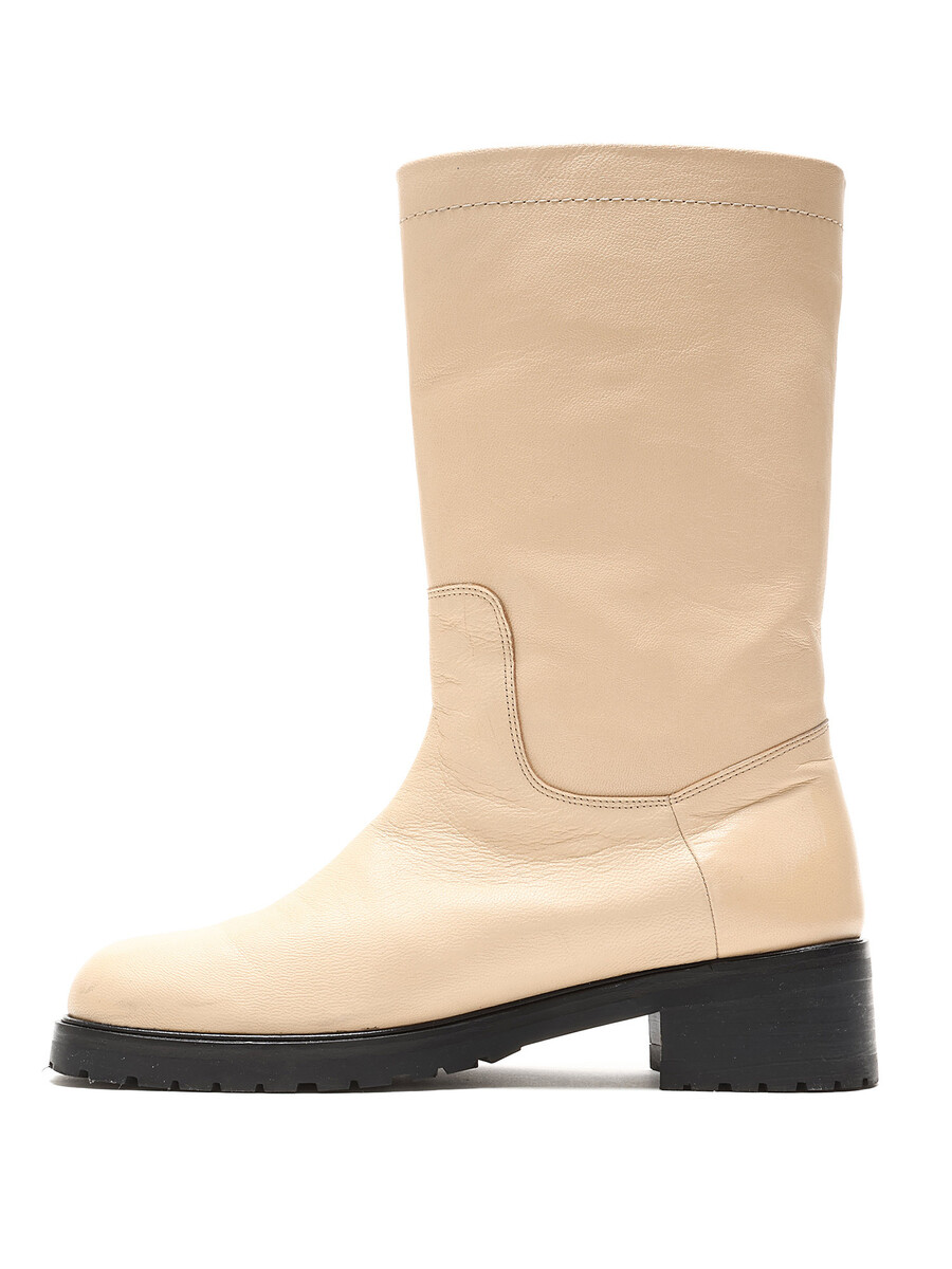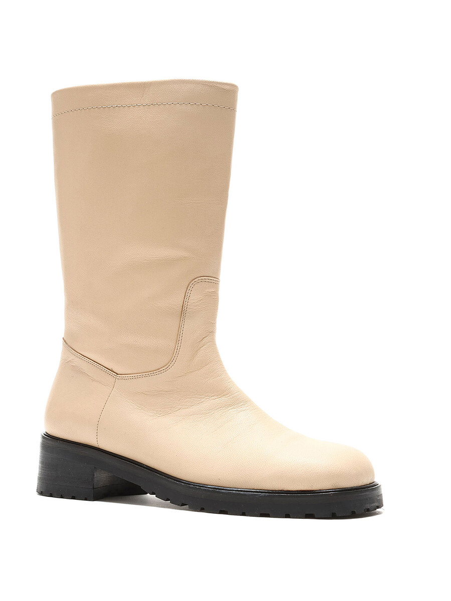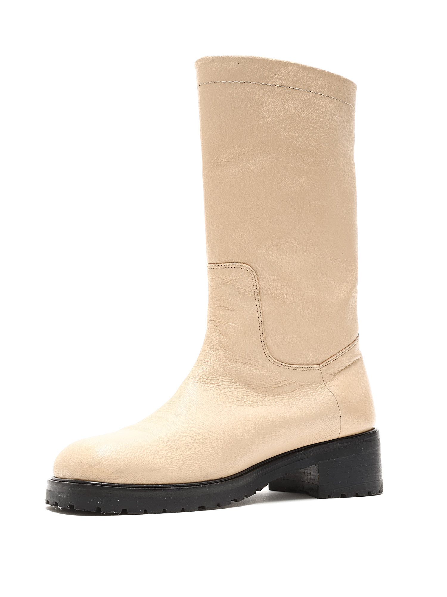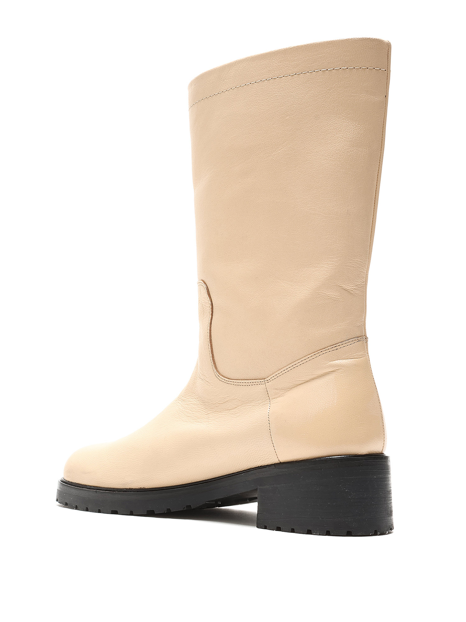 Grained leather boots in beige. Square toe design. Lug rubber sole for durability and traction.