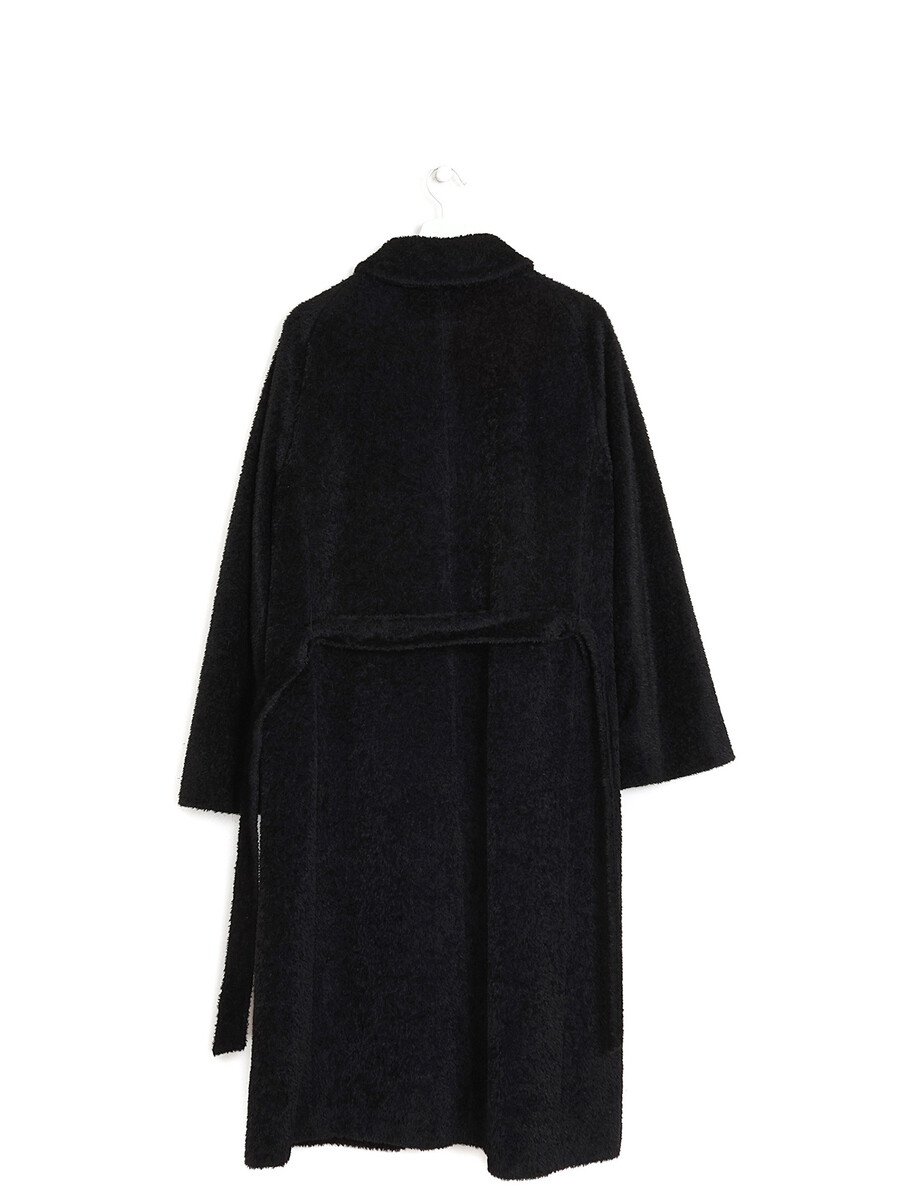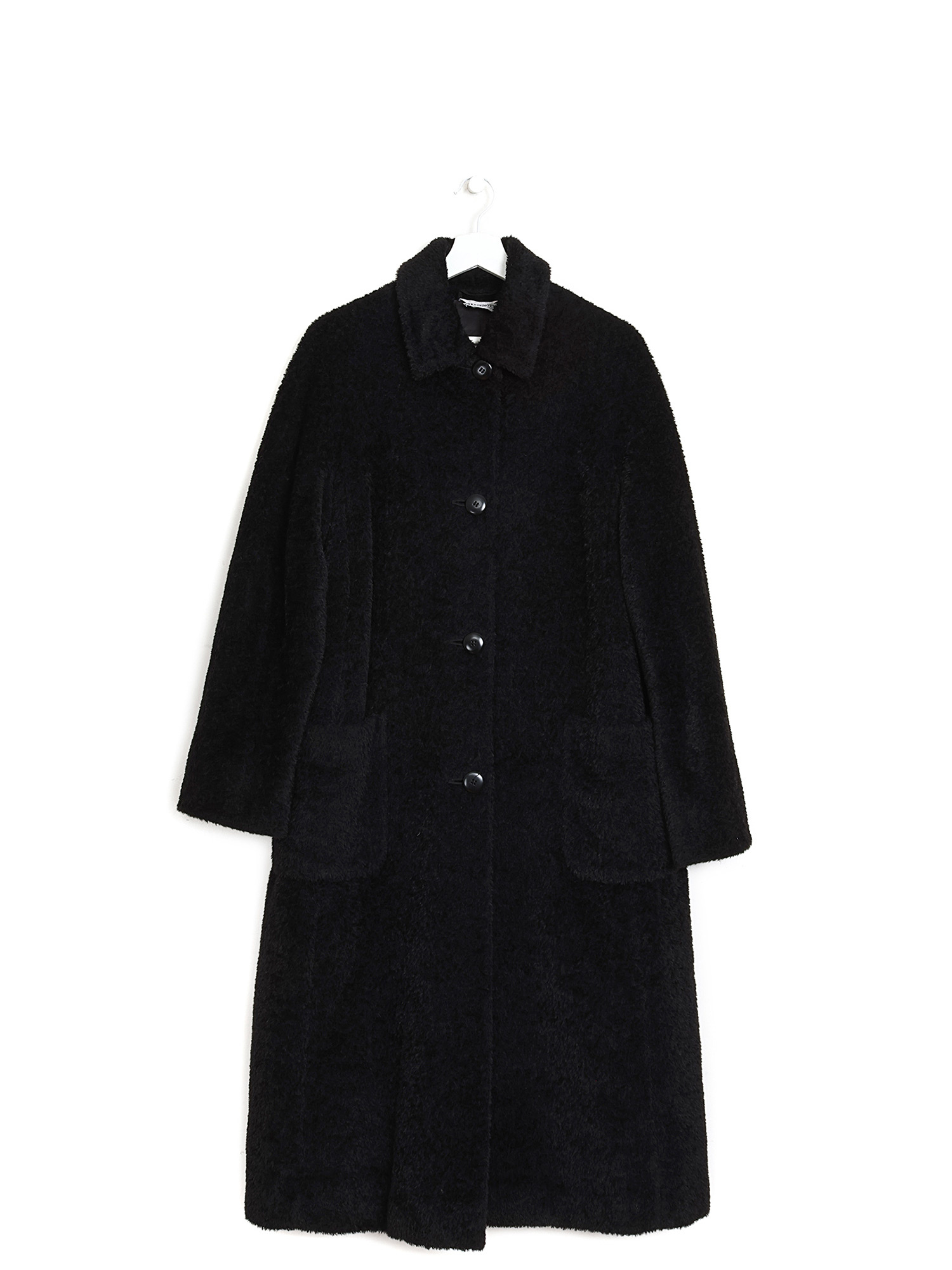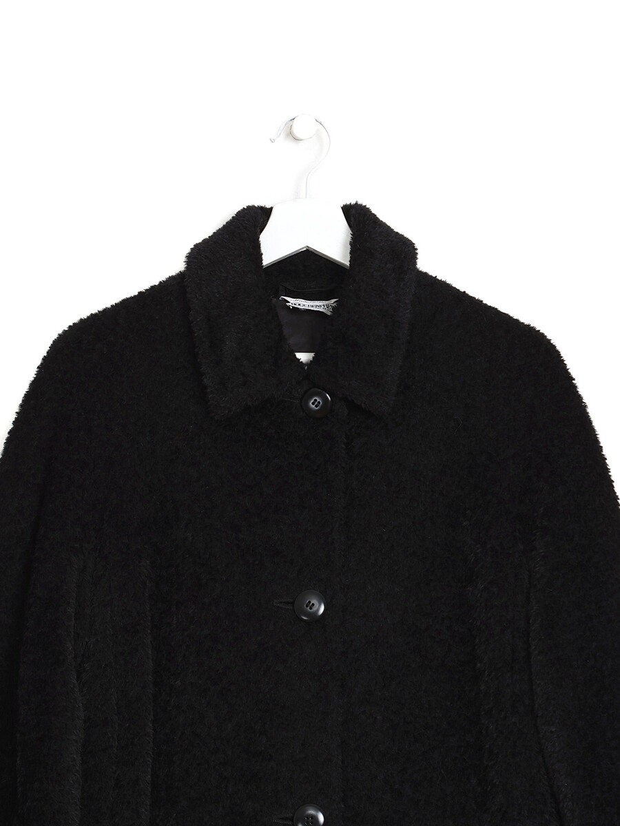 Long black short-pile coat with button closure. High collar. Front patch pockets.