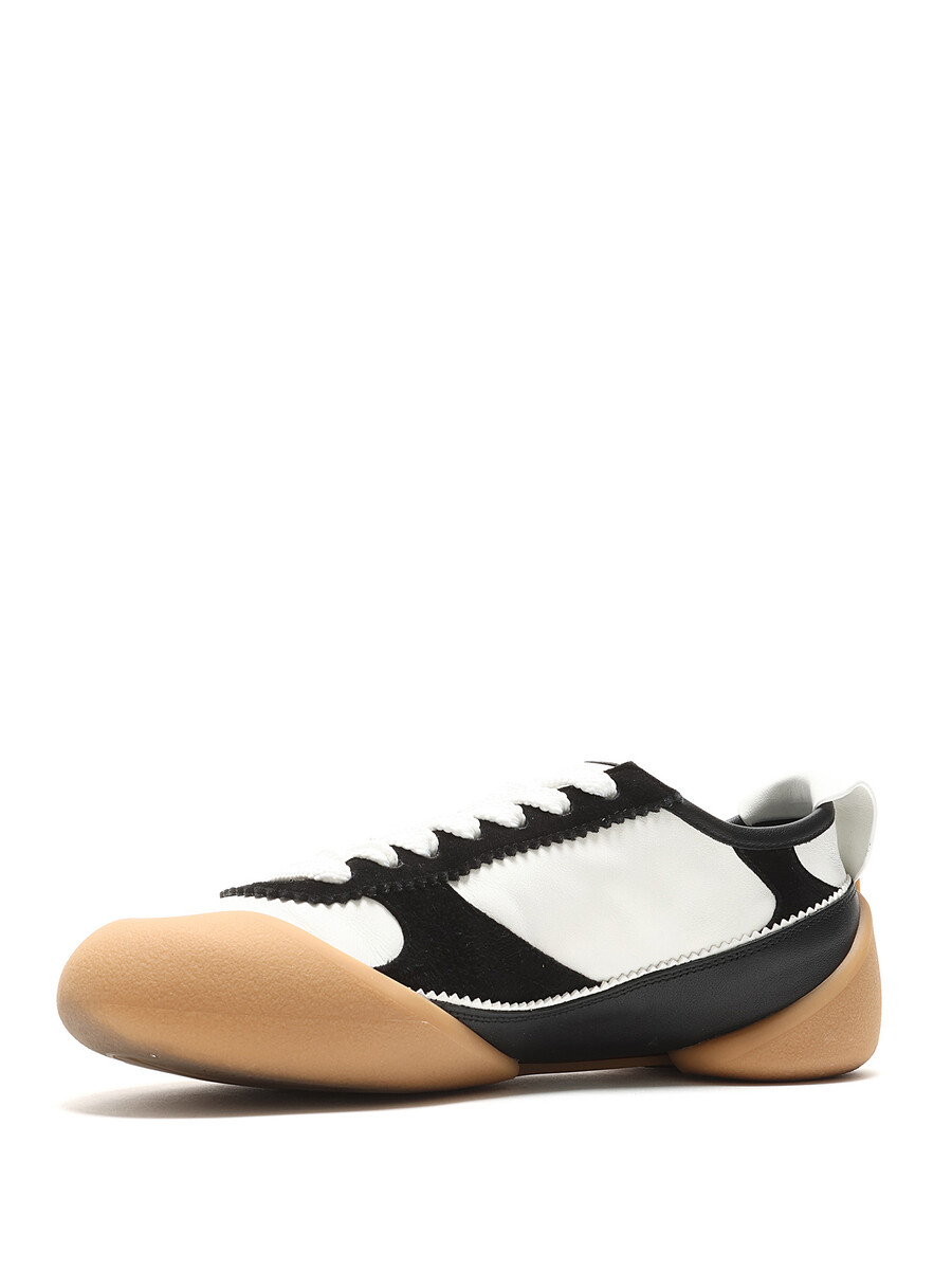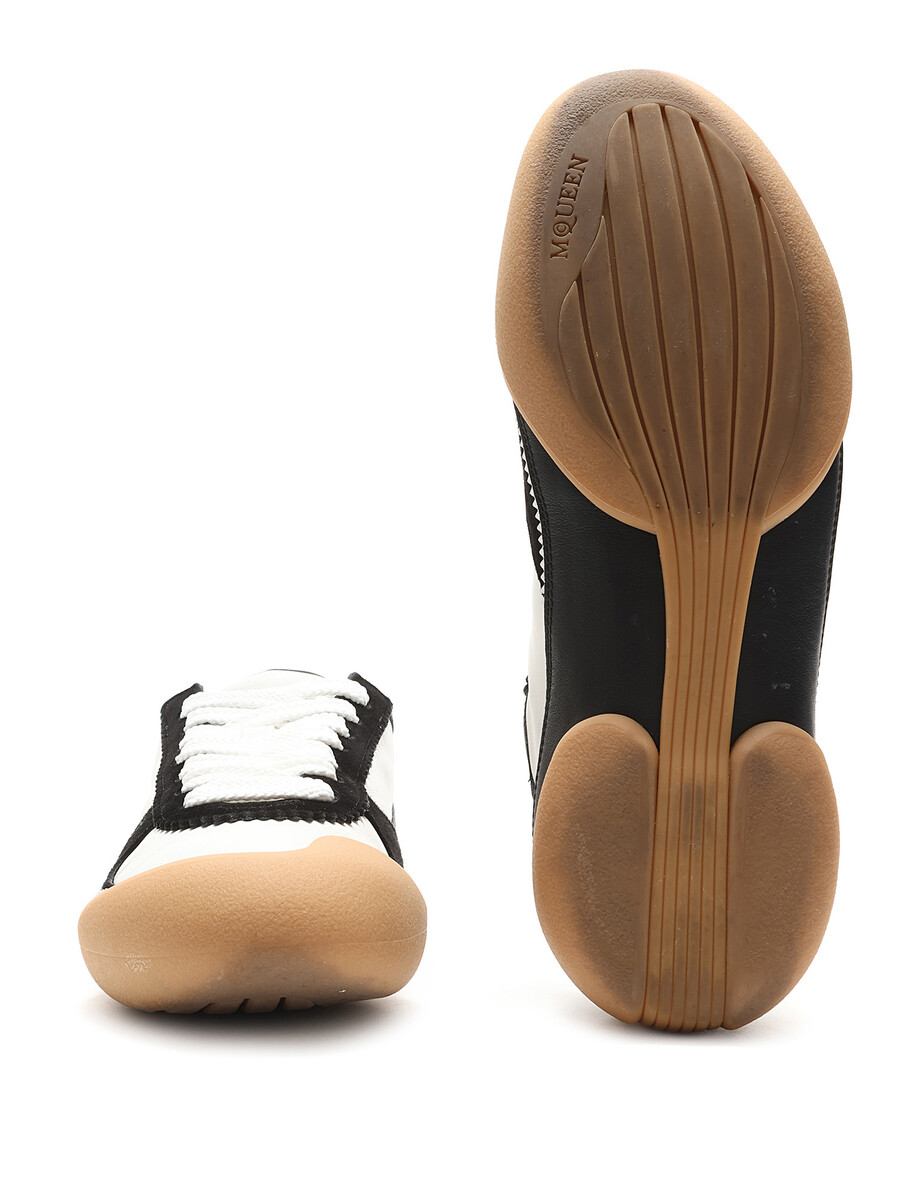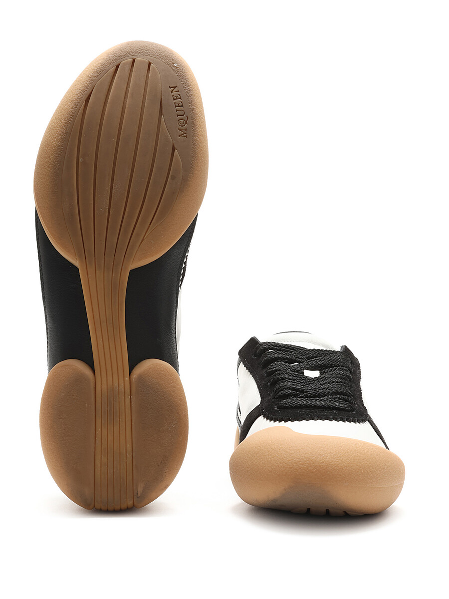 High-top leather and fabric sneakers with a bi-color design featuring a contrast sole in black, white, and tan. Round toe. Lace-up closure. Rubber sole. With box.