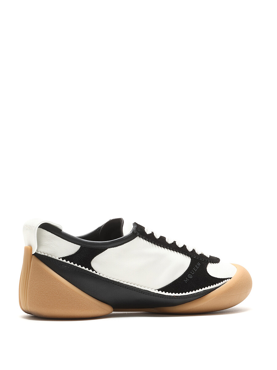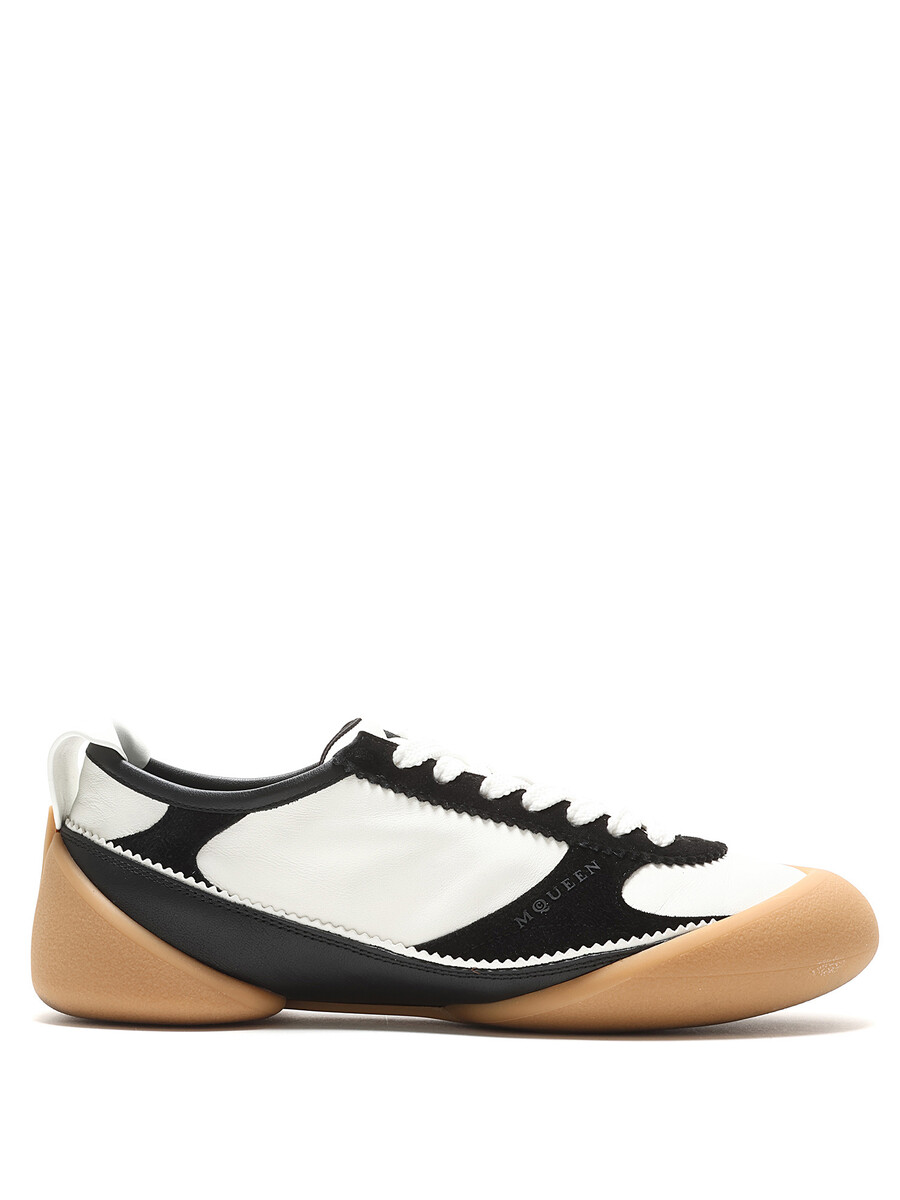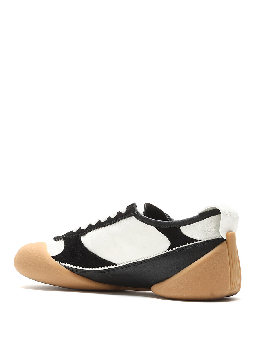 High-top leather and fabric sneakers with a bi-color design featuring a contrast sole in black, white, and tan. Round toe. Lace-up closure. Rubber sole. With box.