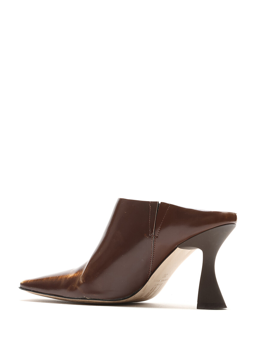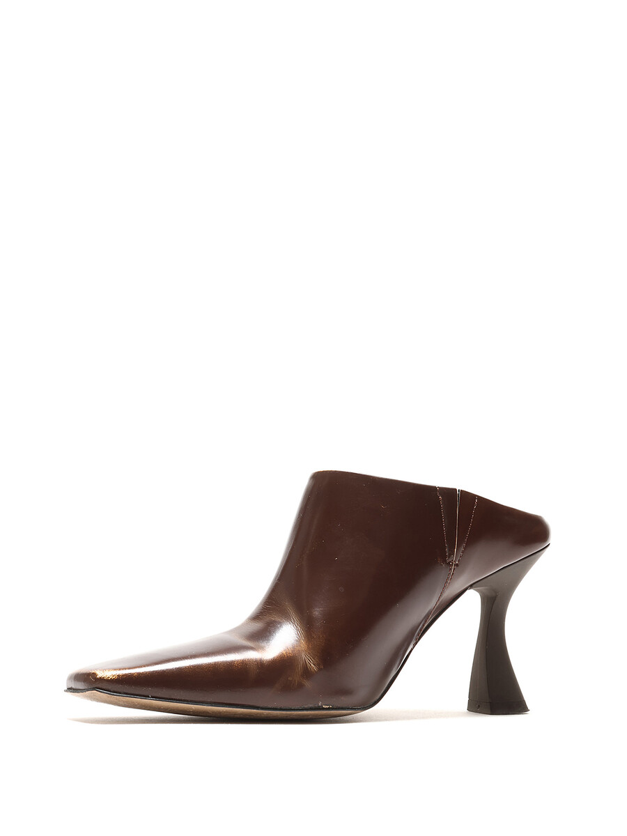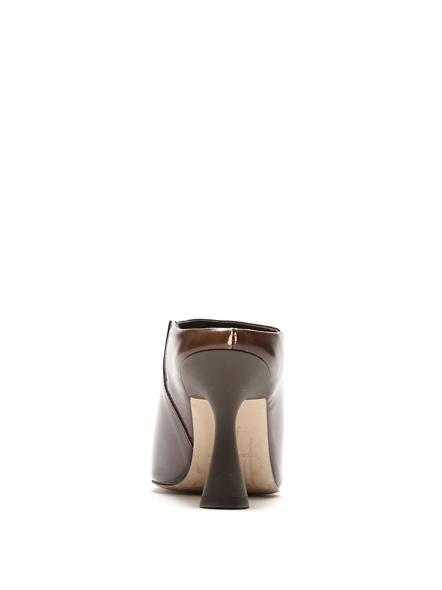 Distressed leather high-heel mules in brown. Square toe design.